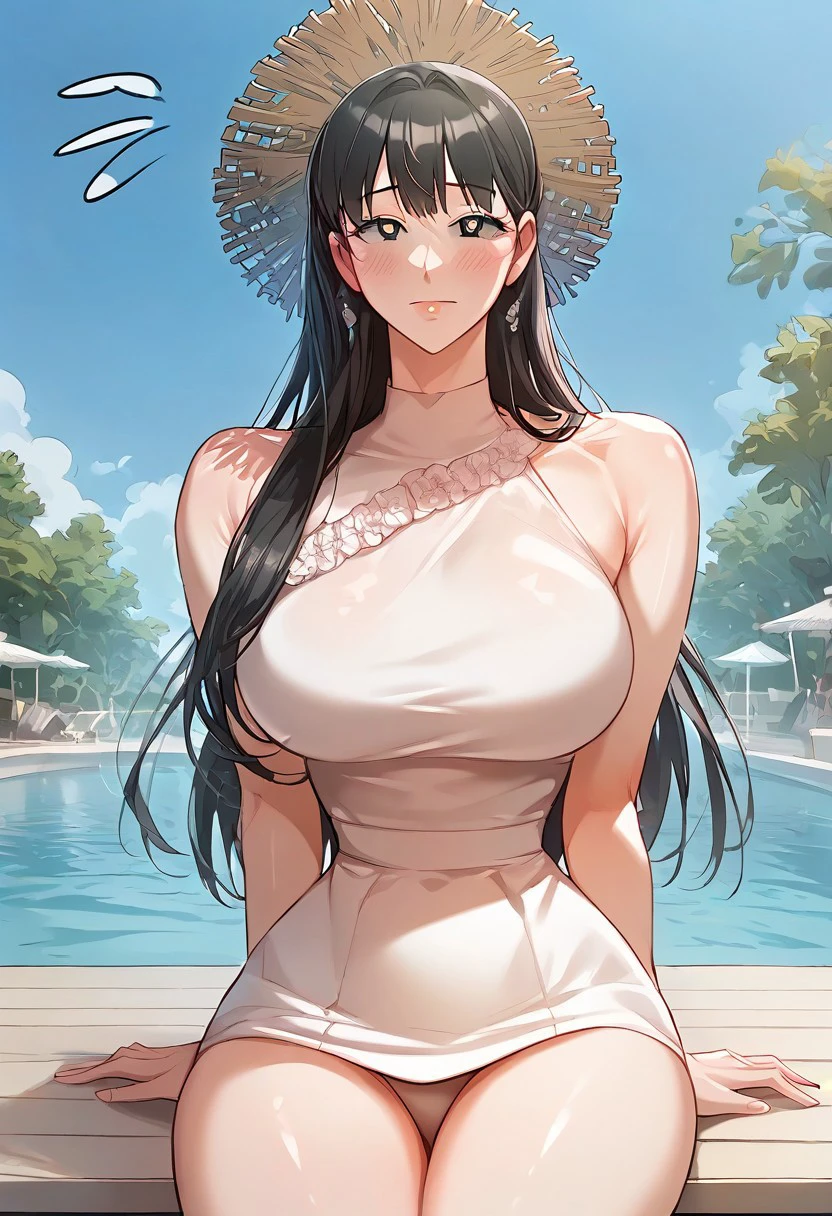 5. ((sexy and cute frilled pink and white swimwear, female straw hat, ))