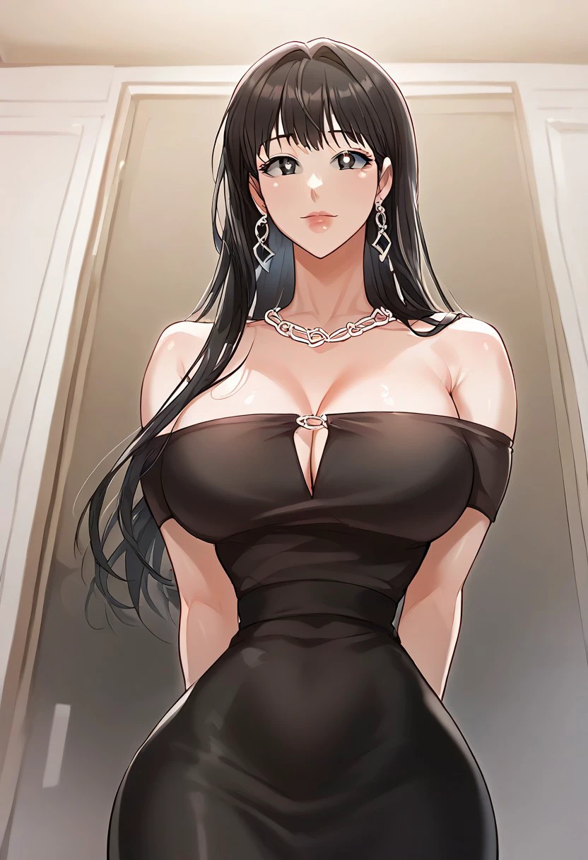 8. ((beautiful sexy cut-out short-sleeves off-shoulder black dress, obscene cleavage, huge cleavage, beautiful long silver earrings, beautiful silver necklace, ))