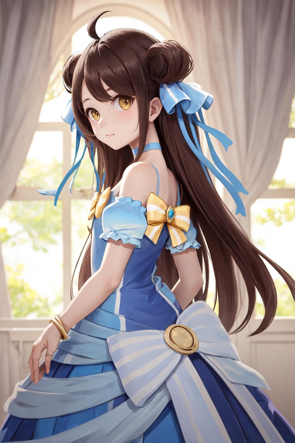 Default outfit: choker bow blue dress bare shoulders detached sleeves jewelry bracelet
