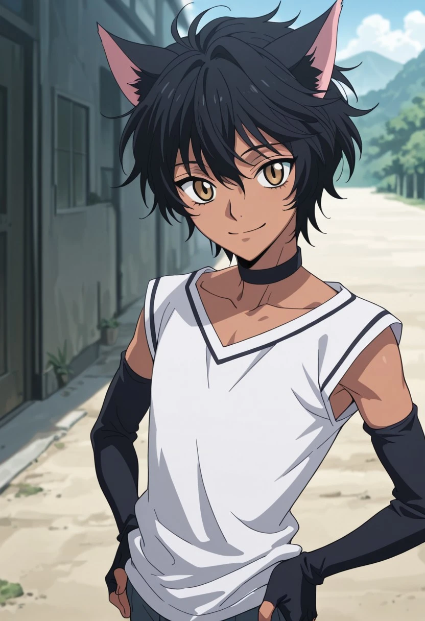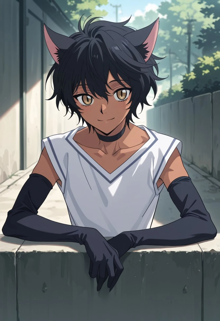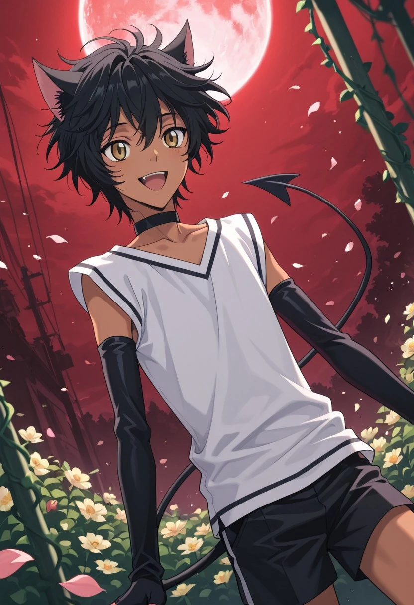 sodurabok, 1boy, male focus, solo, dark skin, dark-skinned male, yellow eyes, cat ears, black hair, black choker, collarbone, white shirt, sleeveless, elbow gloves, fingerless gloves, black shorts, demon tail, boots,