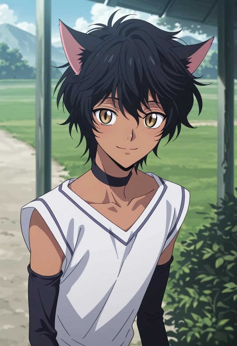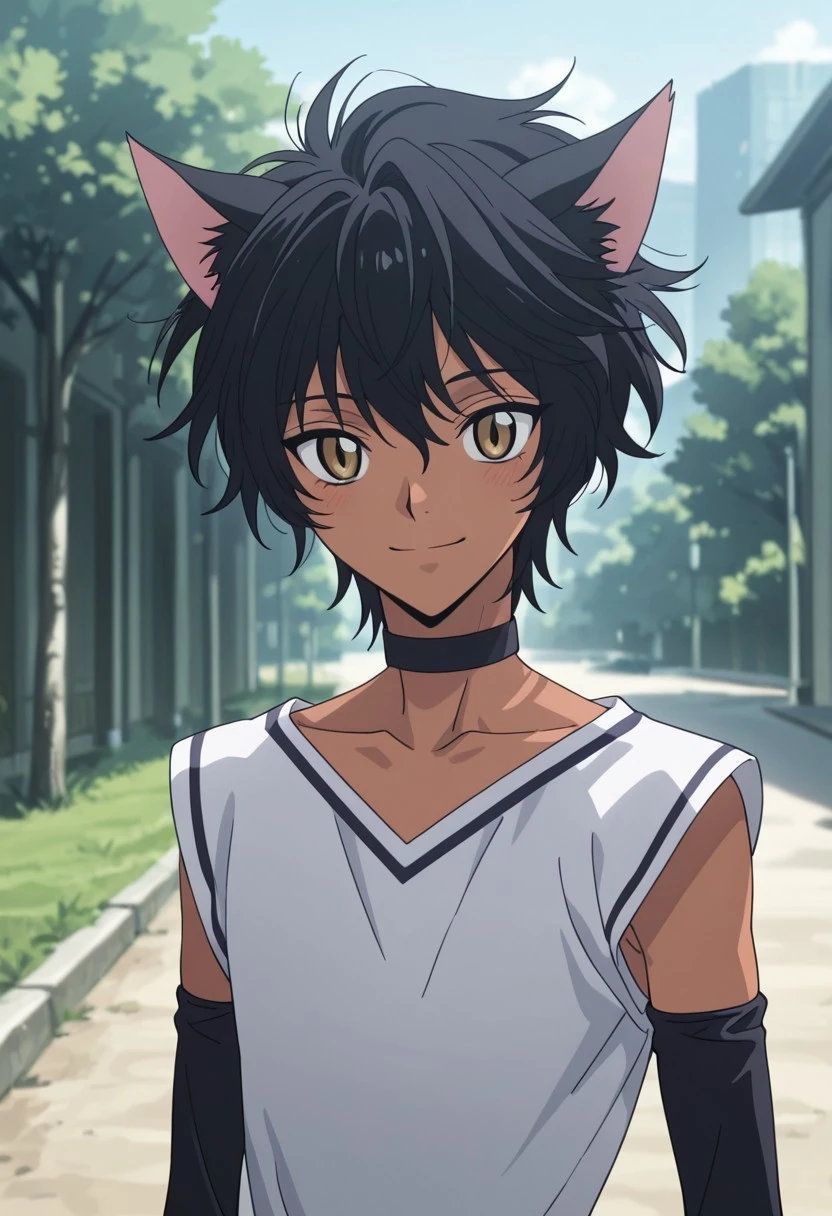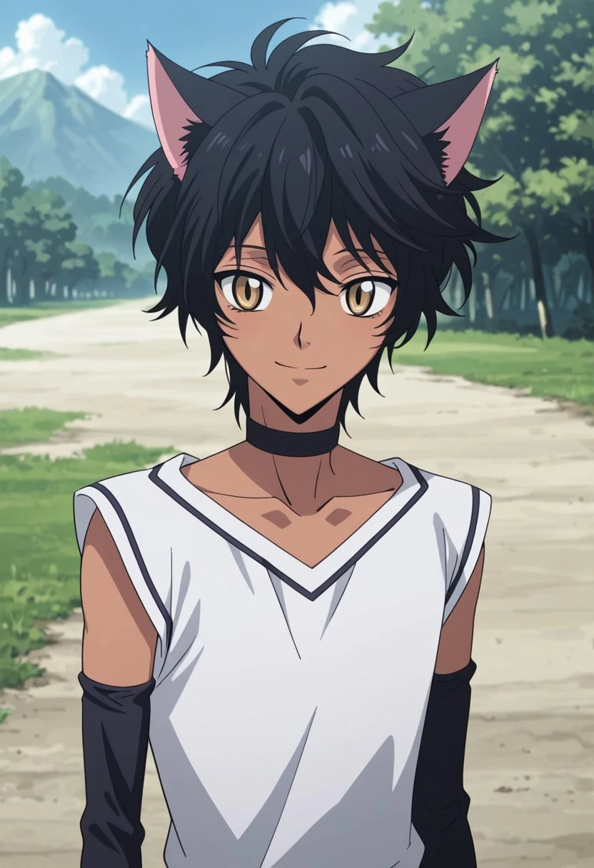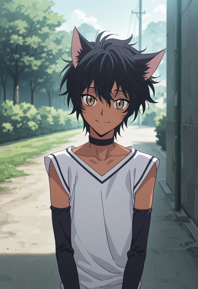 sodurabok, 1boy, male focus, solo, dark skin, dark-skinned male, yellow eyes, cat ears, black hair, black choker, collarbone, white shirt, sleeveless, elbow gloves, fingerless gloves, black shorts, demon tail, boots,