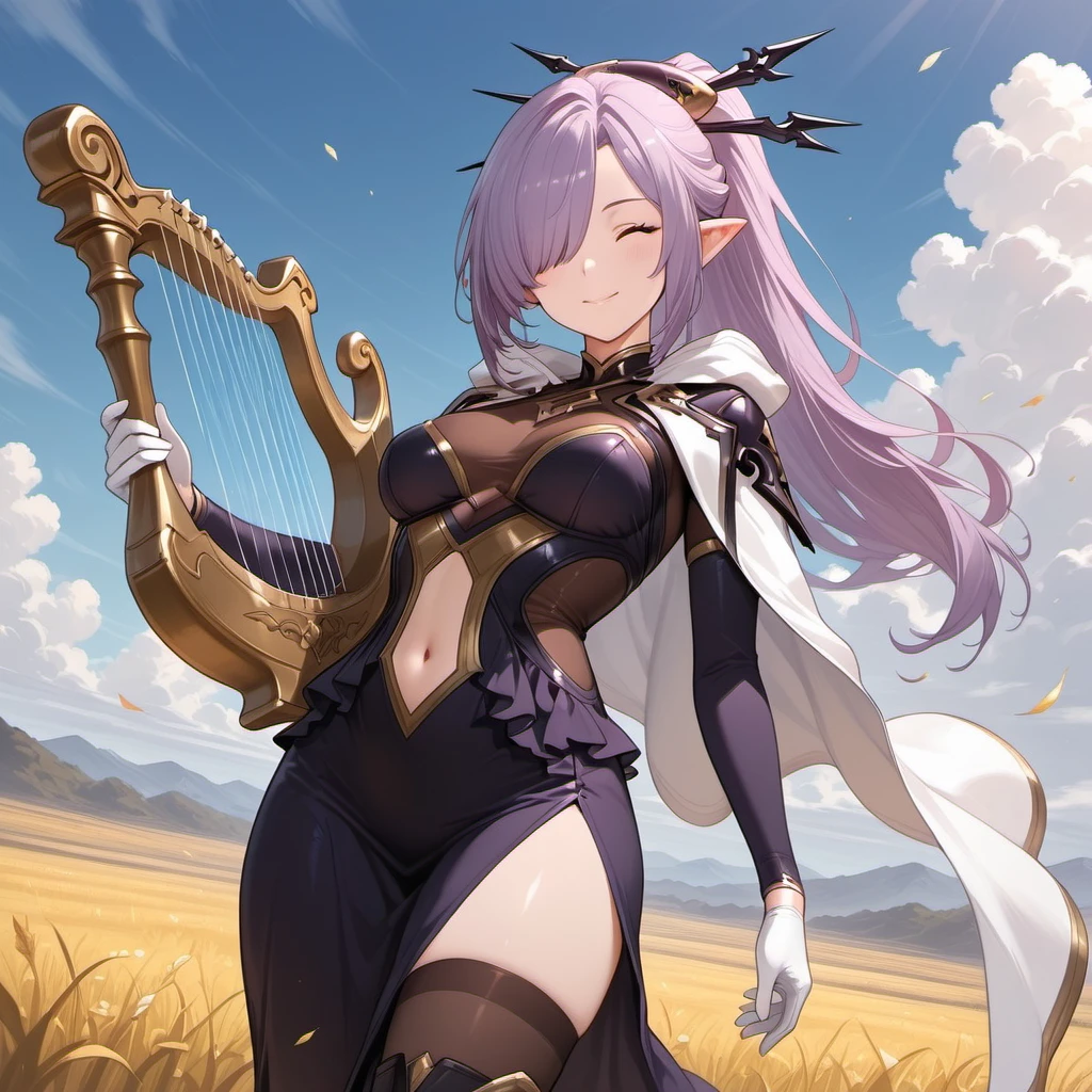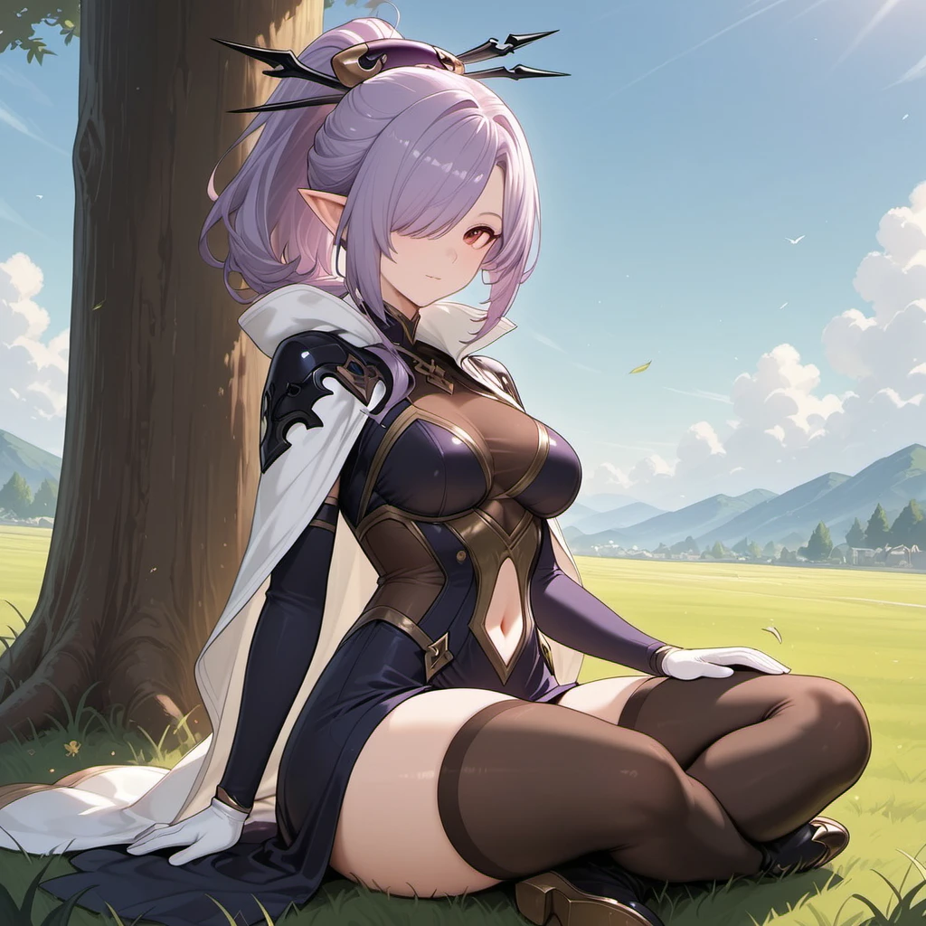 hair over one eye, long hair, purple hair, ponytail, pointed ears, red eyes, medium breasts,