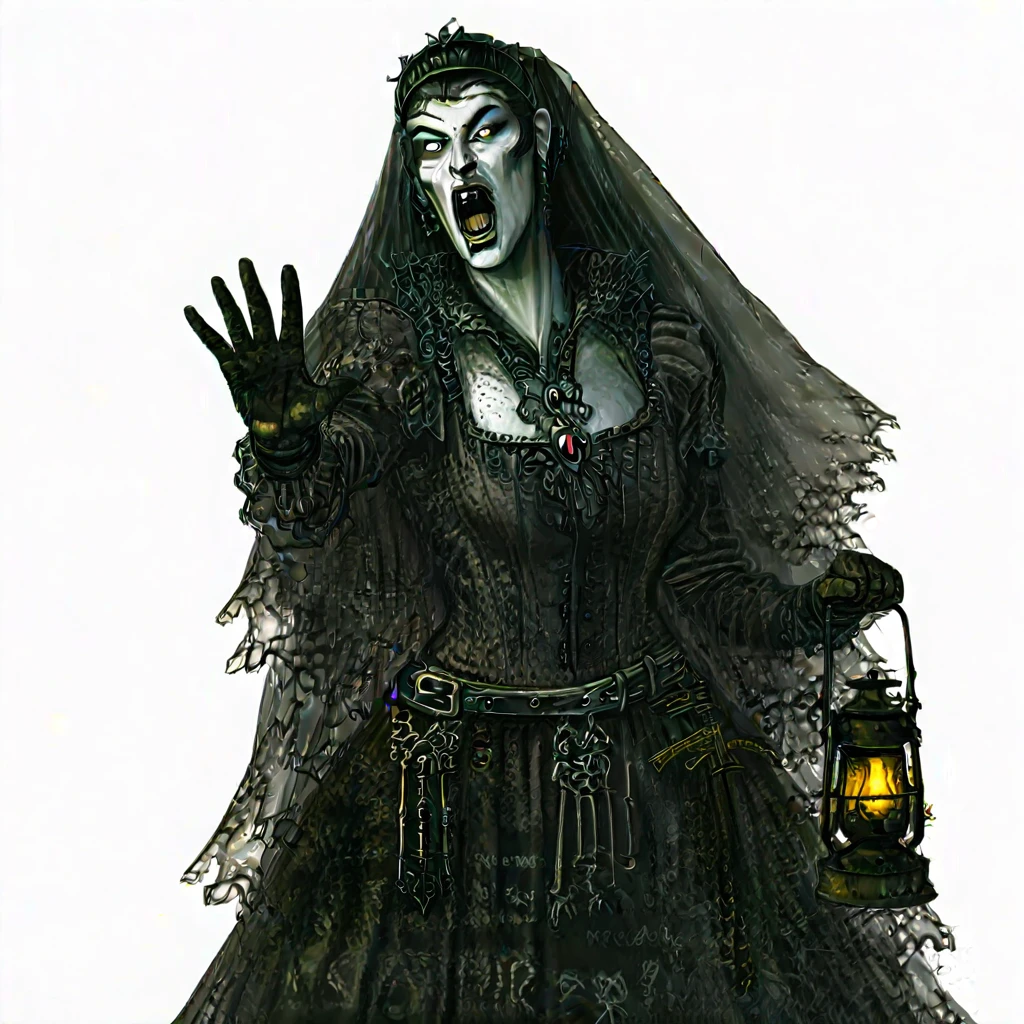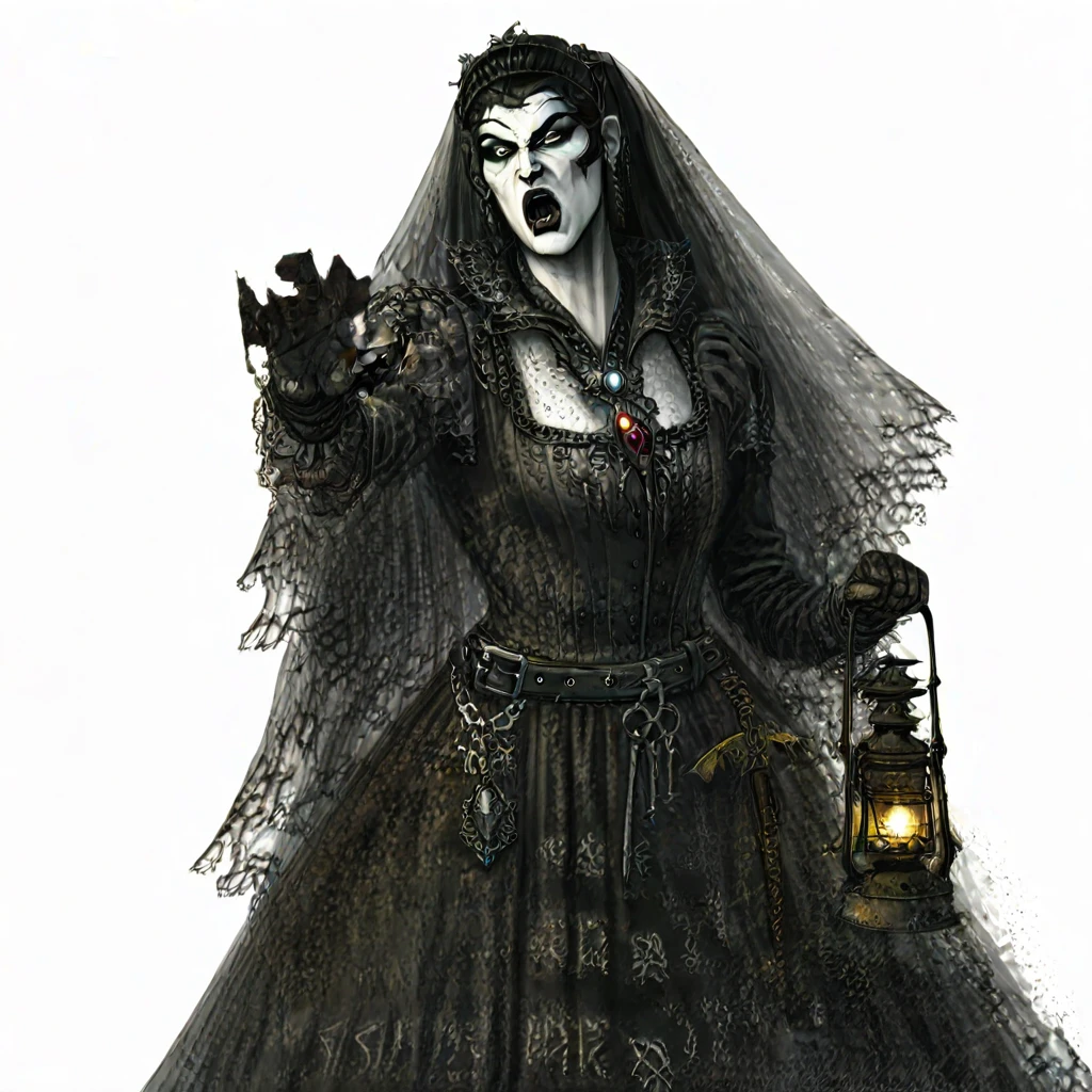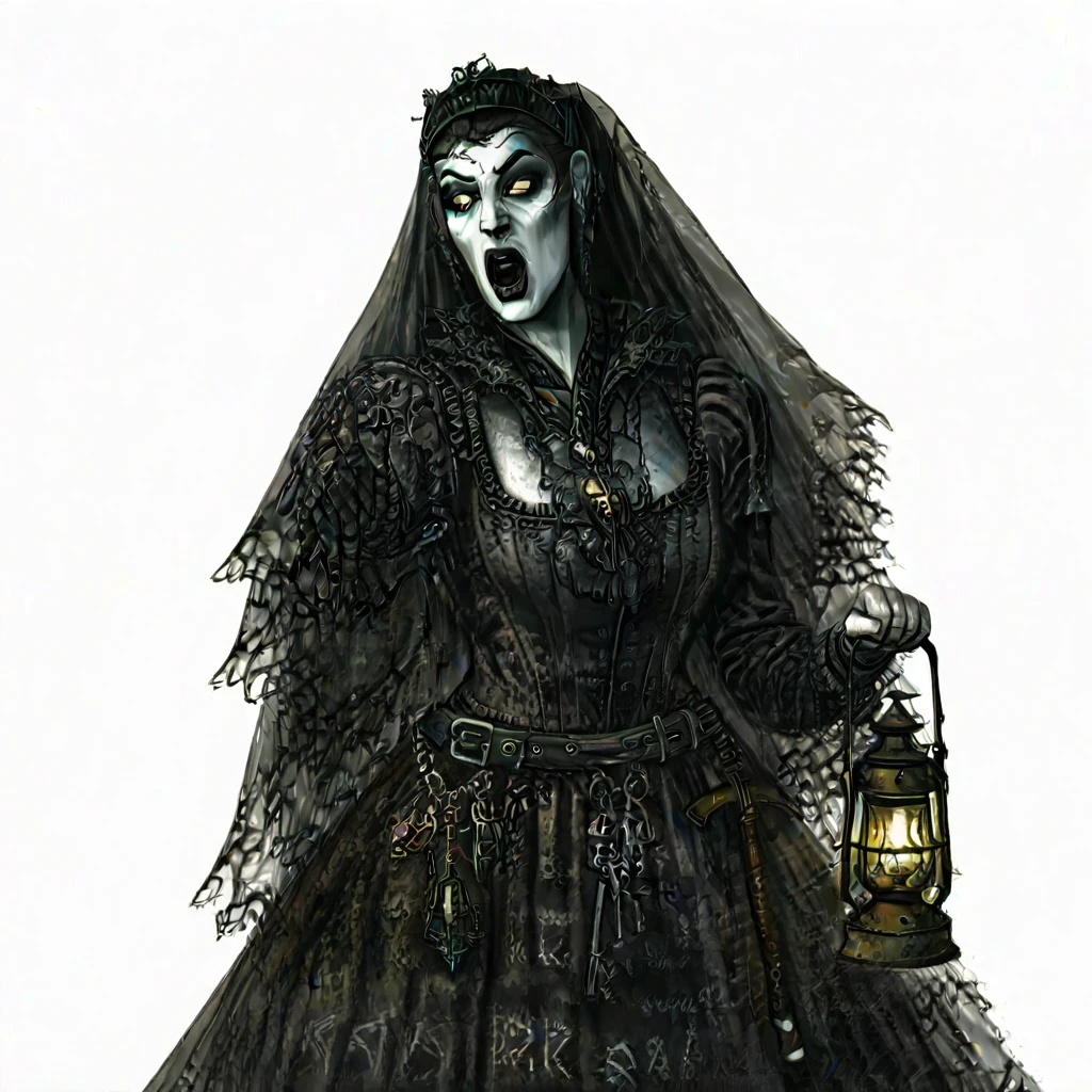 1girl, solo, nordic mine spirit woman, pale skin, gray victorian dress with rune motifs, belt with keys and pickaxe, mining lantern