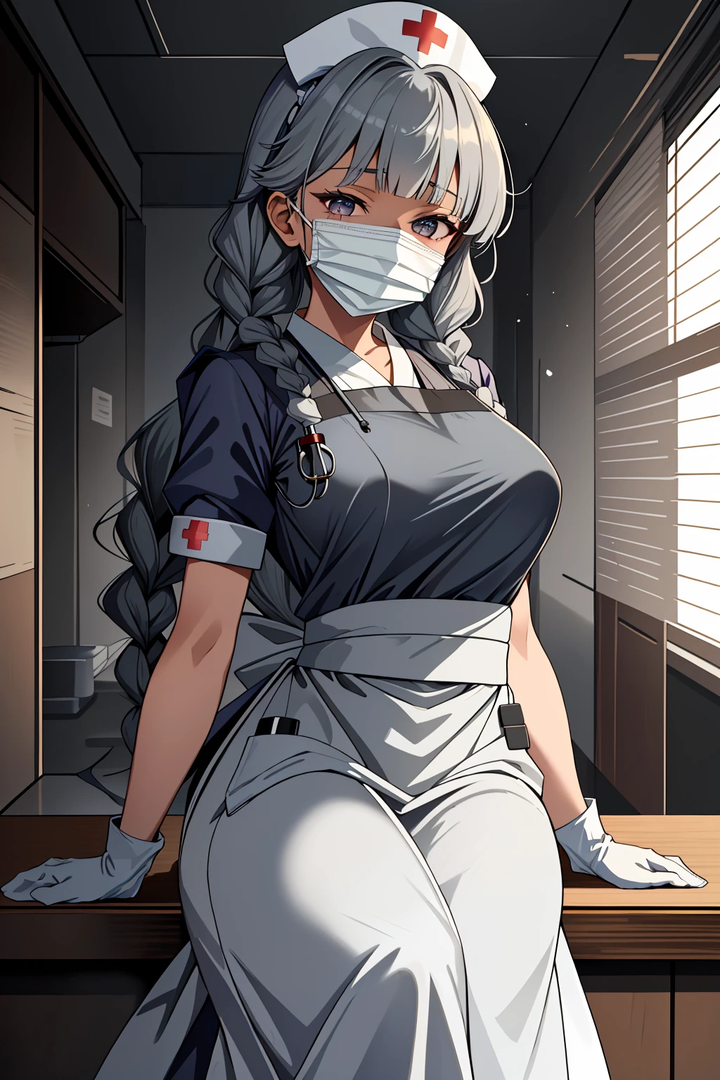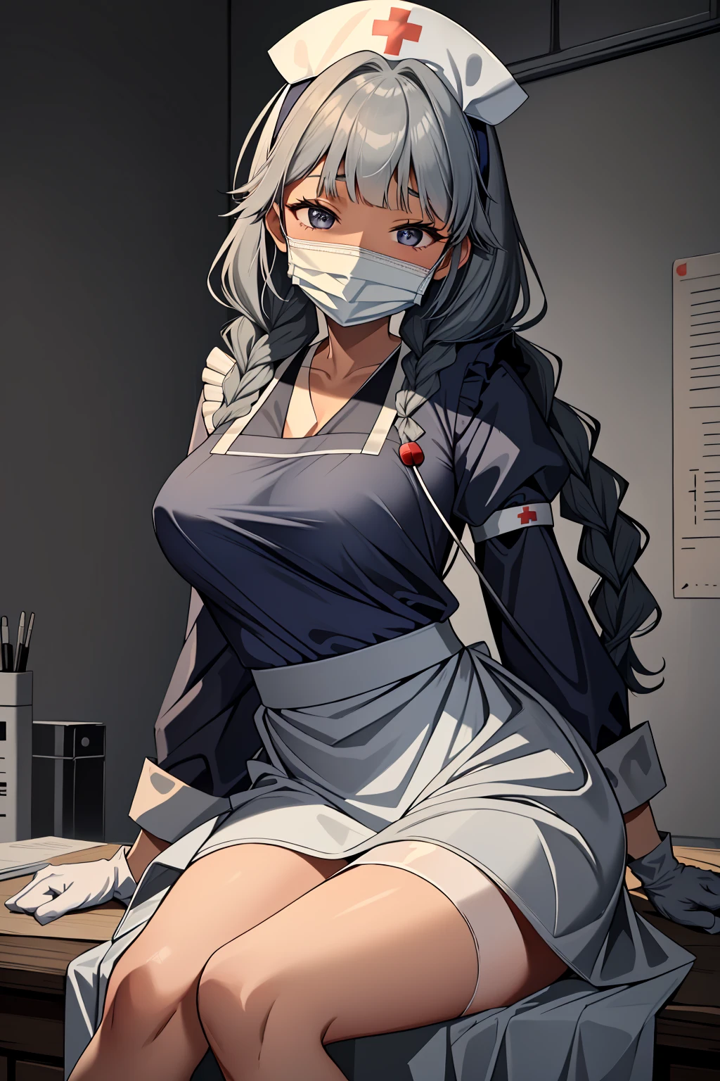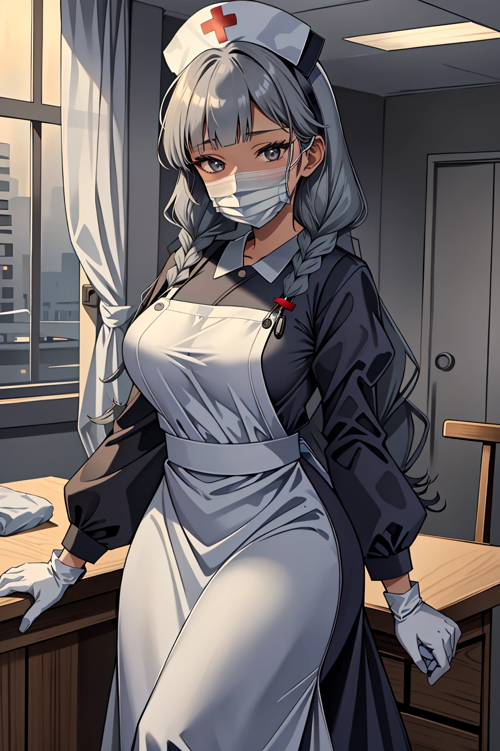 1girl, 3dcg 04, bangs, blunt bangs, dark skin, dark-skinned female, fumiko kubo, grey eyes, grey hair, medium breasts, side braids, sidelocks, solo, twin braids, very long hair