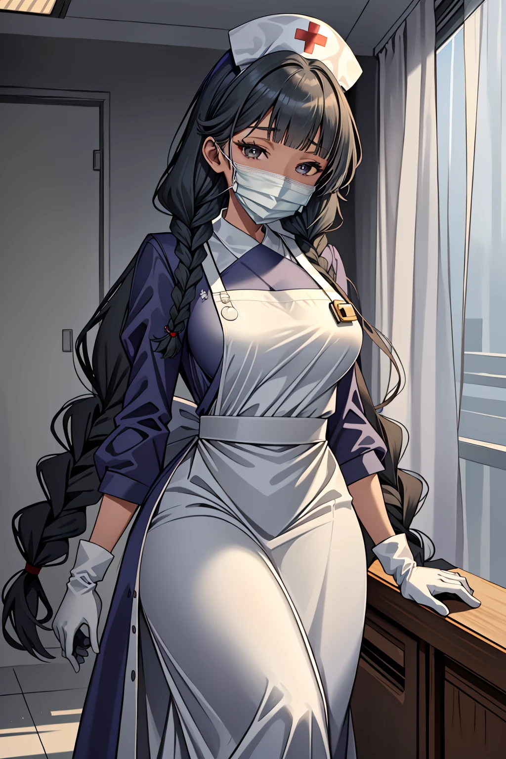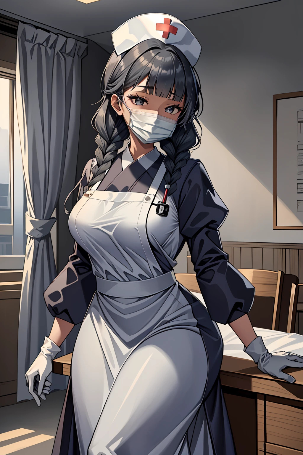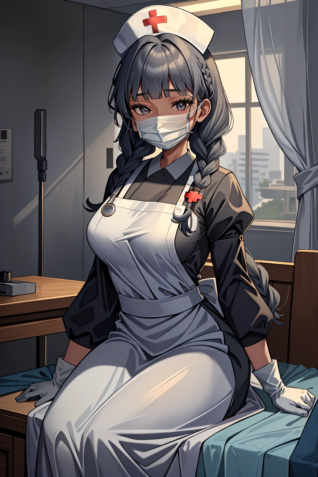 1girl, 3dcg 04, bangs, blunt bangs, dark skin, dark-skinned female, fumiko kubo, grey eyes, grey hair, medium breasts, side braids, sidelocks, solo, twin braids, very long hair
