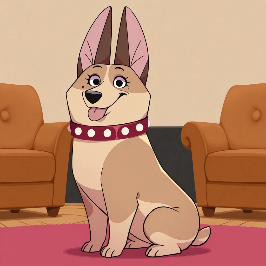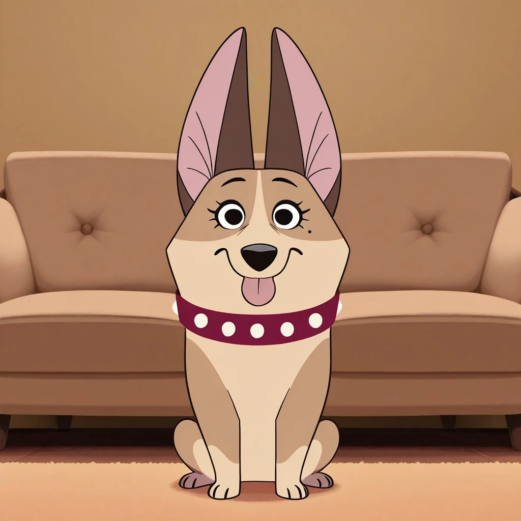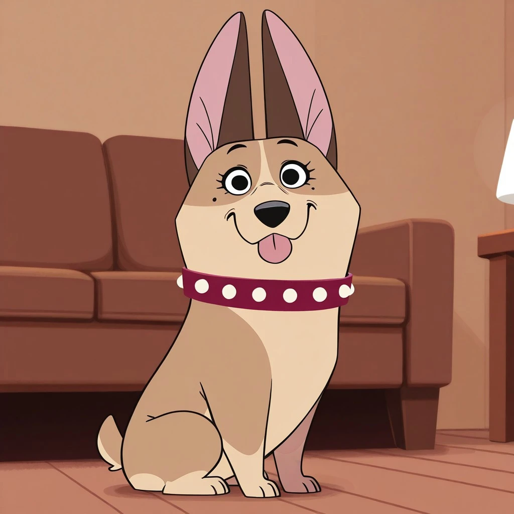dog, Welsh Corgi, tan fur, brown ears, black eyes, mole under eye, black nose, short tail, red collar,
