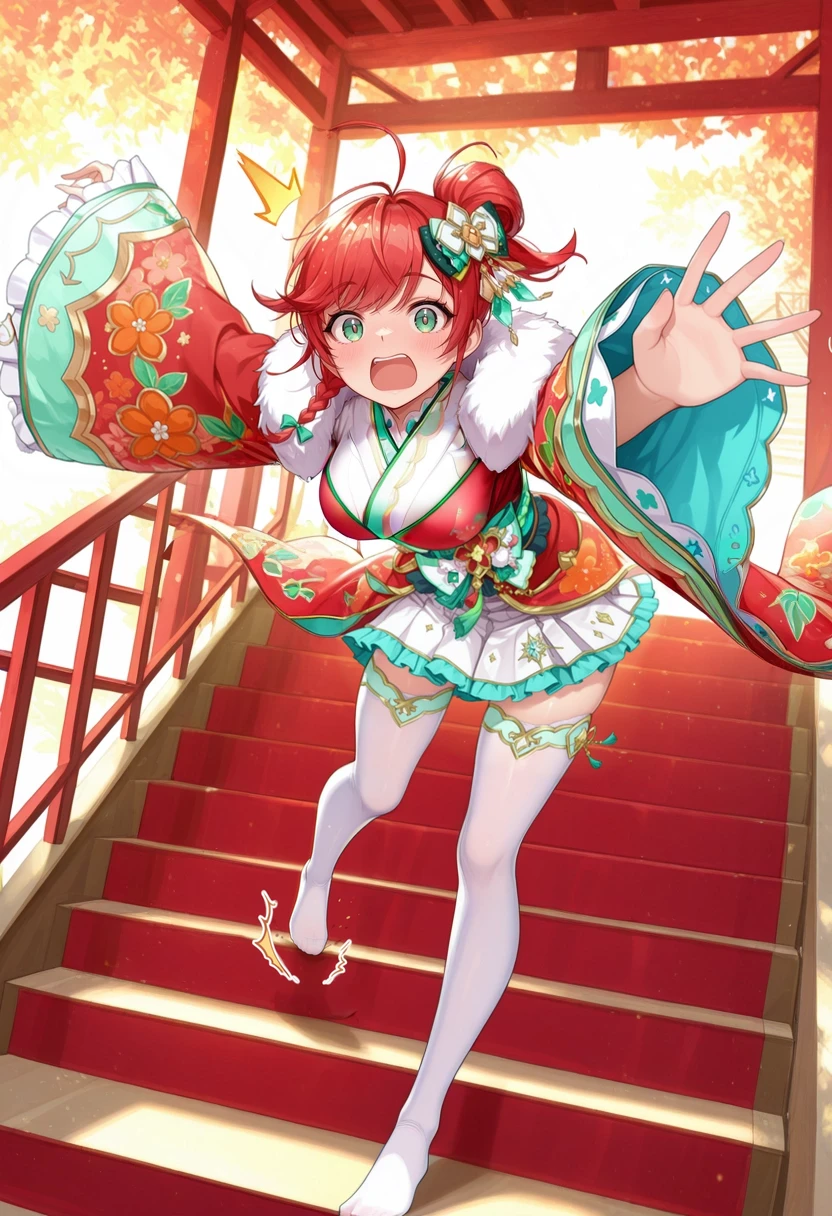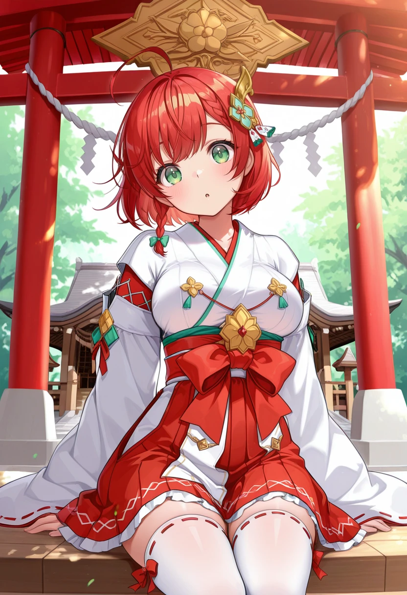 miko,white thighhighs,ribbon-trimmed thighhighs,side braid,Description