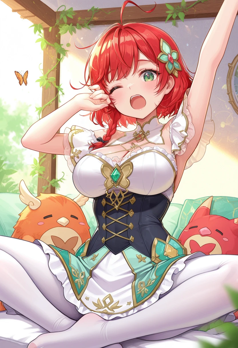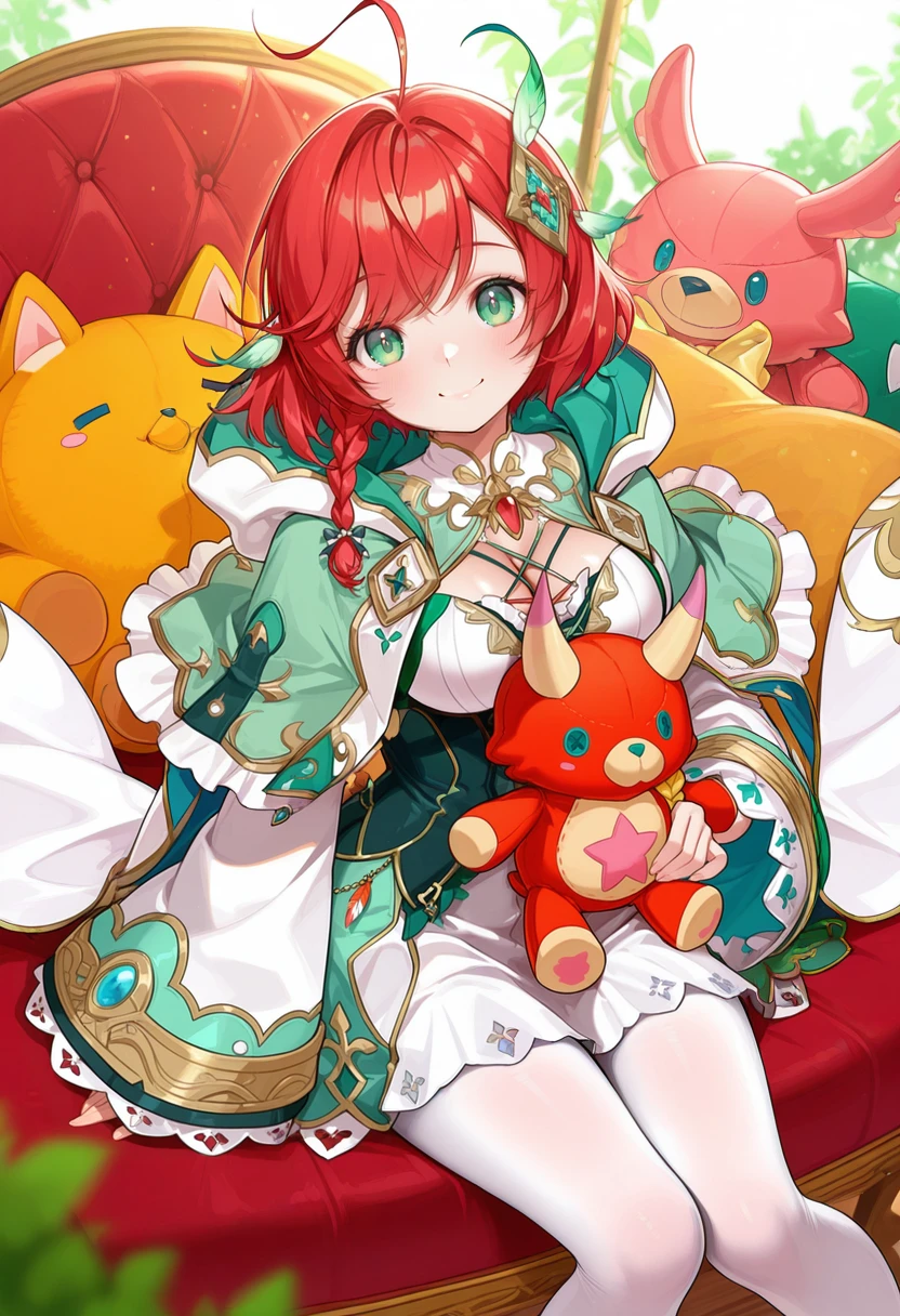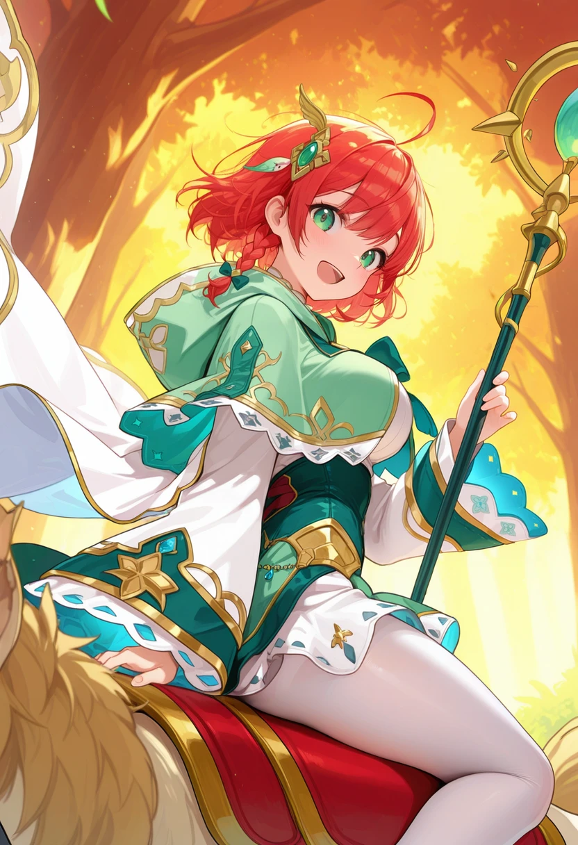 side braid,white pantyhose,hooded capelet,white cape,green capelet,hood down,wide sleeves,New Year: