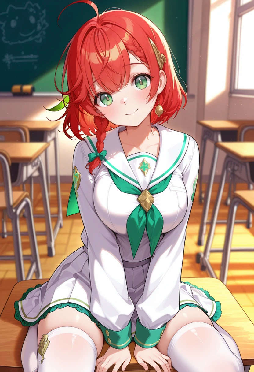 white serafuku,green trim,white thighhighs,head tilt,side braid,Miko: