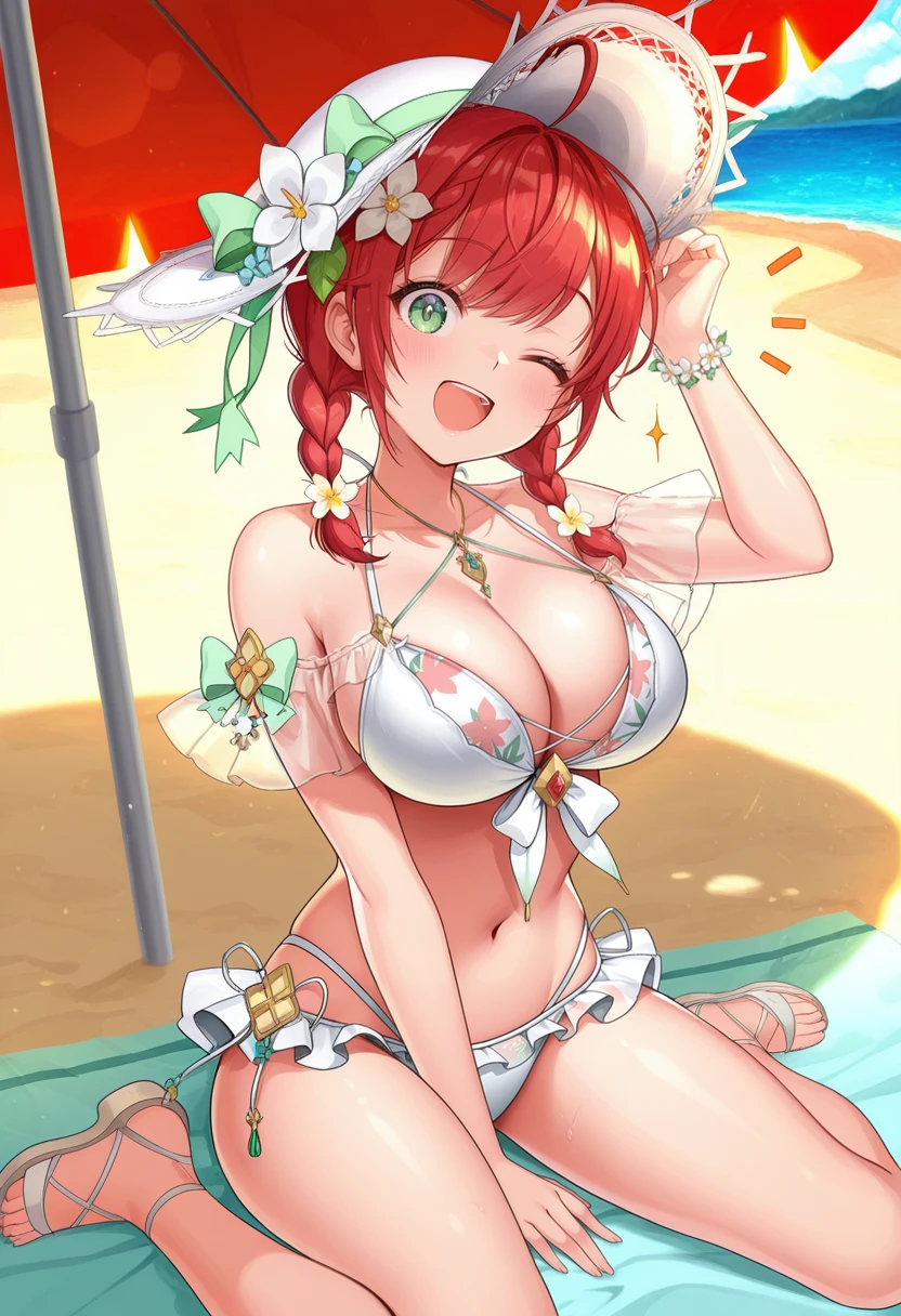 twin braids,white headwear,white bikini,hair flower,see-through,thigh strap,(The following 2 are alternate costume)