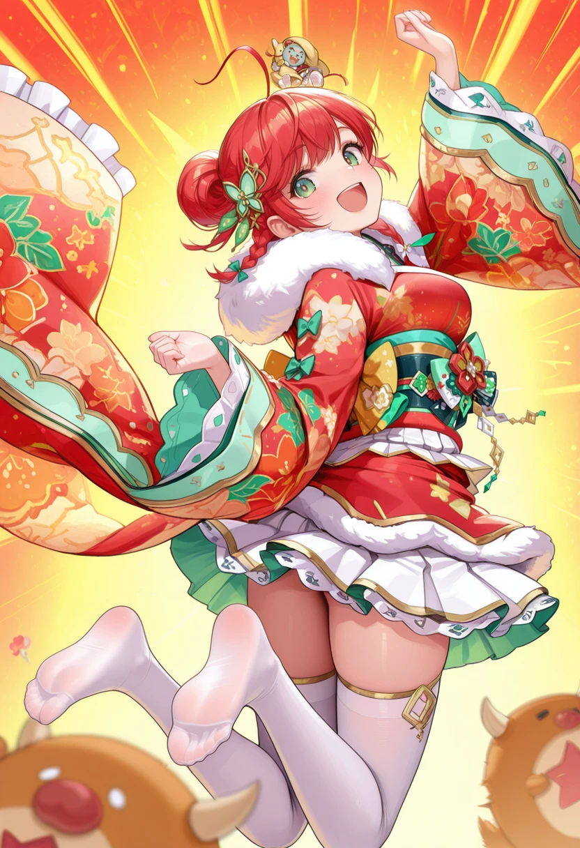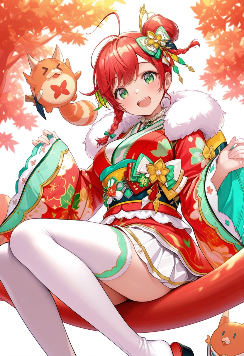 side braid,hair bun,kimono,white thighhighs,fur trim,wide sleeves,white skirt,