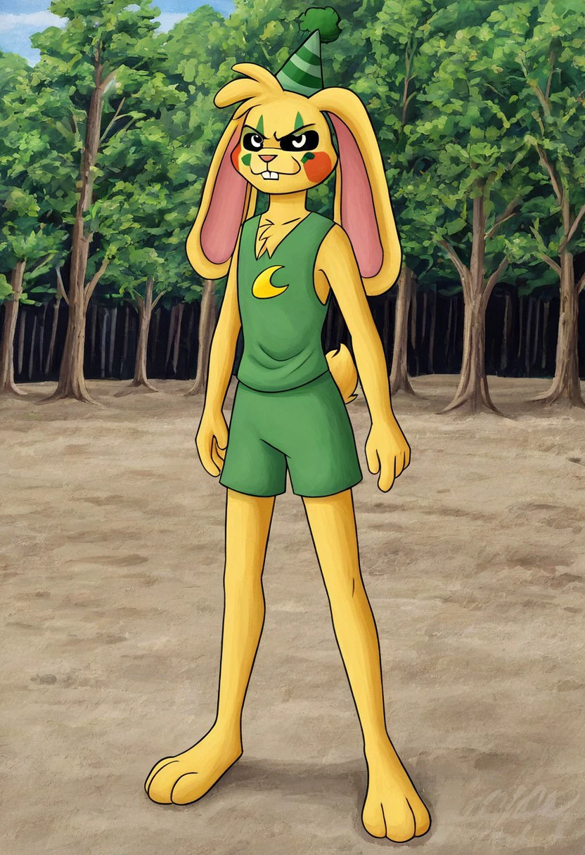 "Bonzo[PoppyPlaytime], rabbit, bunny, yellow body, yellow fur, clown like makeup, black sclera, white pupils, long ears, buck teeth, (Male Anthro Rabbit:1.5)"