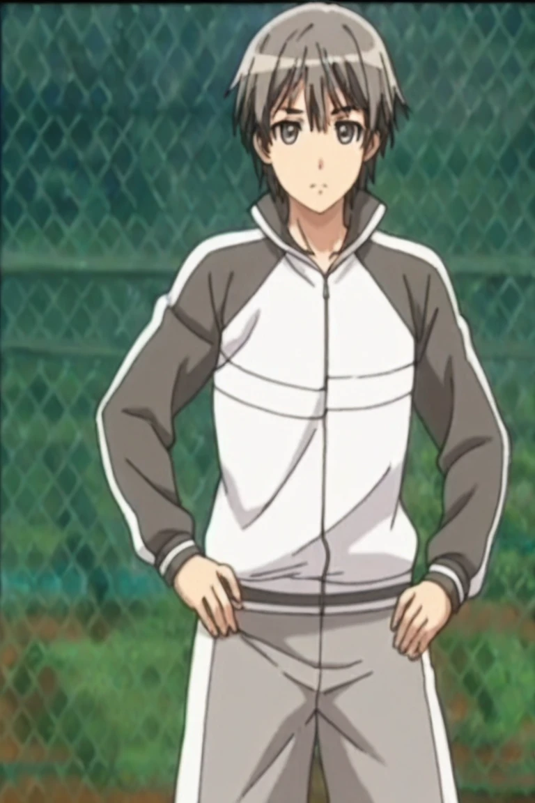 Shuuichi Sugiyama, gray hair, gray eyes, white tennis track jacket uniform, gray raglan sleeves, gray shorts with white accents