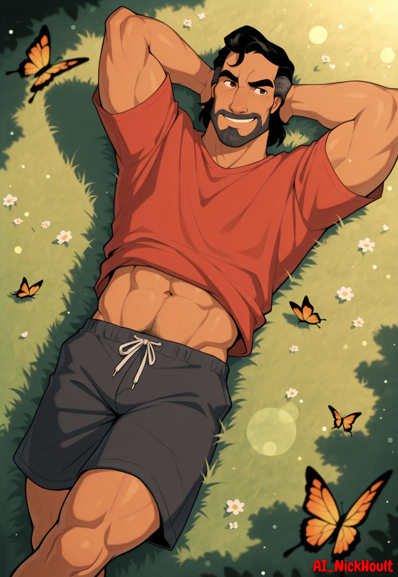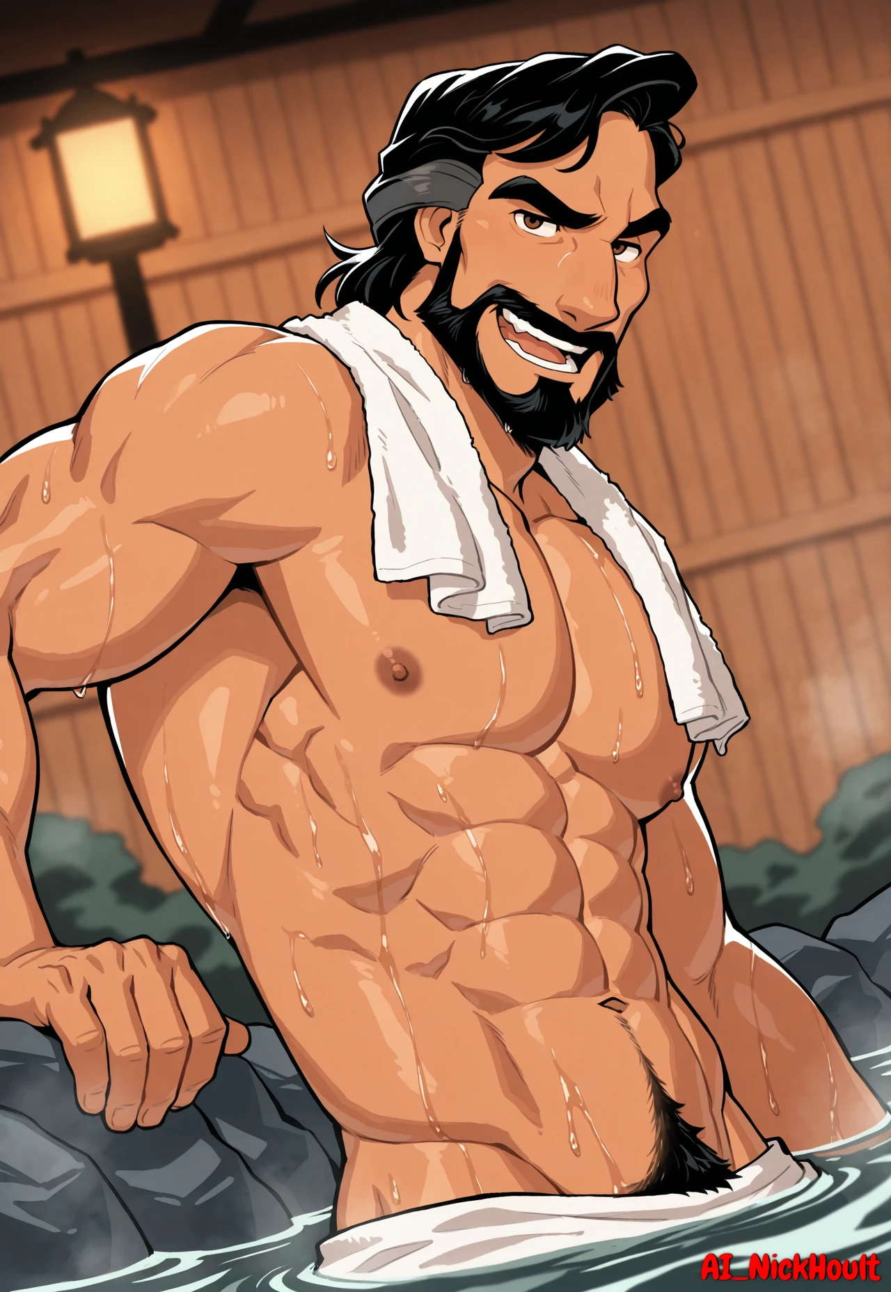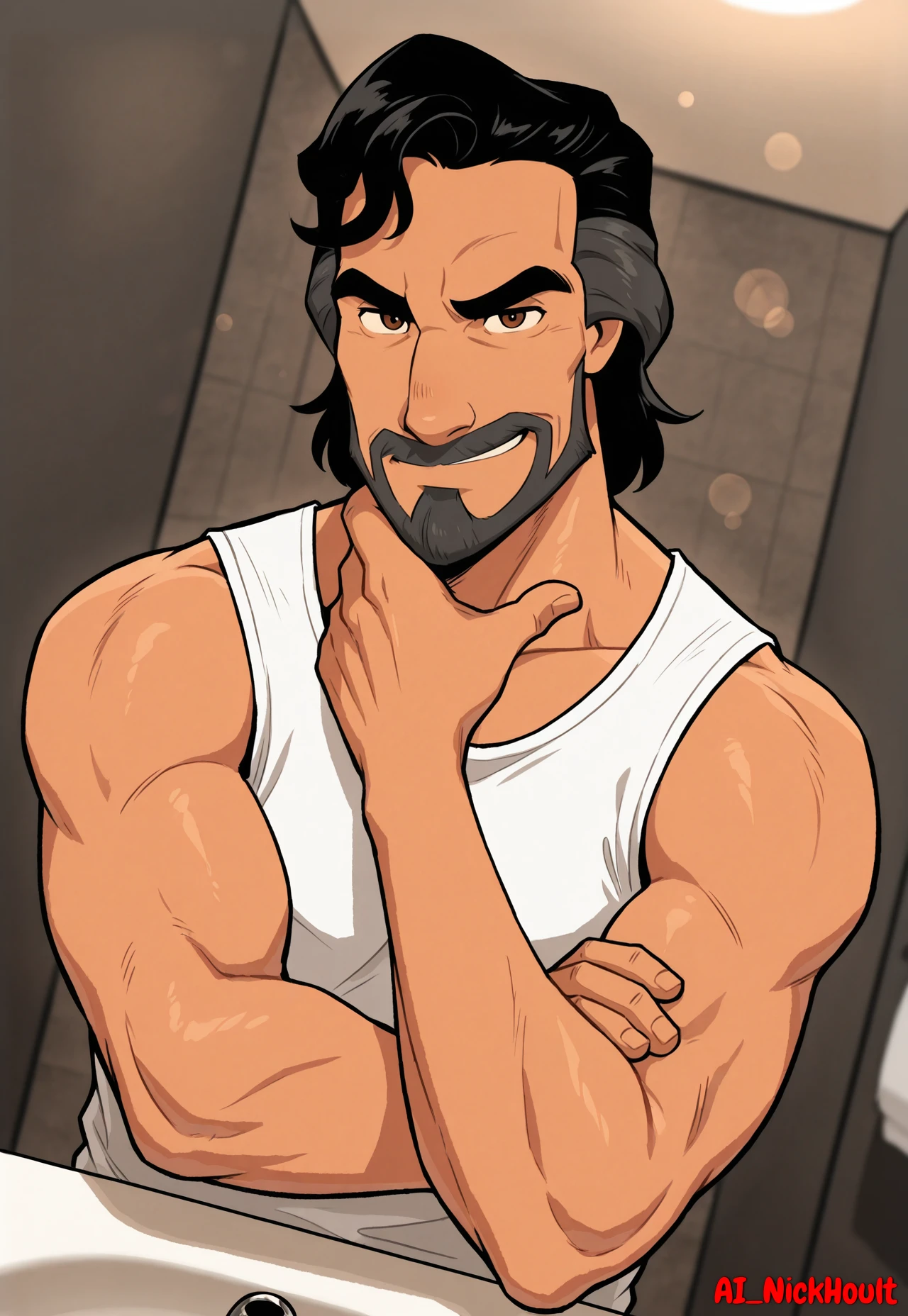 Cassim, mature man, tan skin, thick eyebrows, black hair, Short hair, slicked back hair, Grey sides, brown eyes, facial hair,