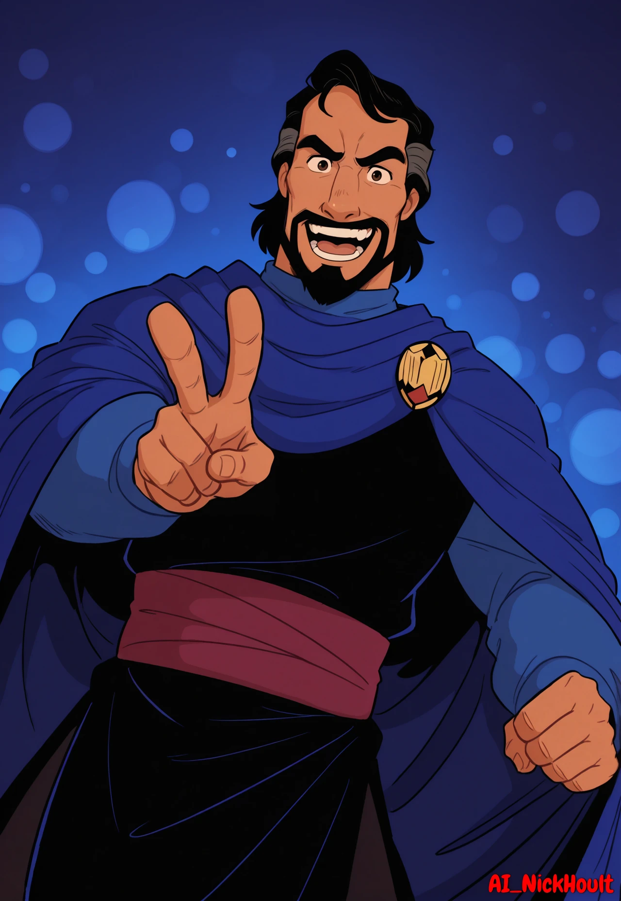 Royal blue cloak, black tunic, blue Baggy turtleneck under tunic, maroon sash, black baggy pants,