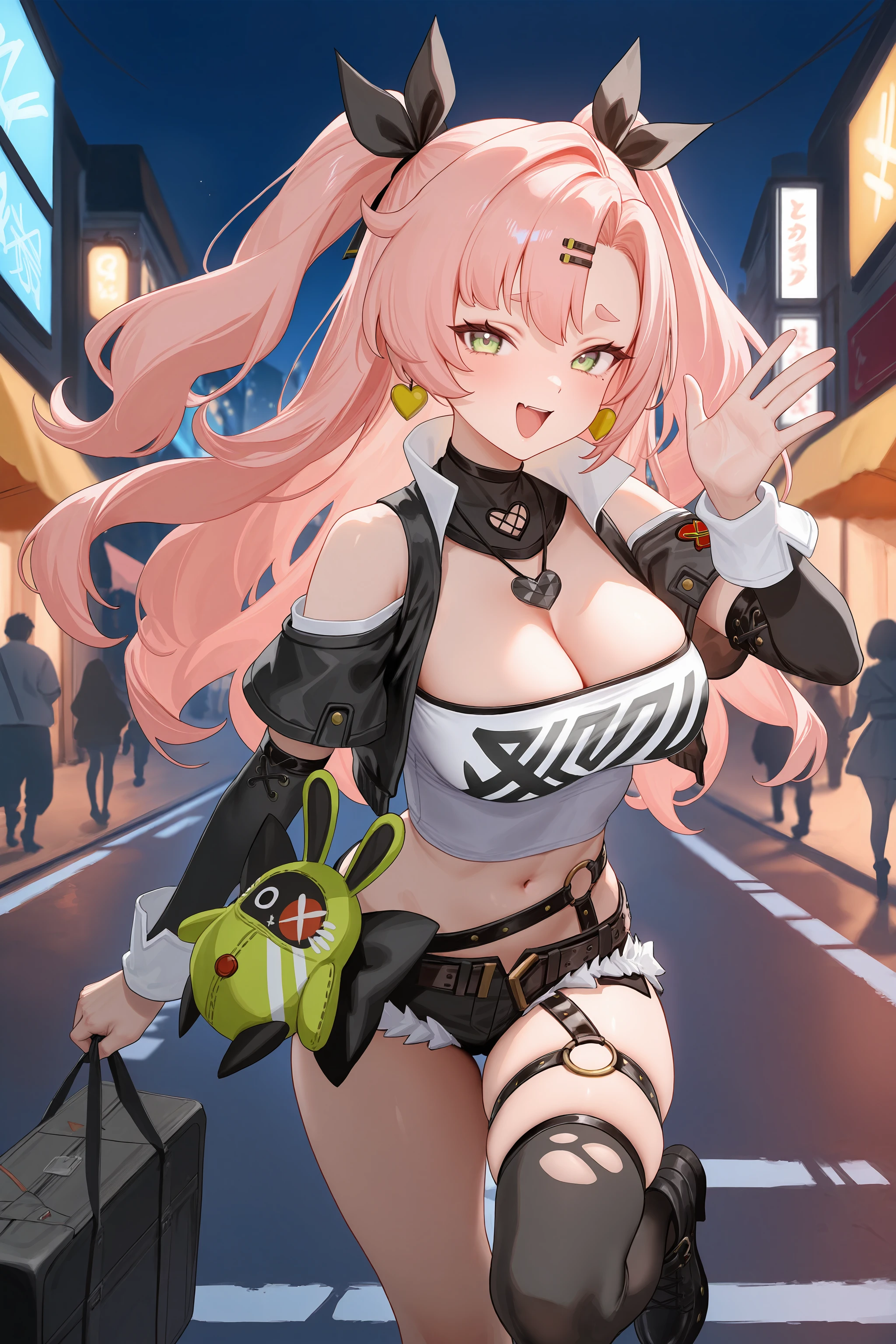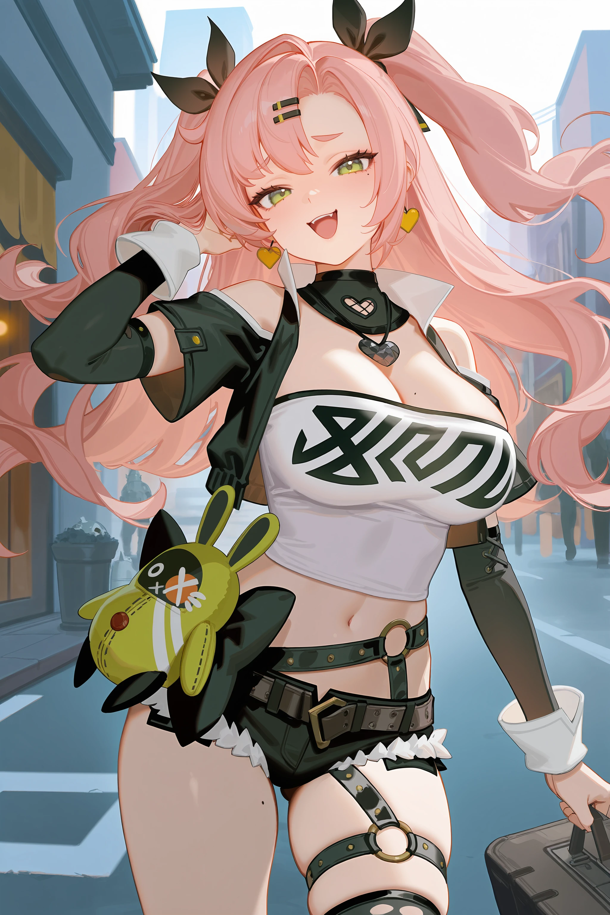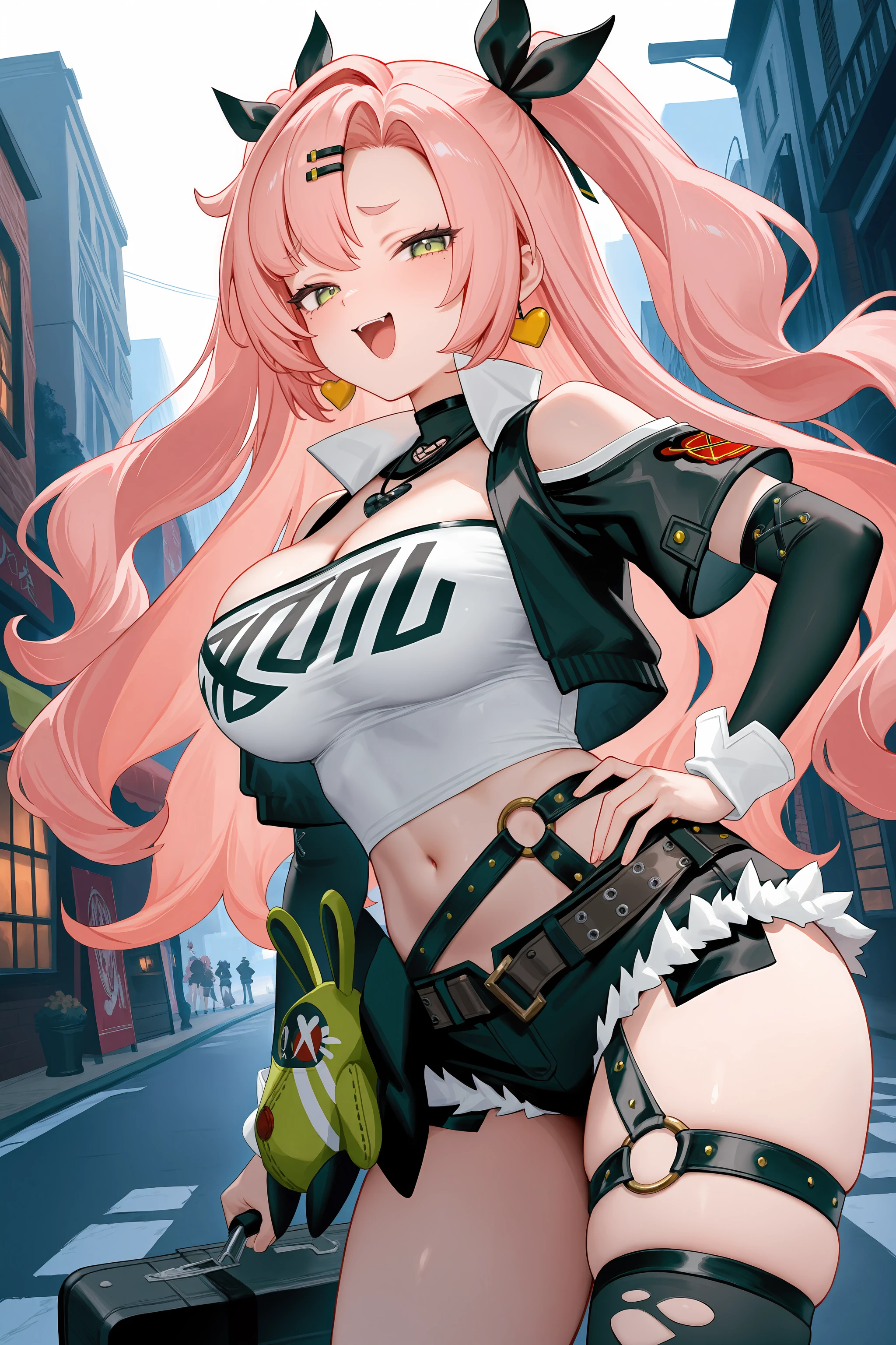 Version 1: Additional prompts for her default costume, add/remove as you needed: hair ribbon, hairclip, earrings, black collar, tube top, single thighhigh, short shorts, cropped jacket, belt boots, single sock, belt, thigh strap, detached sleeves, doll