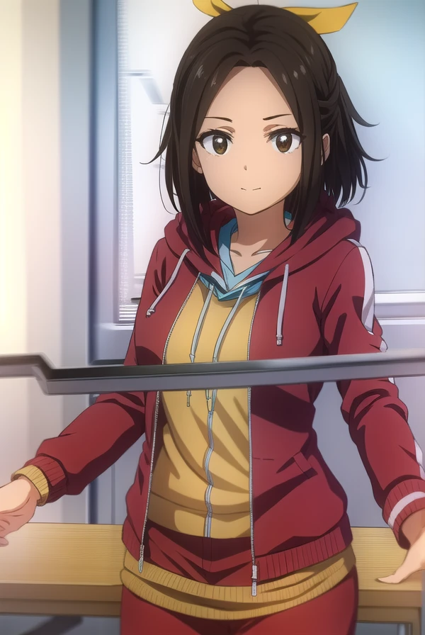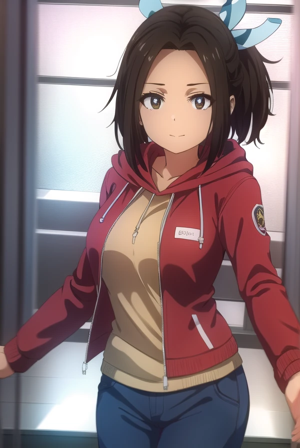 hikari hazakura, black hair, (brown eyes:1.3), hair ribbon, dark skin, dark-skinned female,