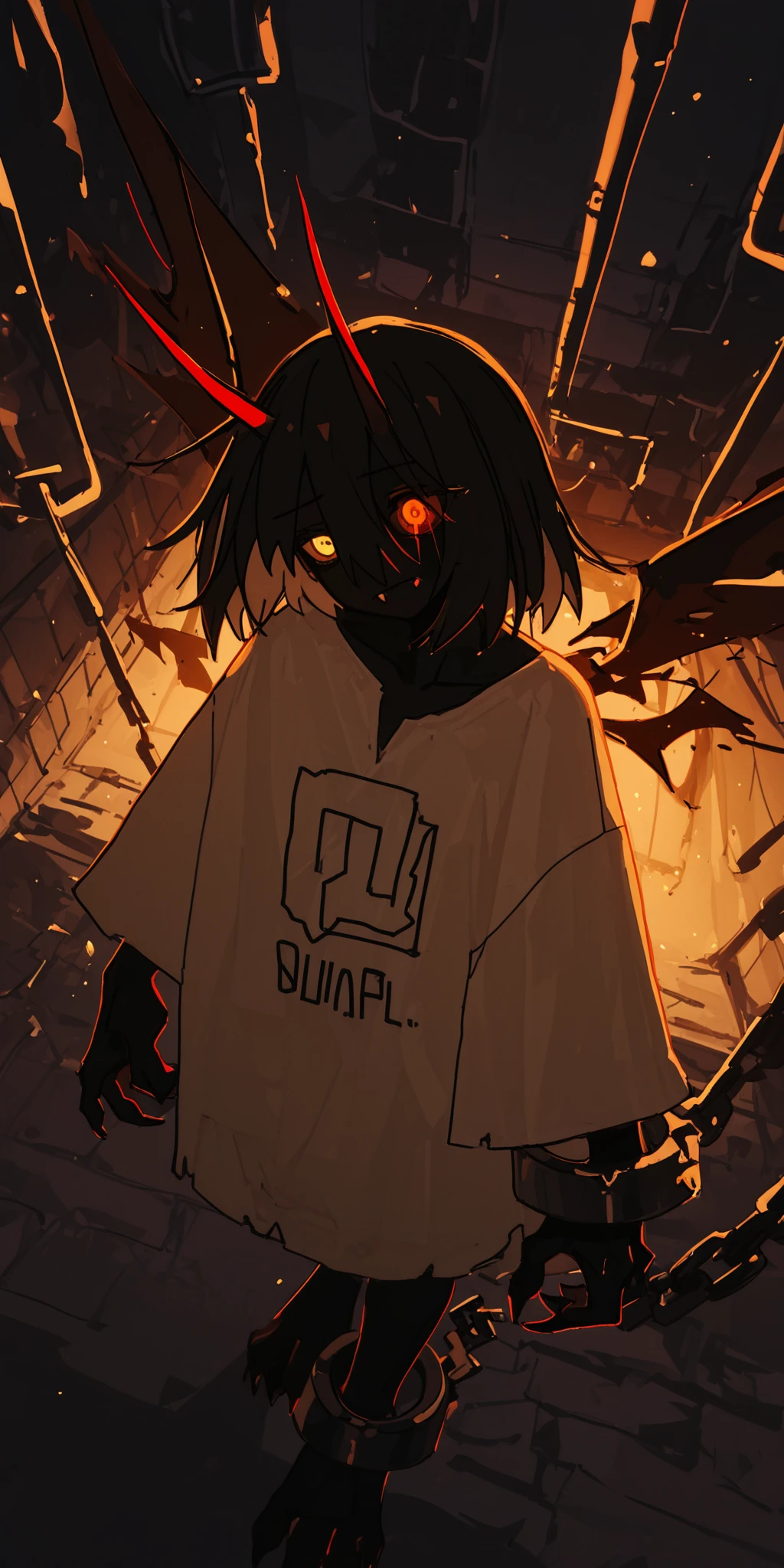 , wings, glowing, glowing eyes, claws, glowing eye, fusion, ((corruption)), colored skin, horns, fangs out, black skin, shirt, collarbone, white shirt, short sleeves, wide sleeves, chain, shackles, oversized shirt,