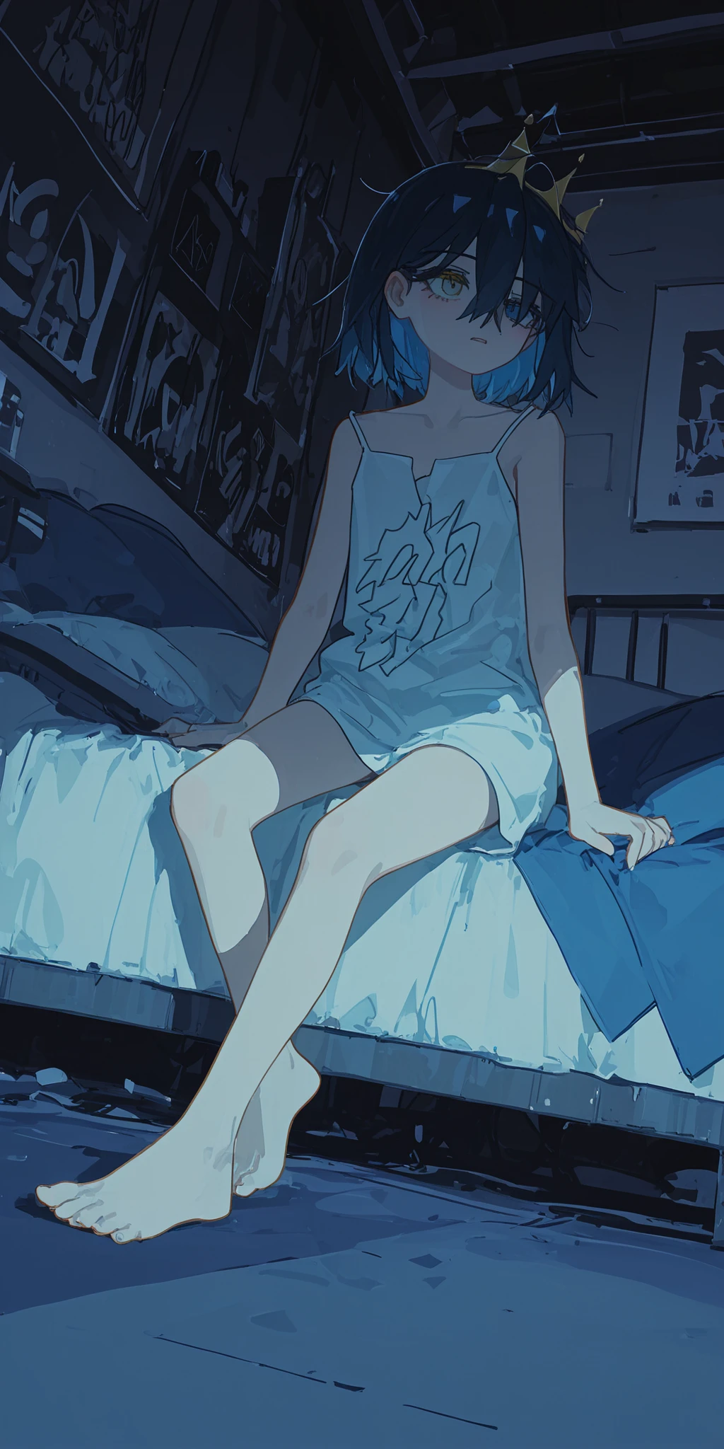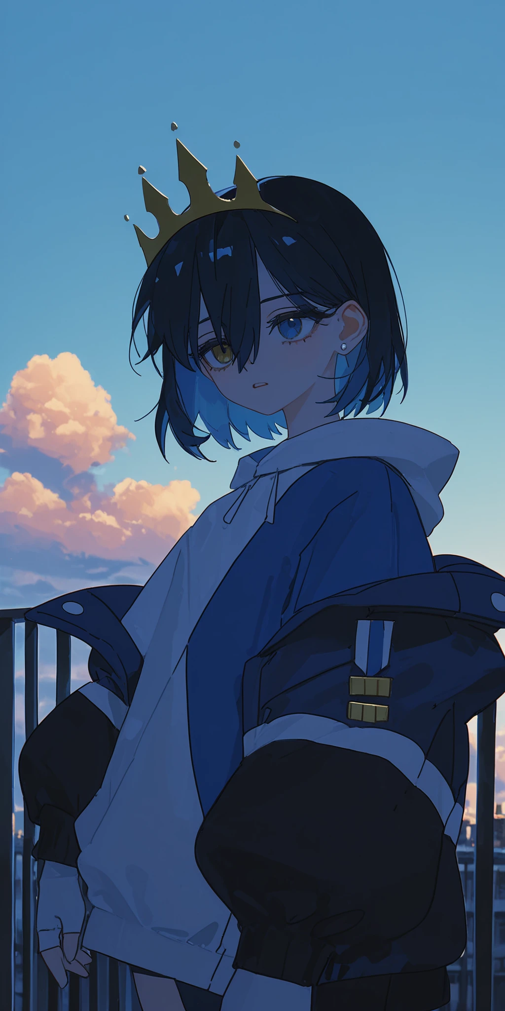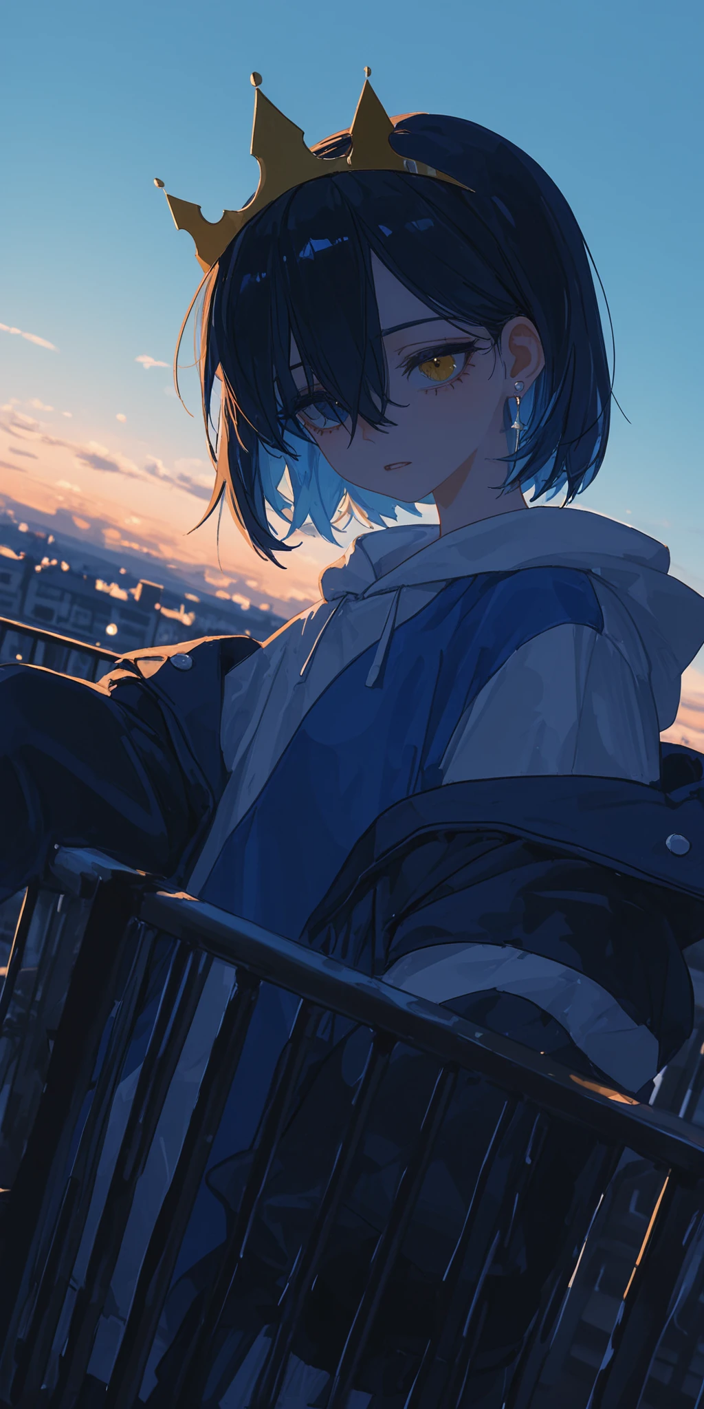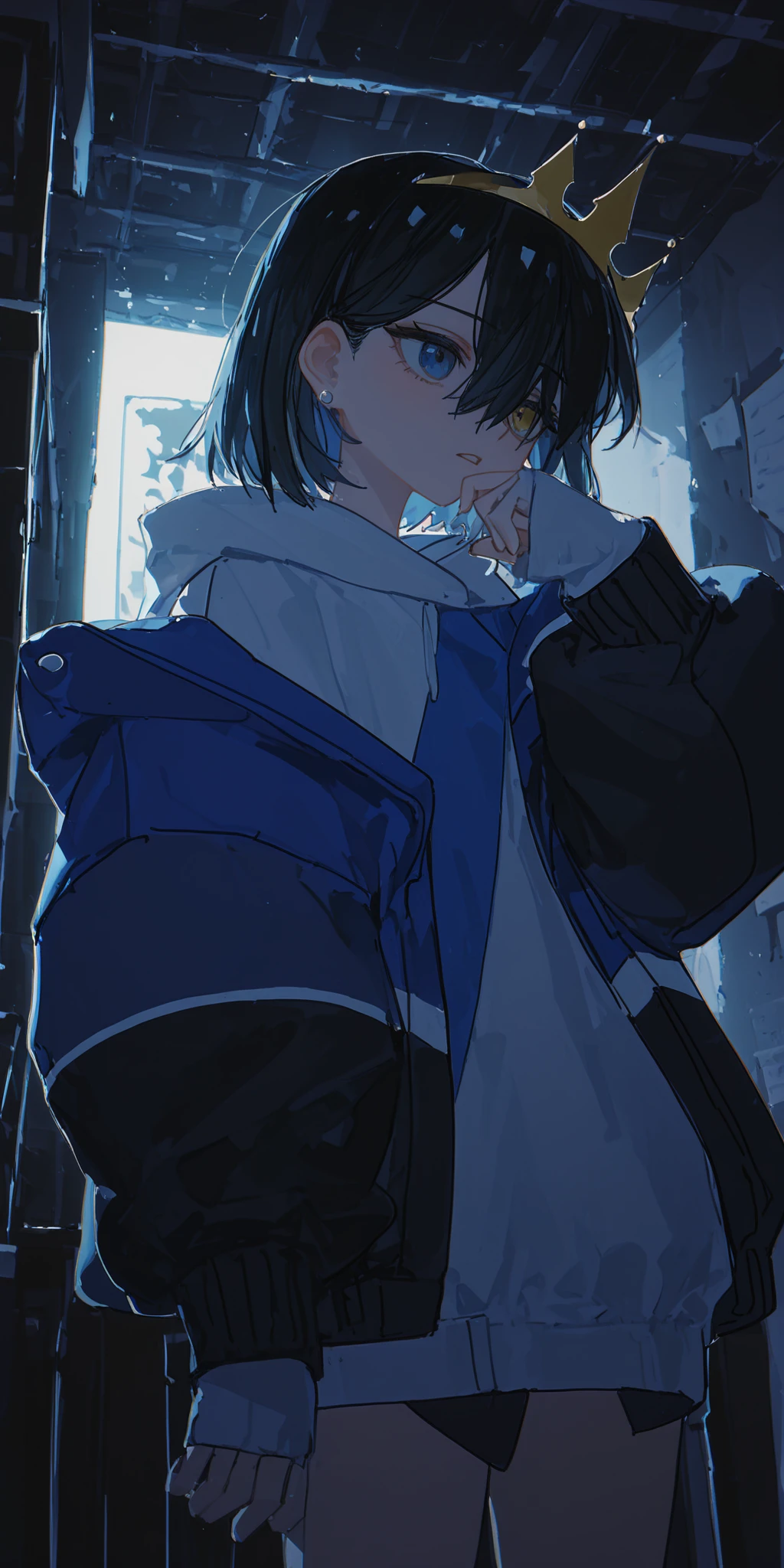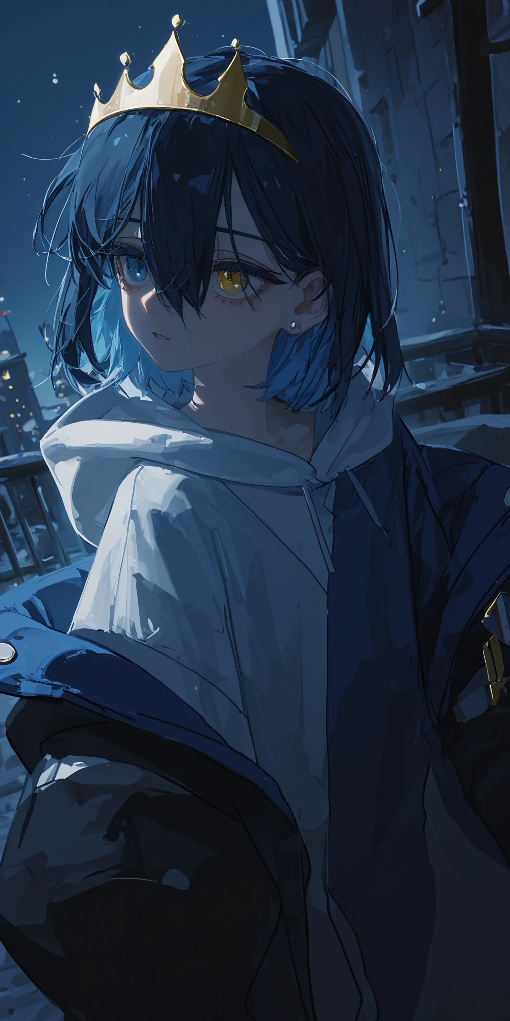 1girl, short hair, bangs, blue eyes, dark blue hair, hair between eyes, yellow eyes, multicolored hair, heterochromia, blue colored inner hair, left eye blue, right eye yellow,