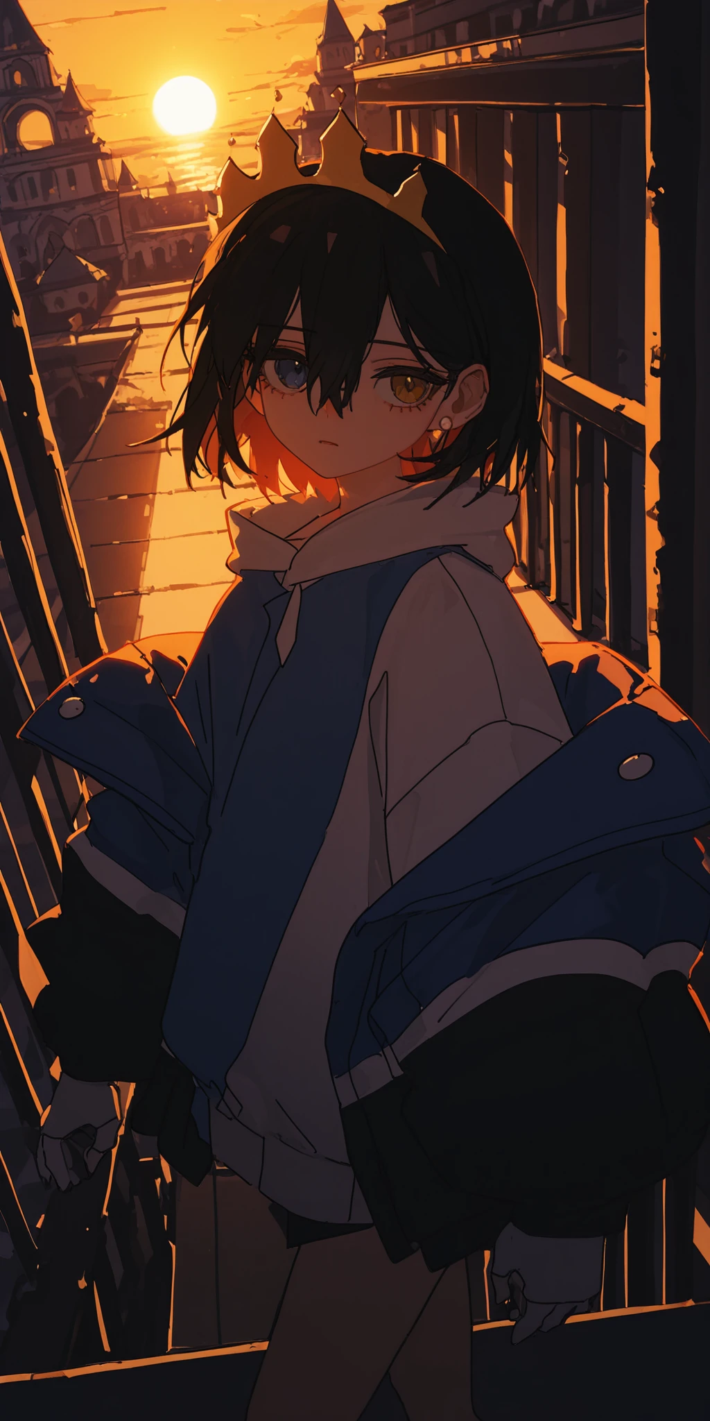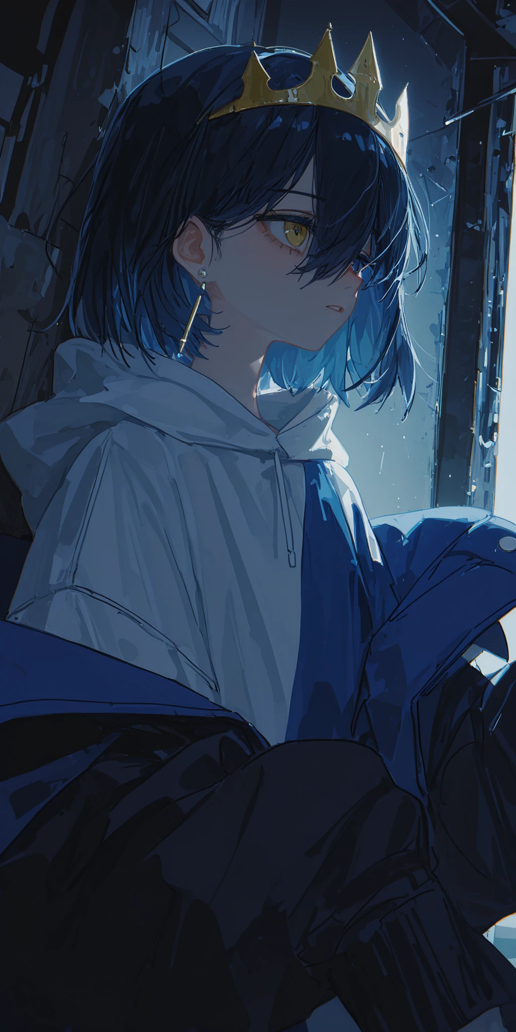 , long sleeves, jewelry, jacket, earrings, puffy sleeves, hood, sleeves past wrists, hoodie, hood down, tiara, jacket partially removed,