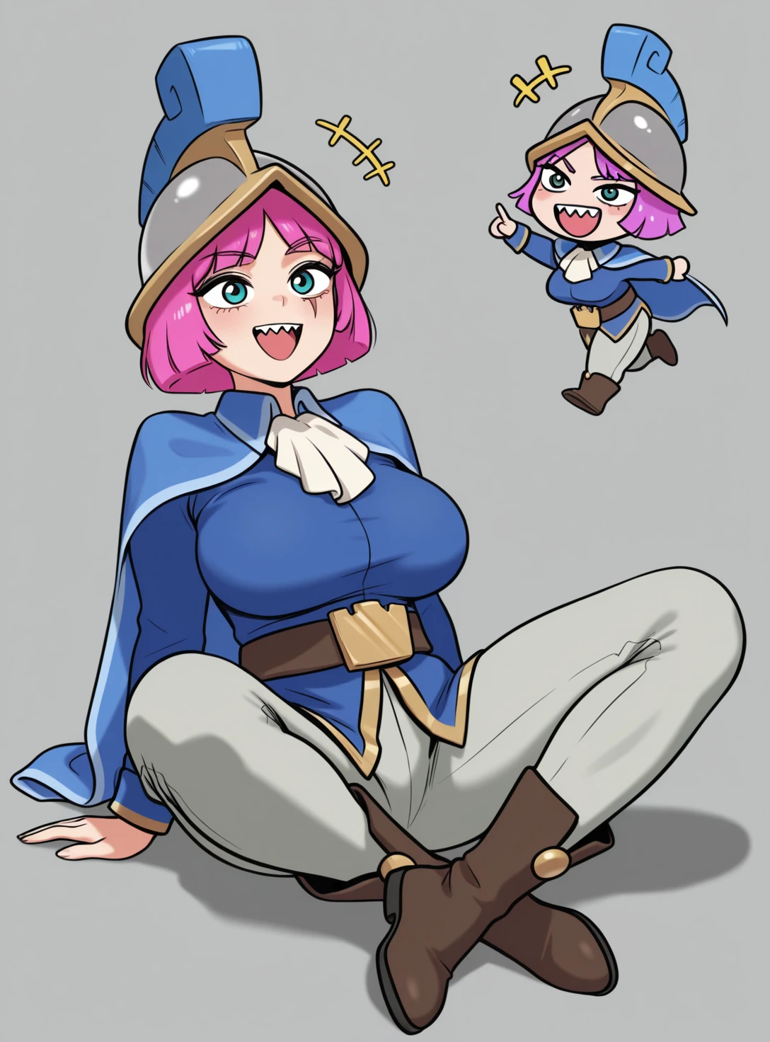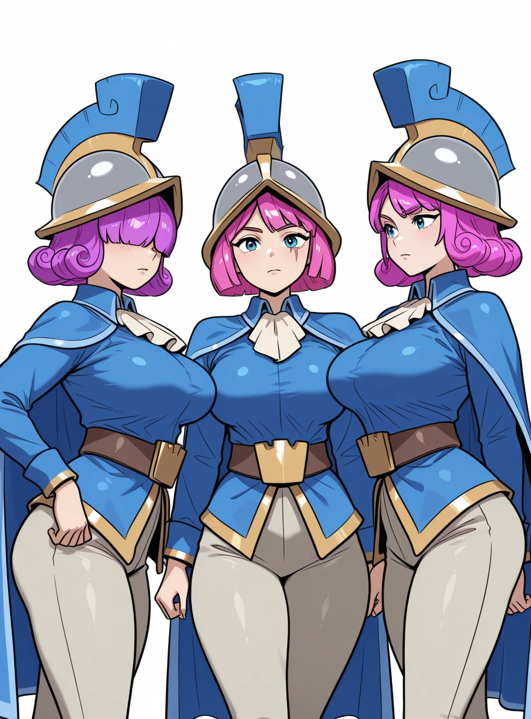 long sleeves, belt, pants, grey pants, ascot, cape, gold trim, helmet, lophon helmet, blue headwear,