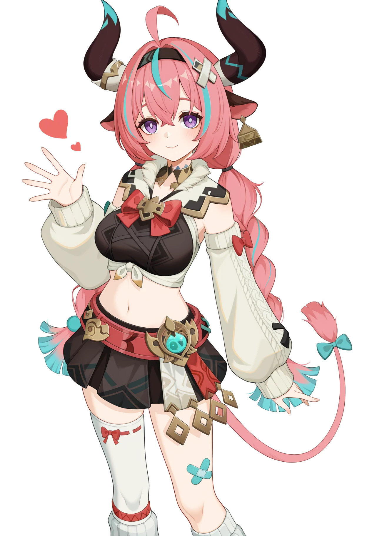 bandaid,black skirt,bandaid on leg,white thighhigh,shoes,single thighhigh,miniskirt,white socks,loose socks,detached sleeves,cow tail,pink tail,black crop top,single knee pad,pink knee pad,