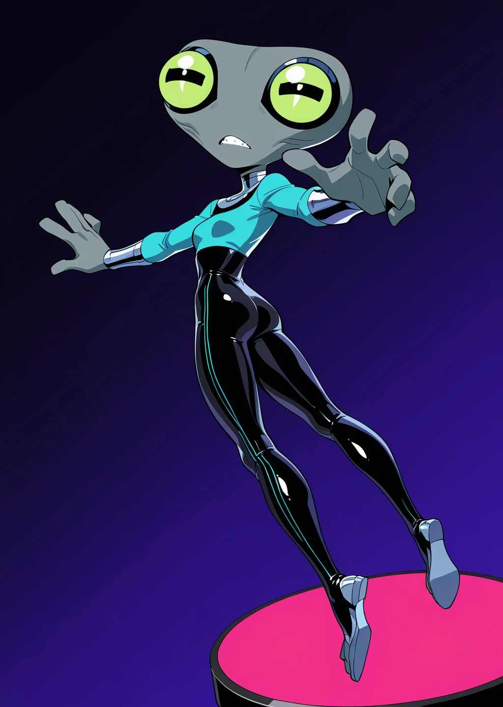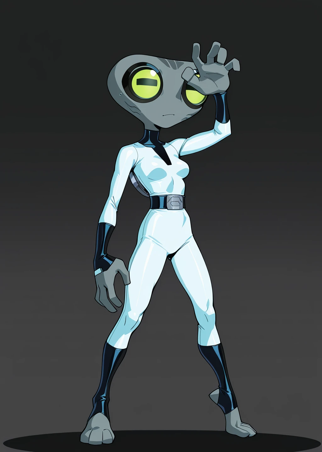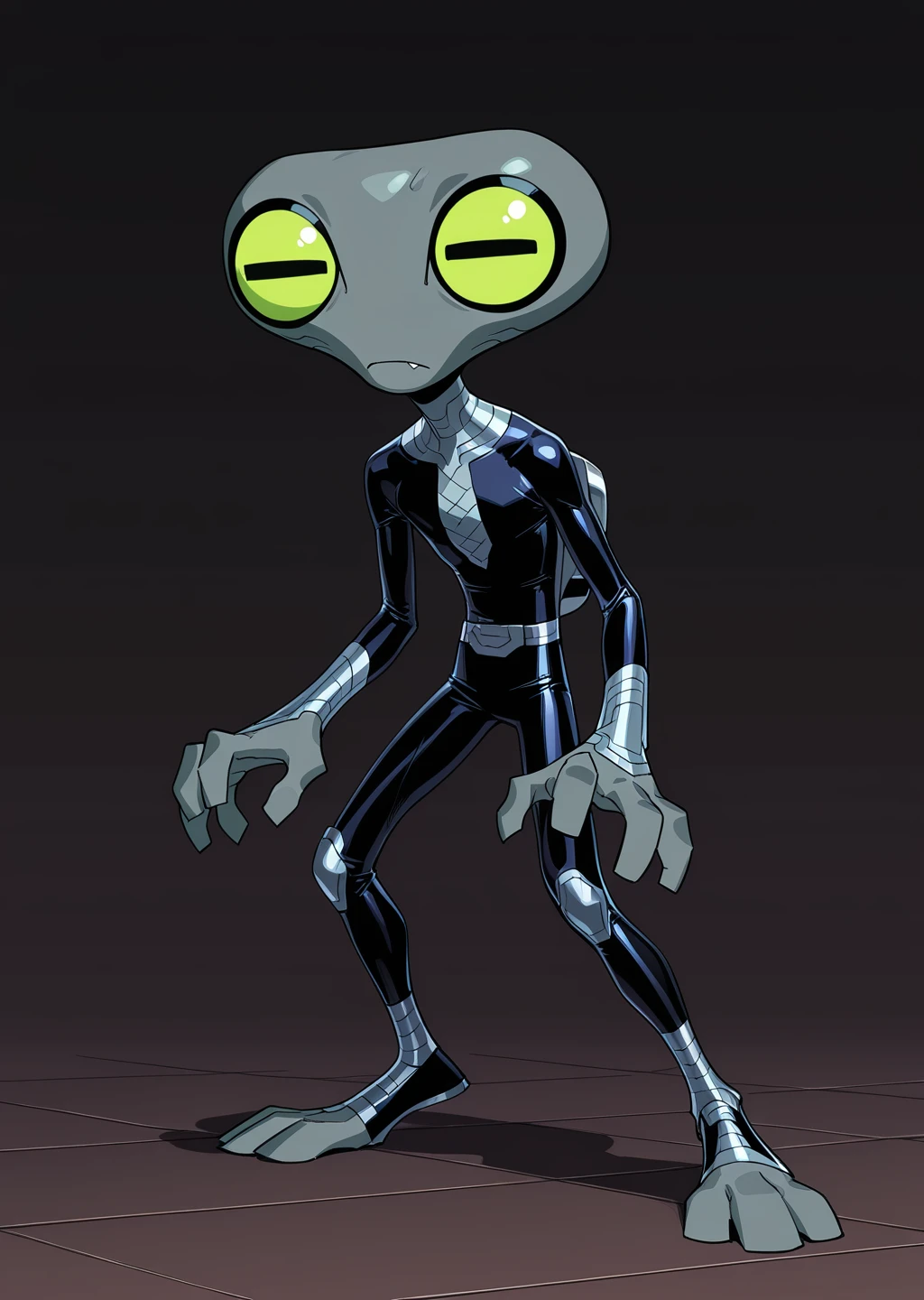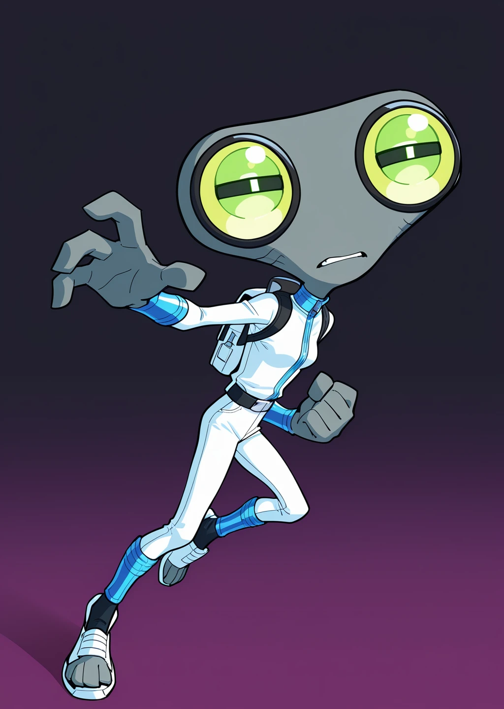Prompts: green eyes, galvan, grey skin, rectangular pupils, small body, miniature,