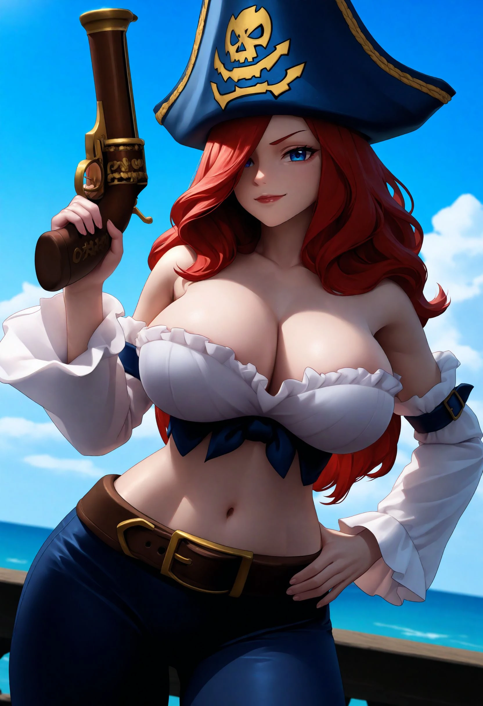 Default Outfit: default_fortune, wavy hair, red hair, hair over one eye, blue eyes, red liptstick, black hat, pirate hat, white crop top, collarbone, cleavage, navel, detached sleeves, black pants, brown belt, brown footwear, high heel boots,