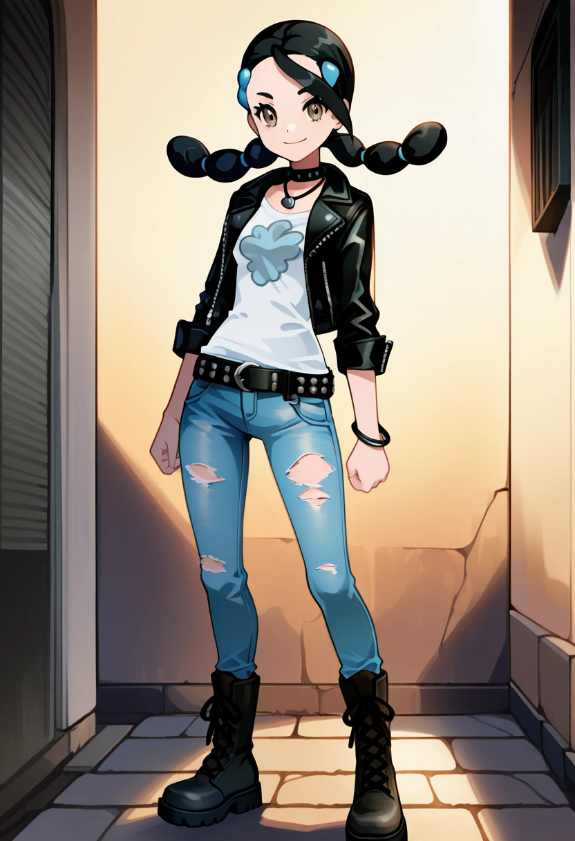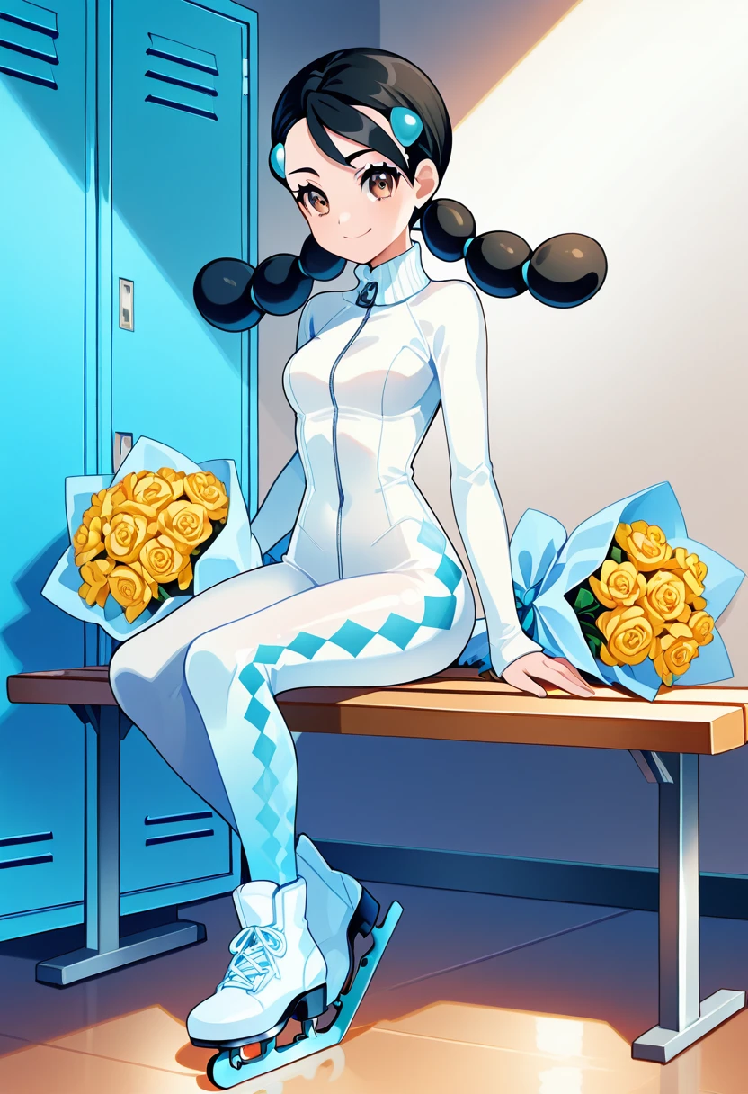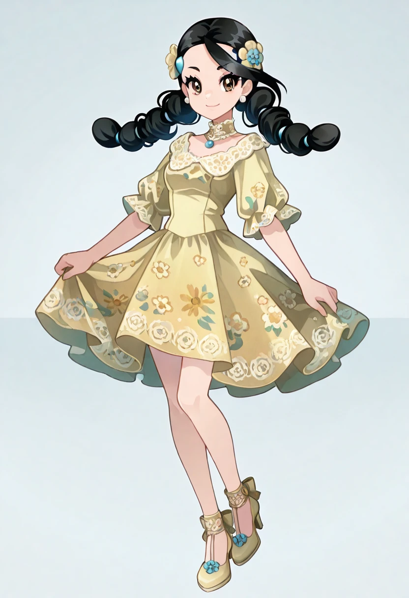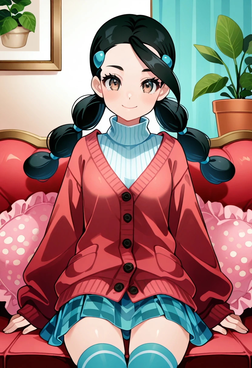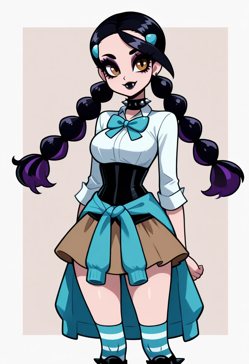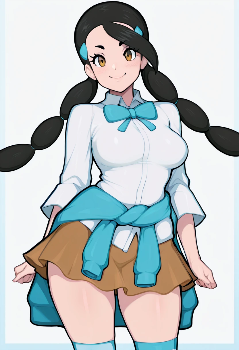 zzCandice, hair ornament, twintails, hairclip, striped socks, bowtie, sweater around waist, brown skirt,