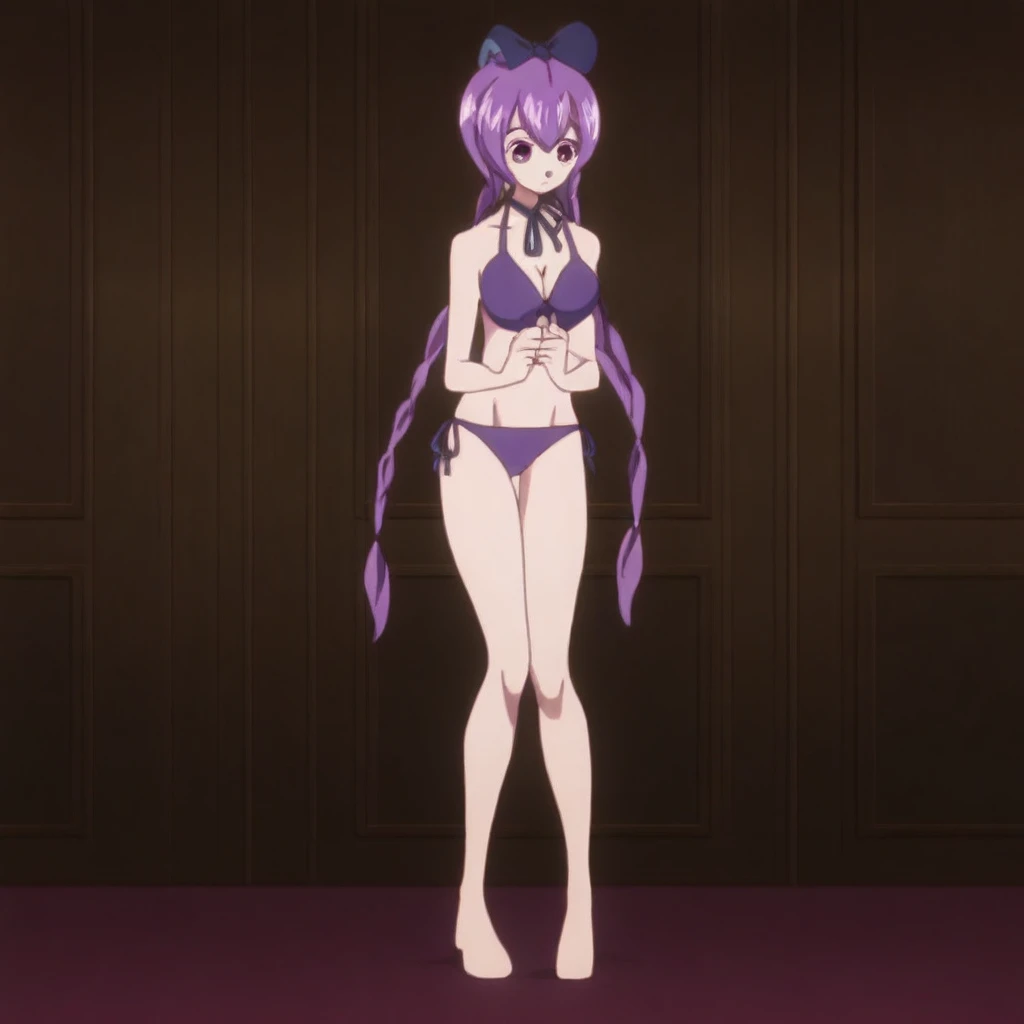 Mimico, purple hair, violet eyes, braid, twin braids, long hair, very long hair, 1girl, solo, purple bikini, cleavage, side-tie bikini bottom, ribbon, full body