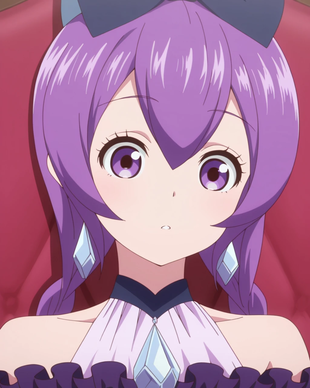 Mimico, purple hair, violet eyes, braid, twin braids, long hair, very long hair, 1girl, solo, earrings, jewelry, bare shoulders