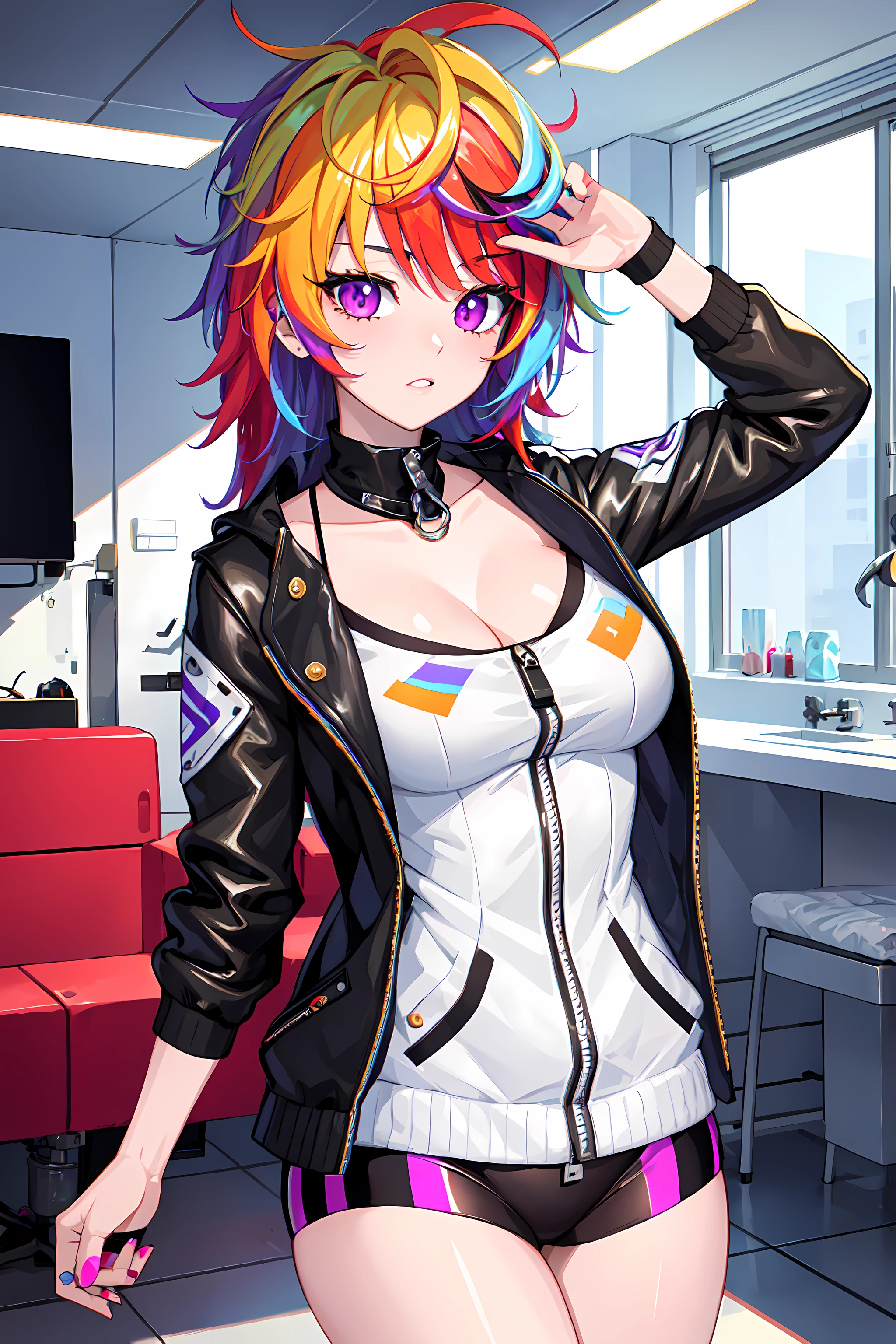 iro, 1girl, solo, multicolored hair, rainbow hair, purple eyes