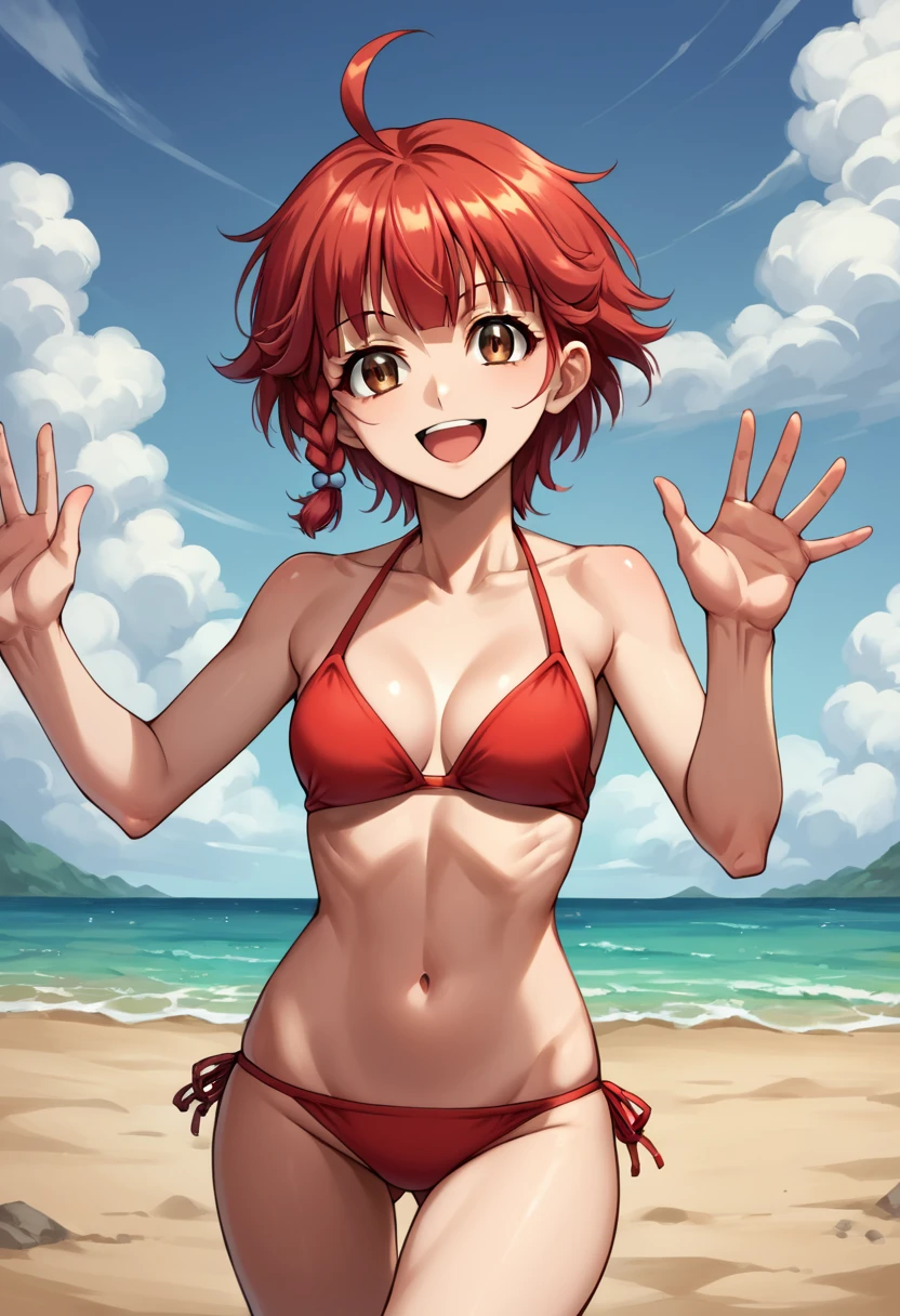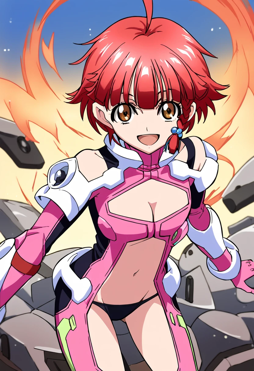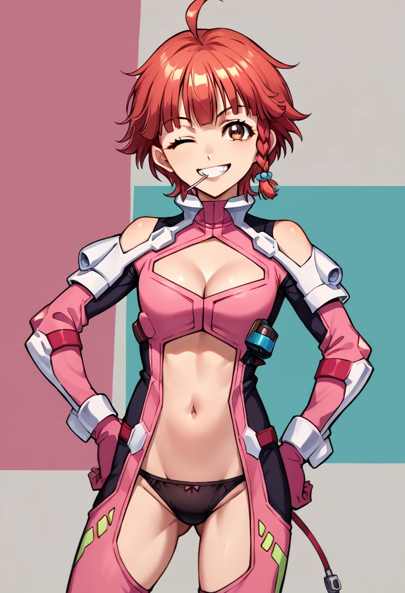 pink bodysuit, detached sleeves, pink gloves, cleavage cutout, navel cutout, black panties, bare thighs, red hair, bangs, ahoge, short hair, single braid, brown eyes