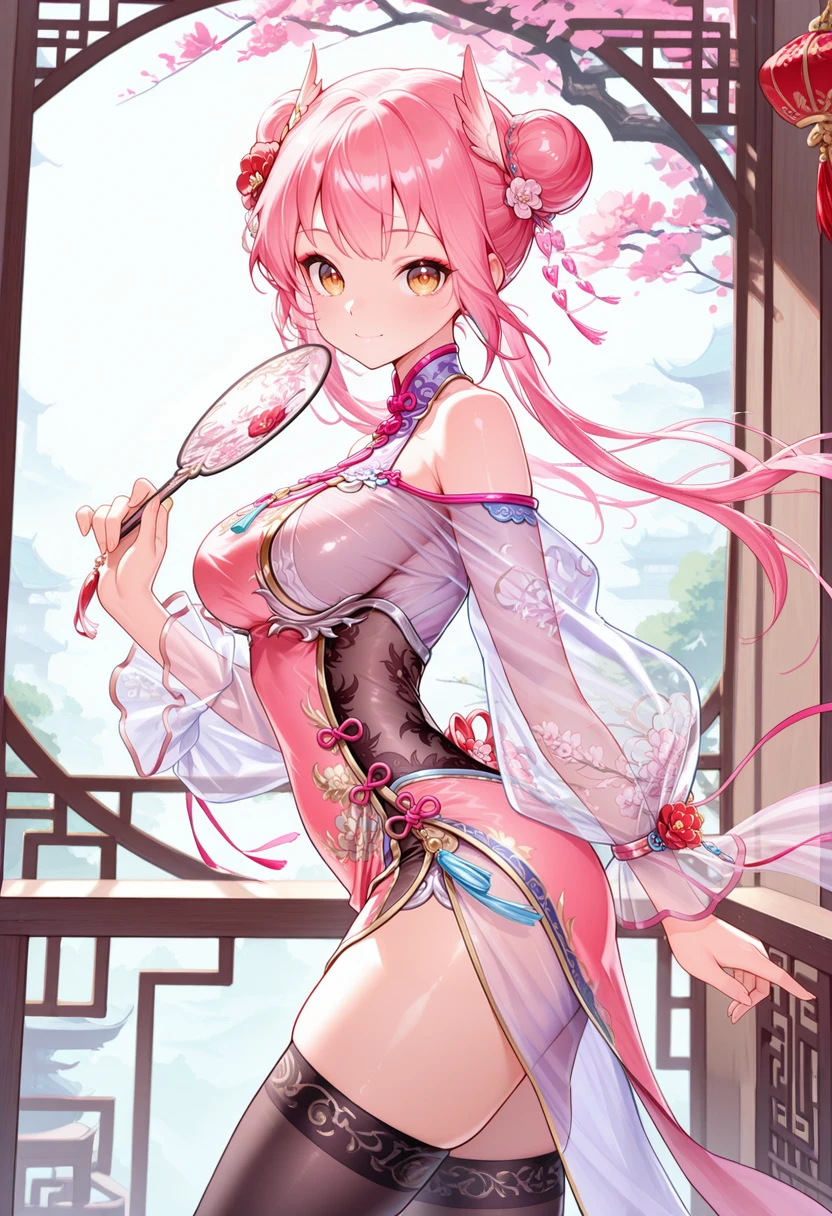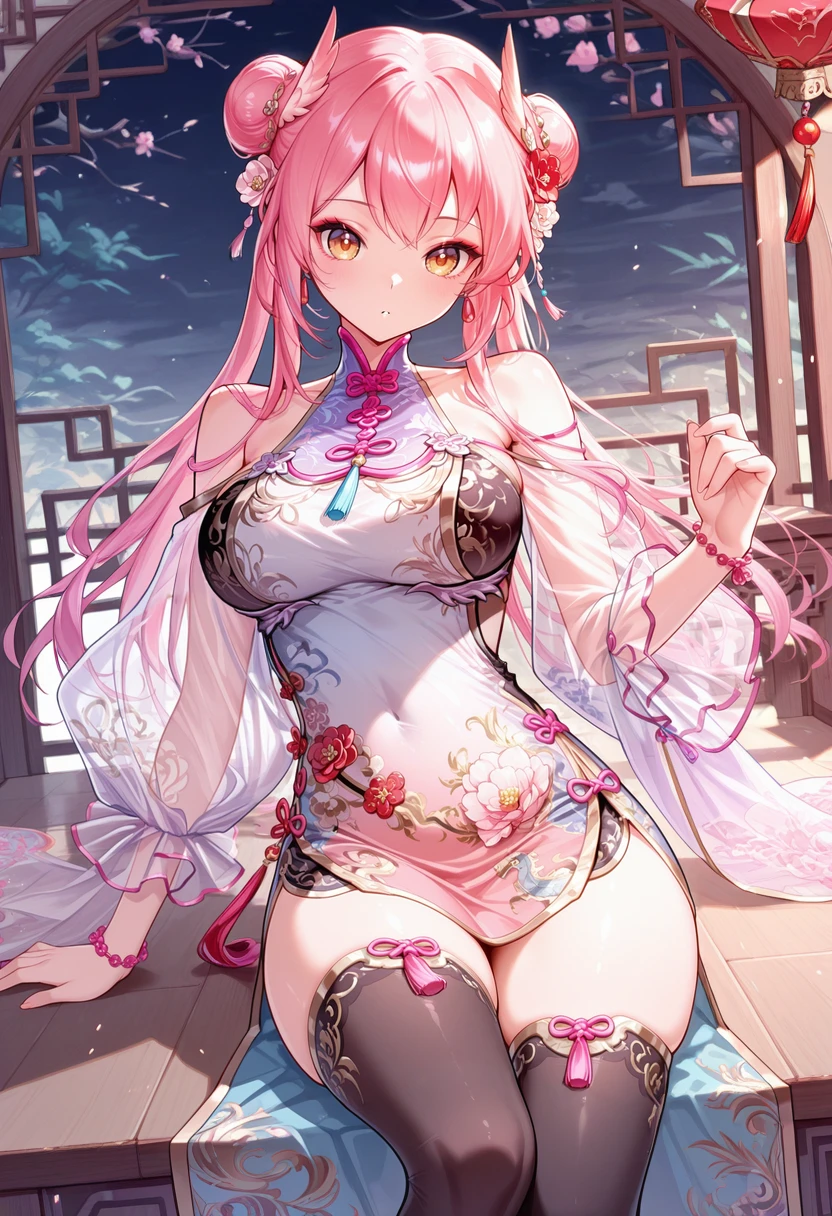 double bun,hair flower,red flower,hair ornament,chinese clothes,black thighhighs,see-through sleeves,bare shoulders,Onsen: