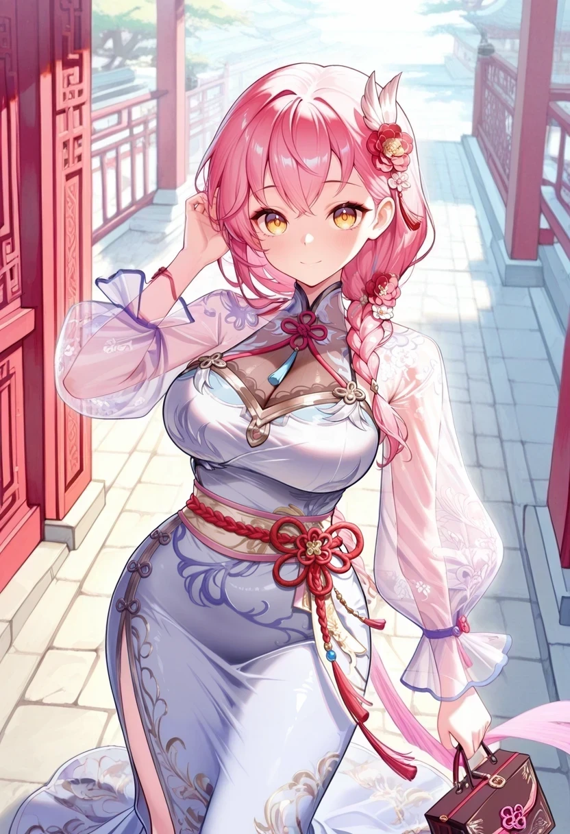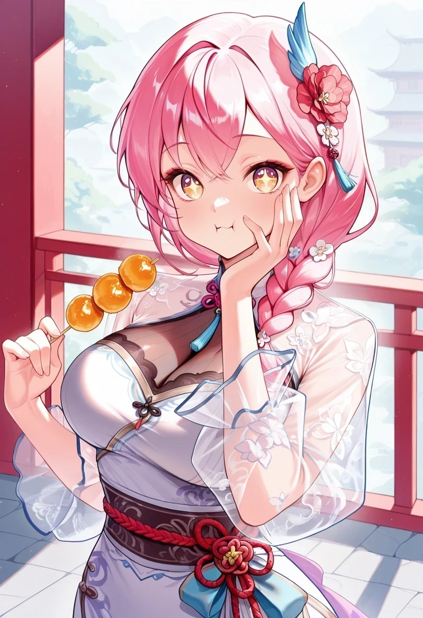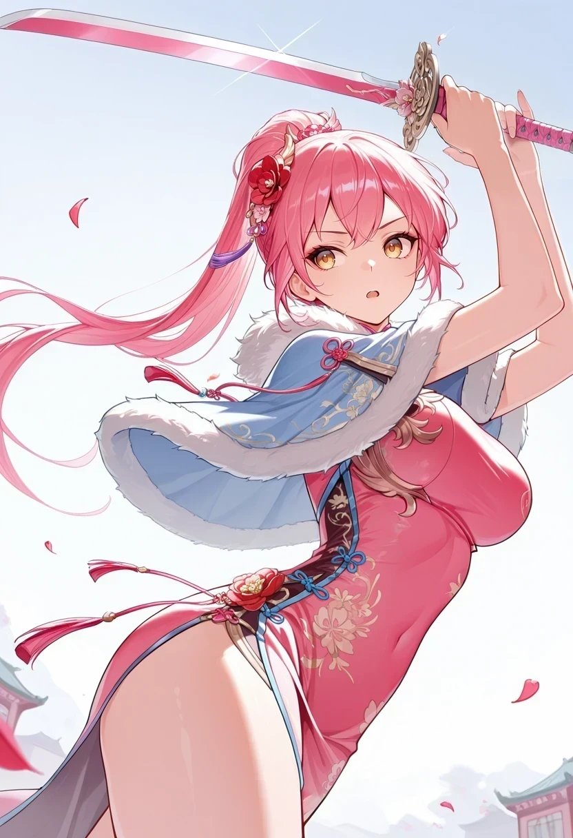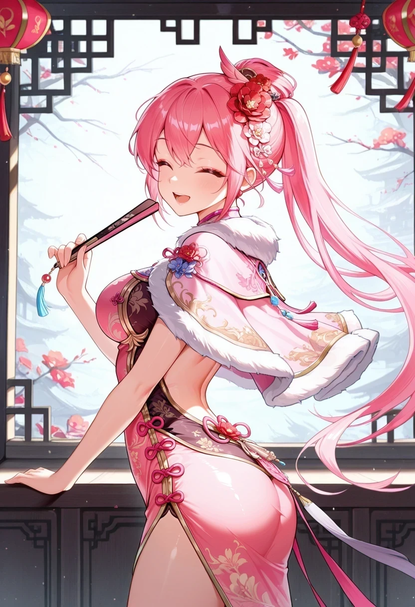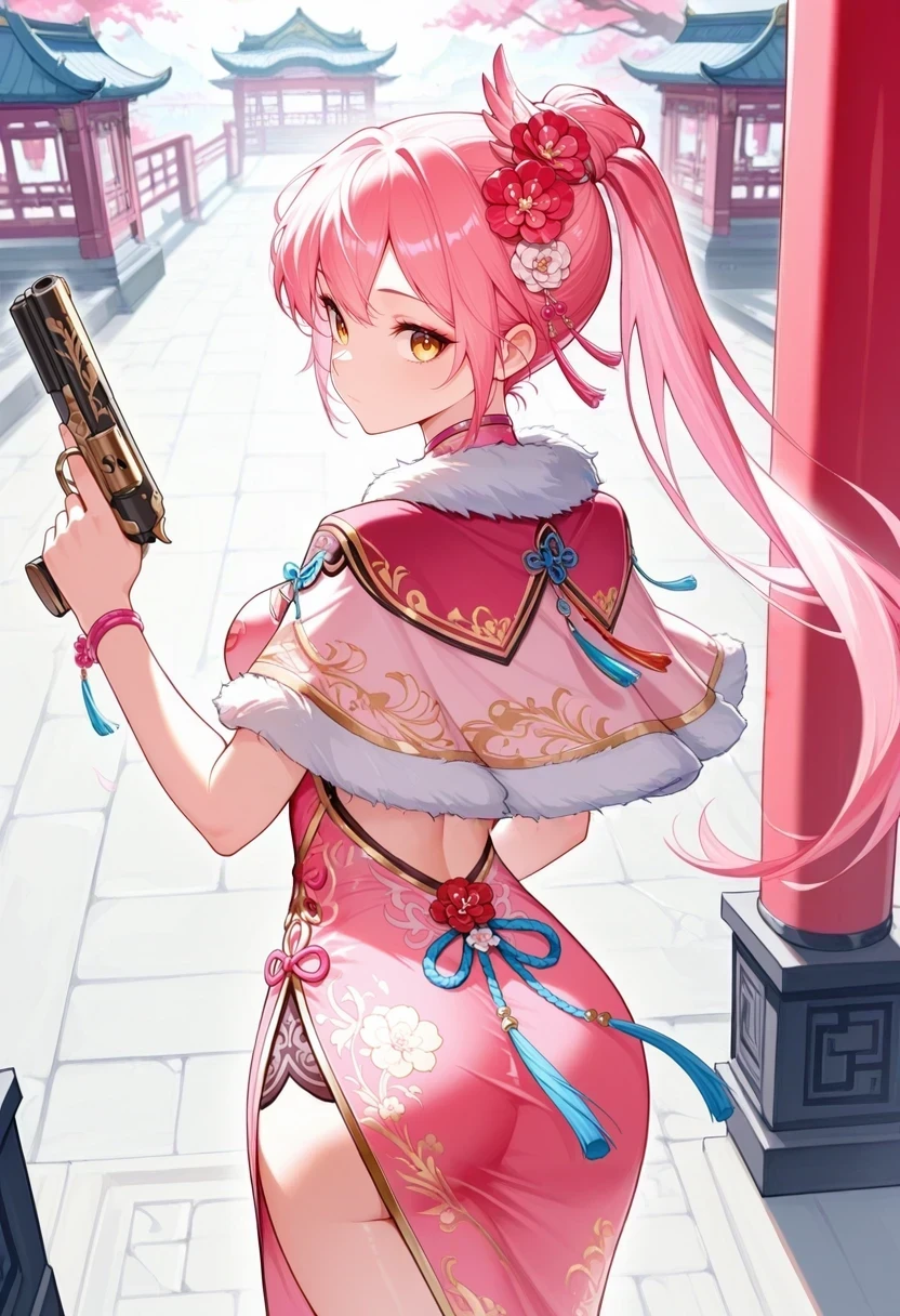 ponytail,hair flower,red flower,capelet,pink china dress,fur trim,backless dress,