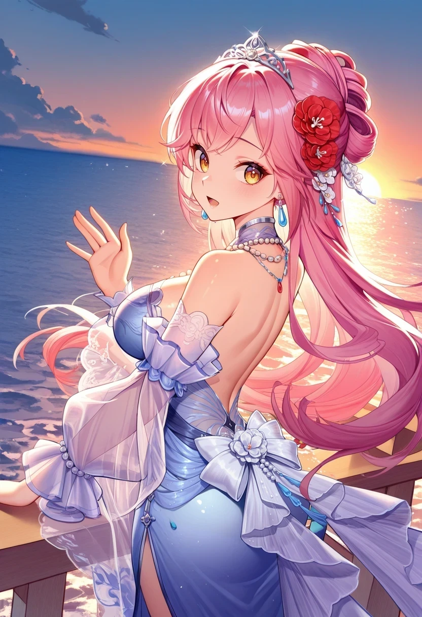 hair flower,red flower,evening gown,frilled dress,detached sleeves,see-through sleeves,feixianji \(hairstyle\),tiara,bead necklace,cleavage cutout,