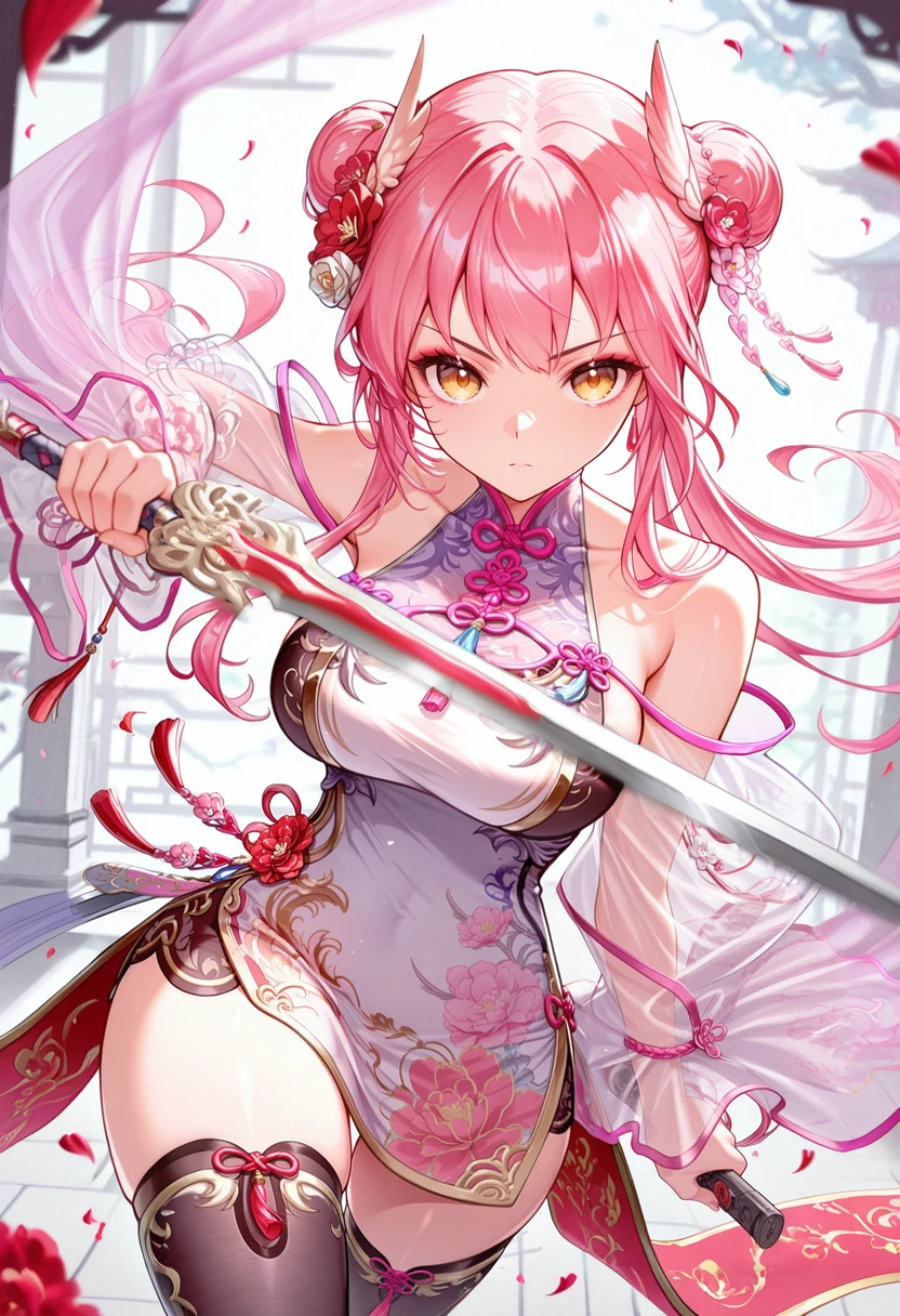 double bun,hair flower,red flower,hair ornament,chinese clothes,black thighhighs,see-through sleeves,bare shoulders,