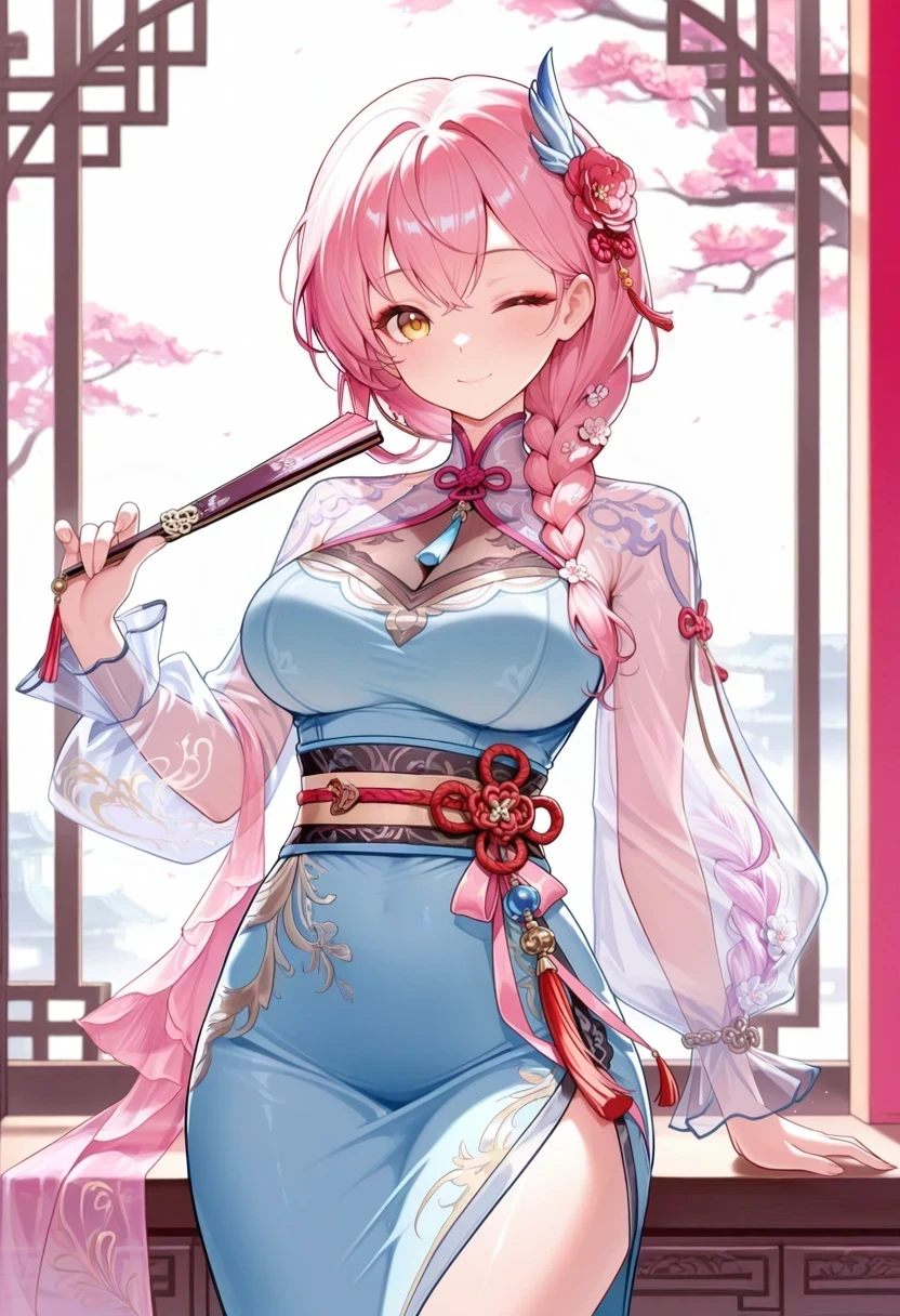 single braid,hair flower,hair ornament,hair over shoulder,see-through sleeves,see-through cleavage,waist sash,chinese knot,long dress,