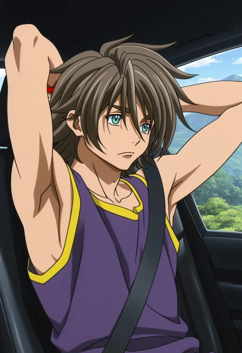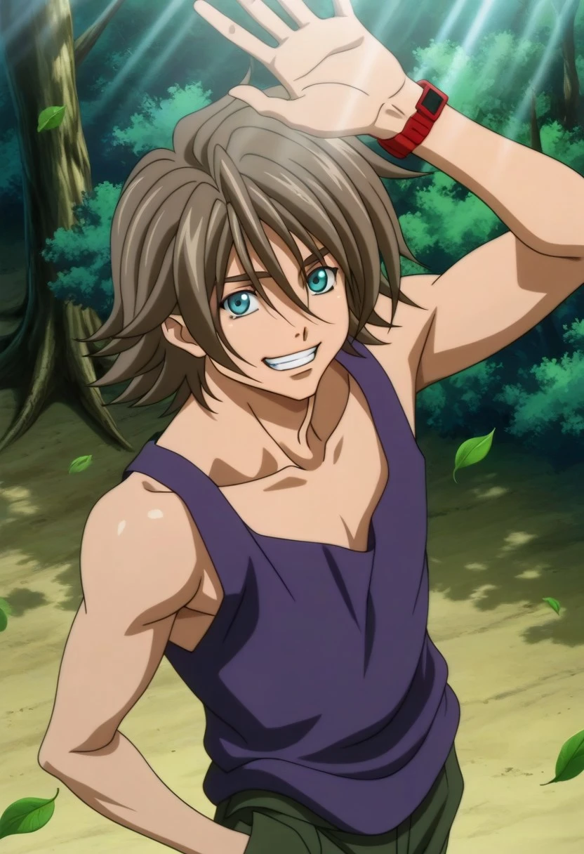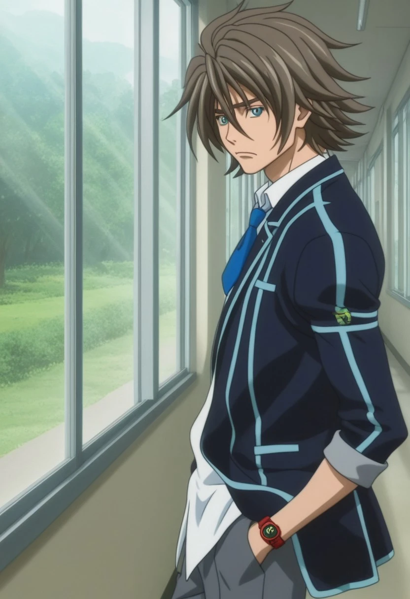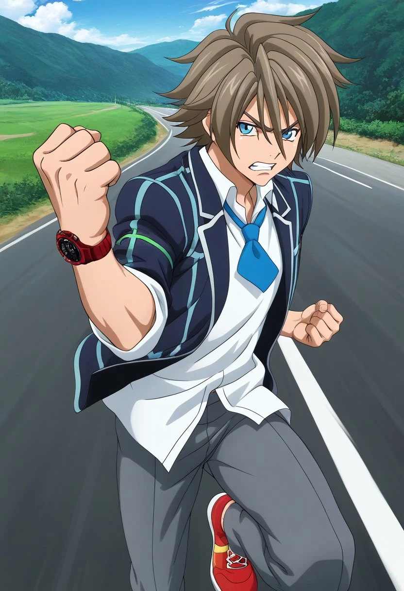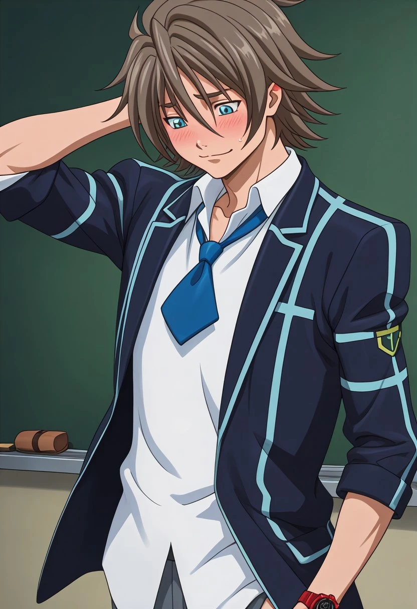 Alma Tandouji, light brown hair, cyan-dark blue eyes, dark blue open blazer, light blue accents, white collared untucked undershirt, short blue necktie, rolled sleeves, red right wristwatch, gray pants