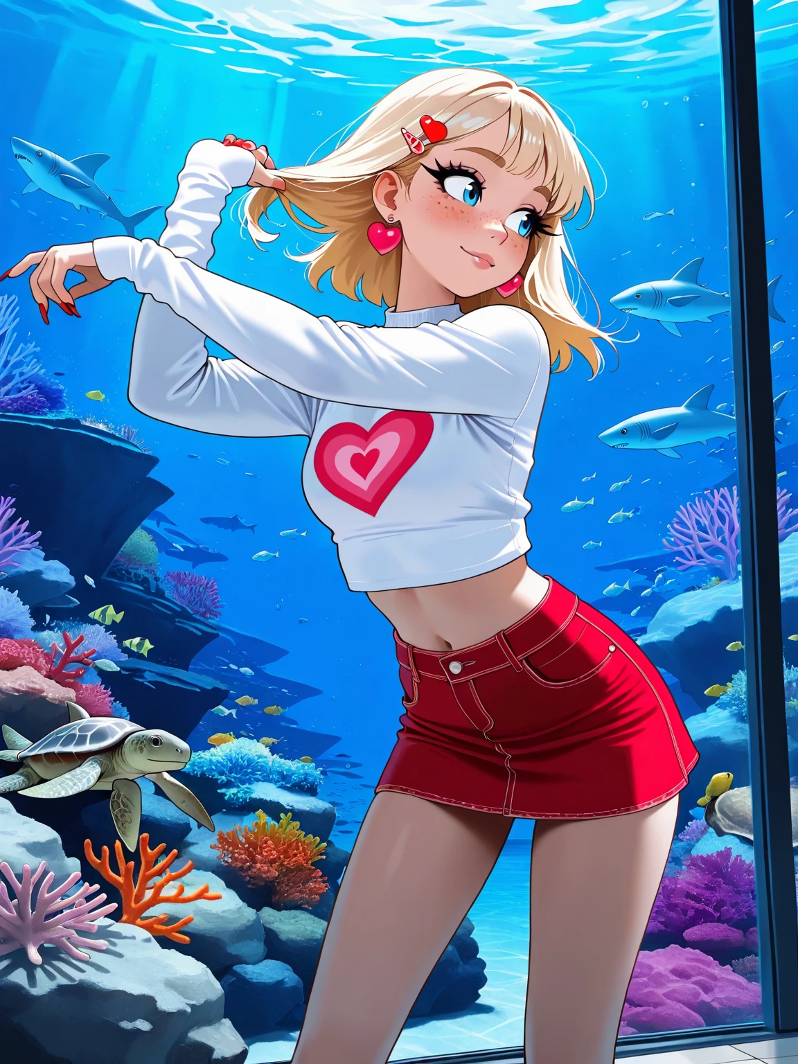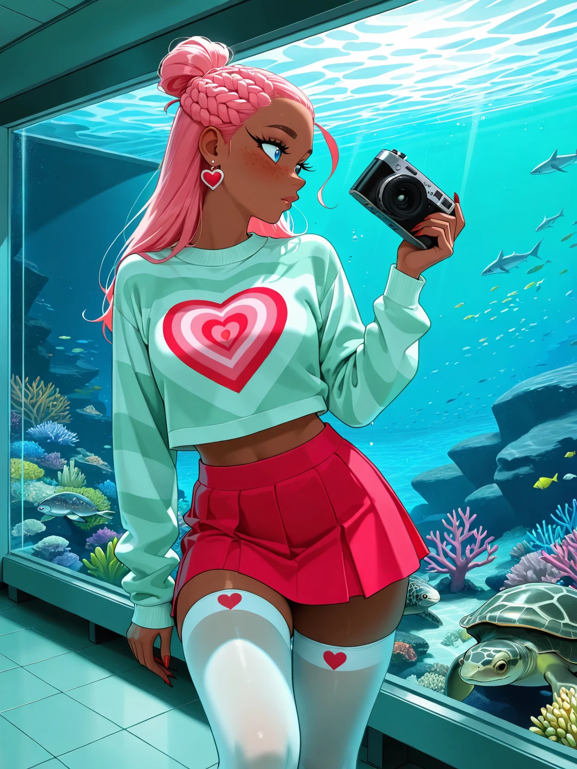 Tag suggestions: striped sleeves, heart pattern thighhighs, heart hair charm, hearts on sneakers, hearts on footwear, heart-shaped eyewear, heart-shaped glasses, heart earrings, heart jewelry, cute crop top, hood, mini dress, sleeveless, little hearts in air, hearts theme, cute top, shirt, dress,