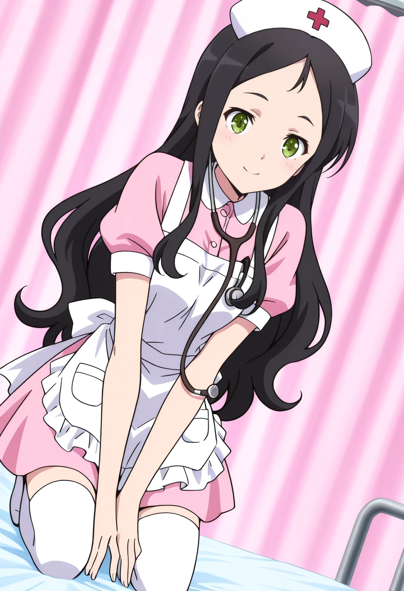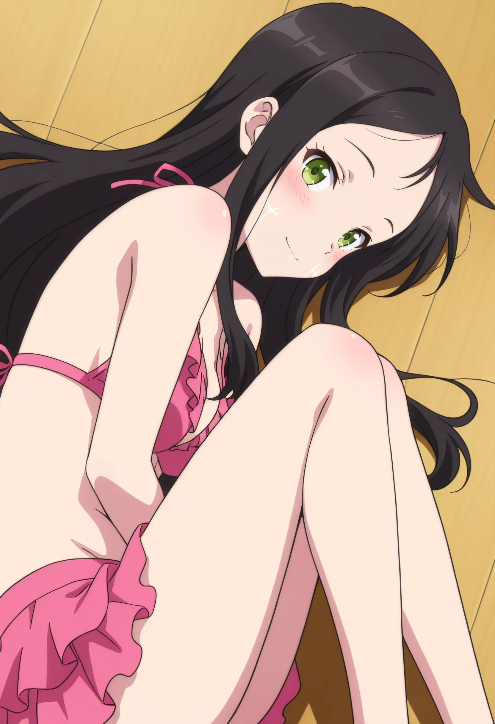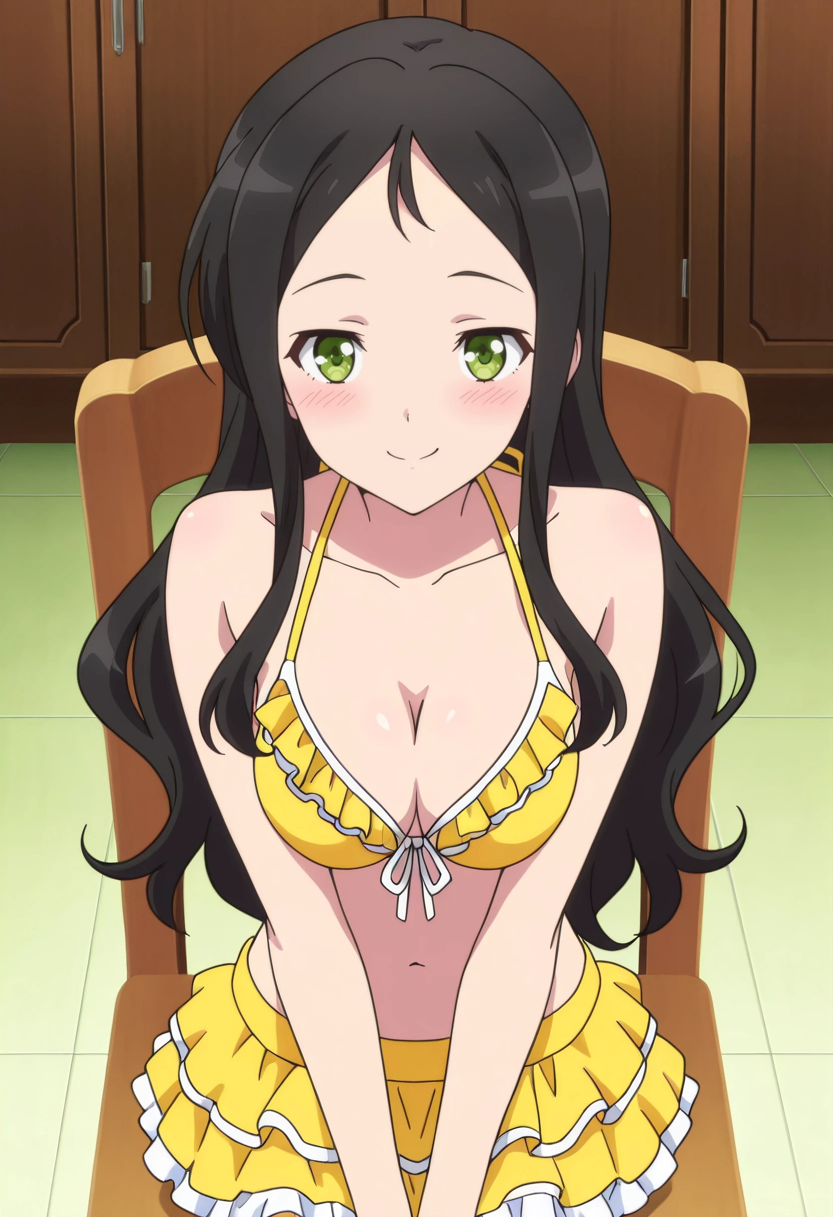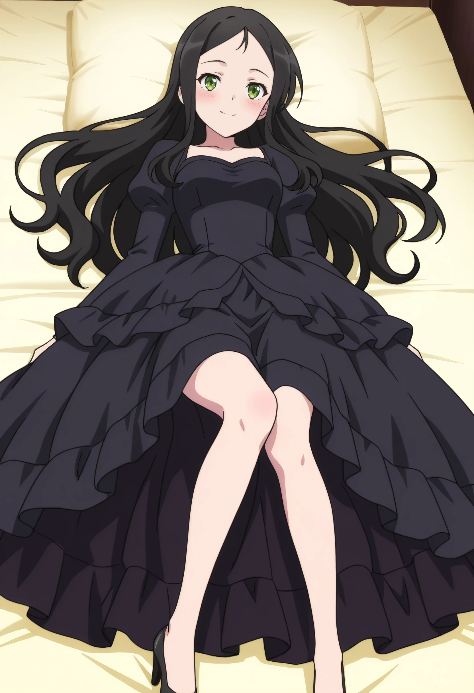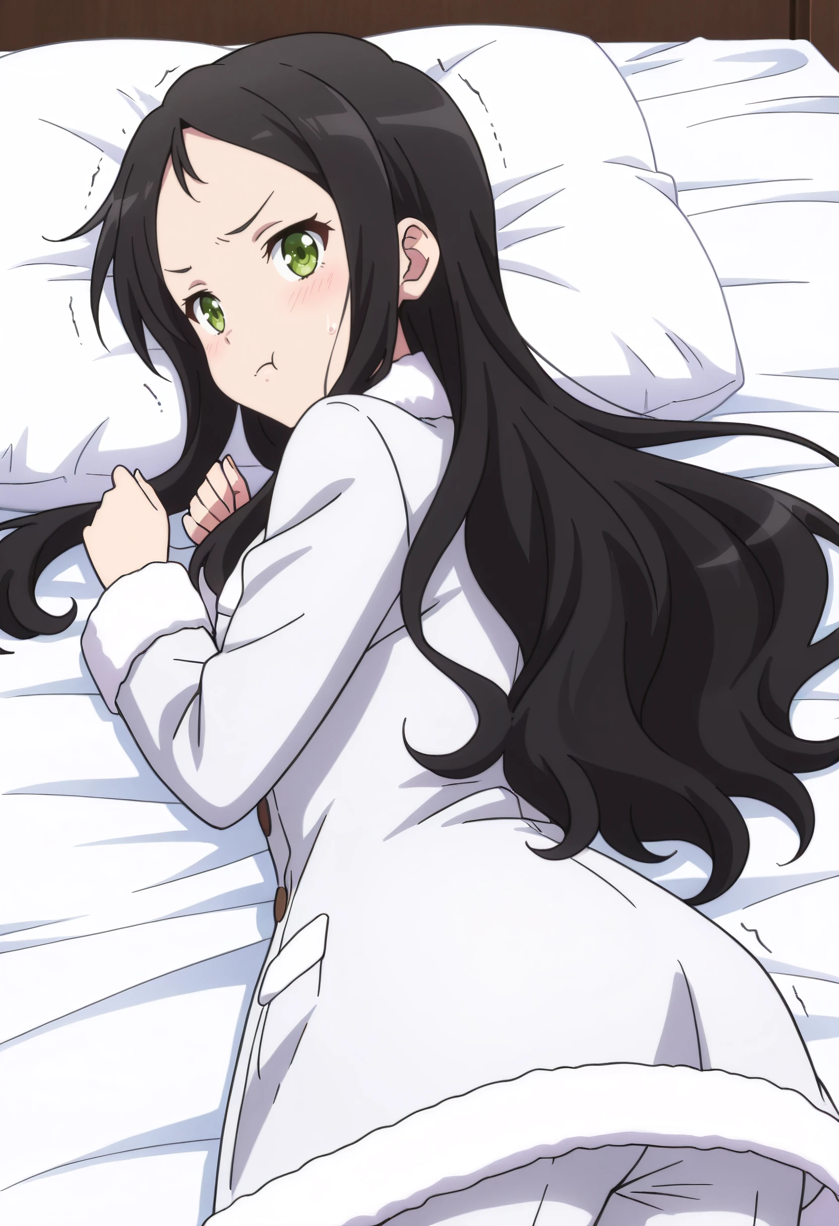 IAWAer, black hair, long hair, green eyes, bangs, forehead,