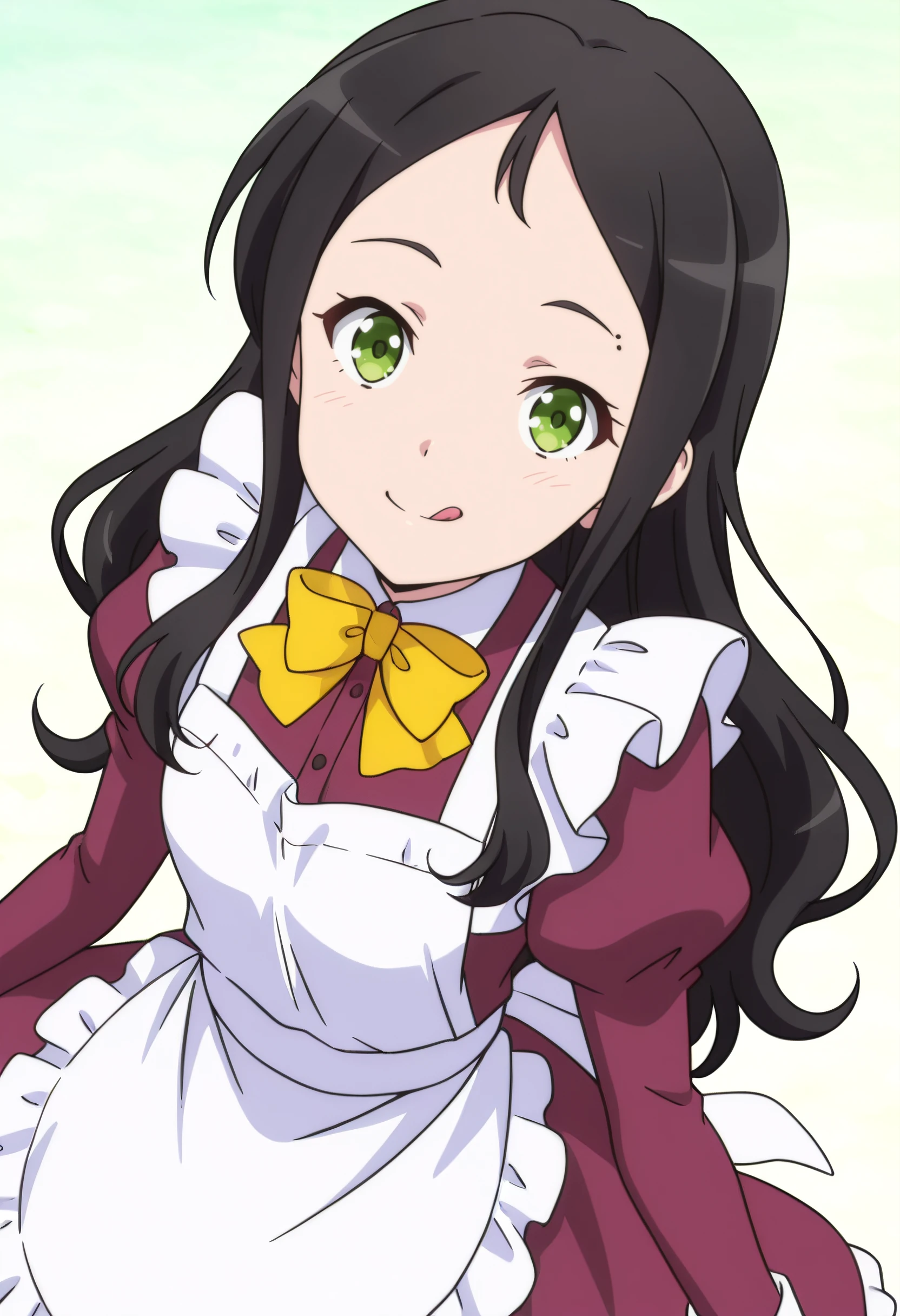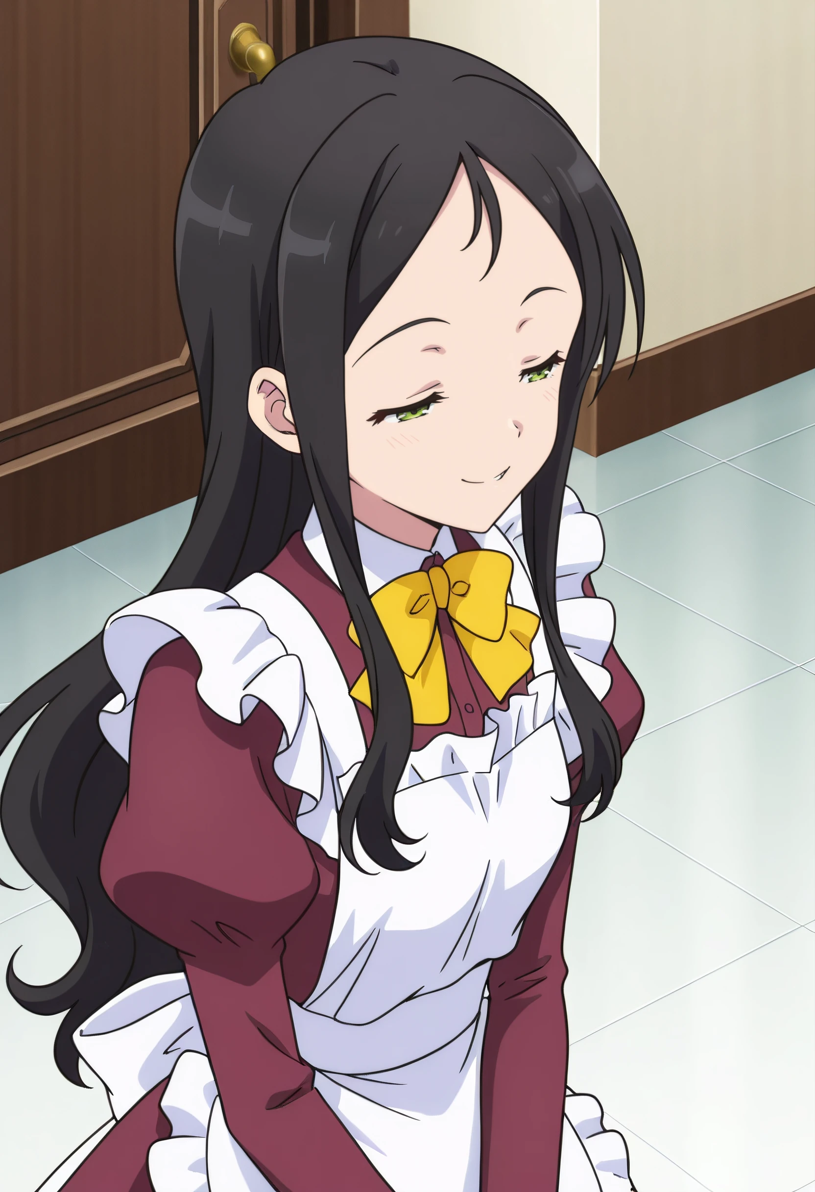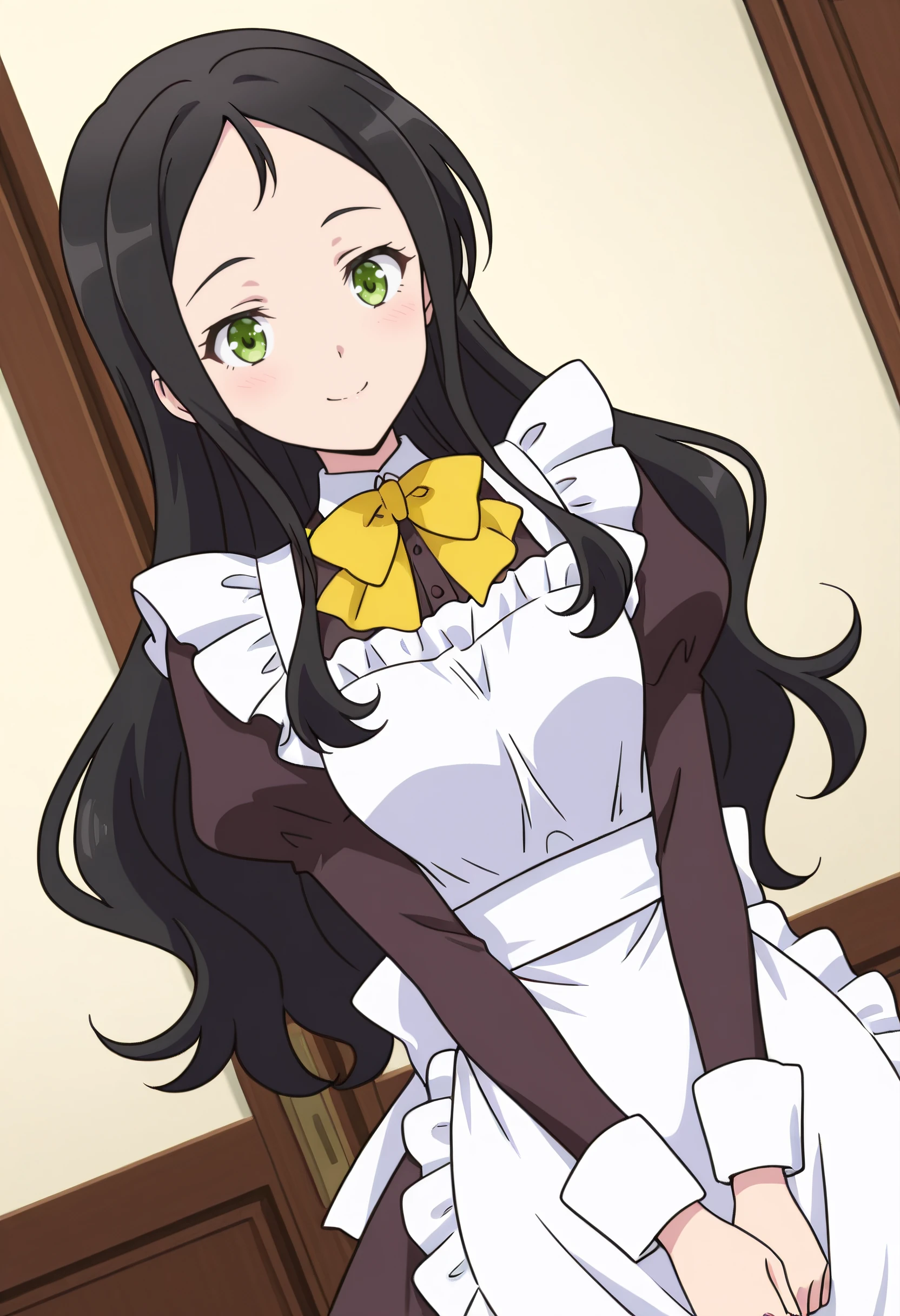 bow, yellow bow, yellow bowtie, puffy sleeves, long sleeves, bowtie, yellow neckwear, apron, maid, juliet sleeves, dress, maid apron, white apron, frilled apron, enmaided,