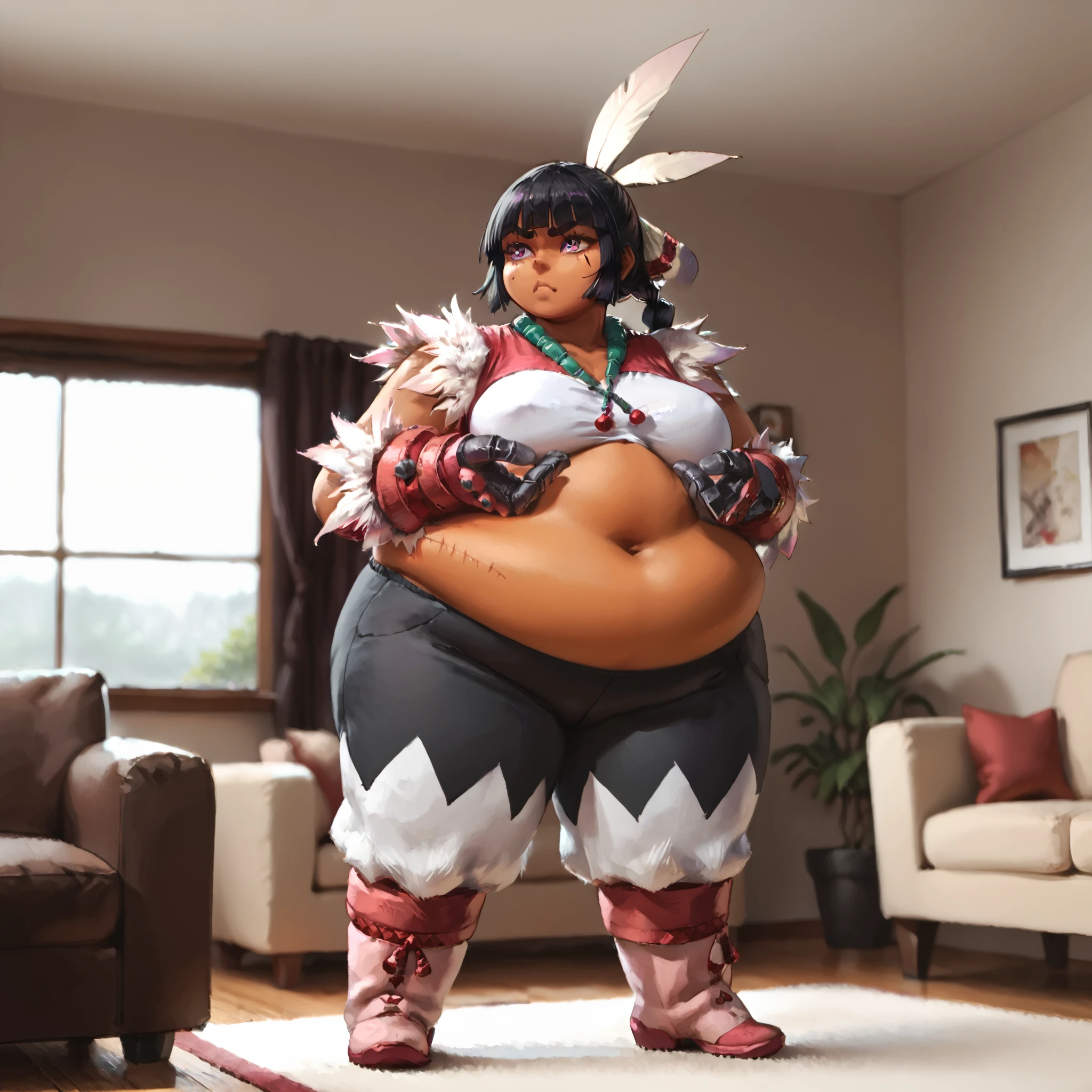 triggers for the Character:long hair,black hair,purple eyes,dark skinned female,single braid,plump,big belly,belly scar,large breasts,thick thighs,blunt bangs,thick eyebrows