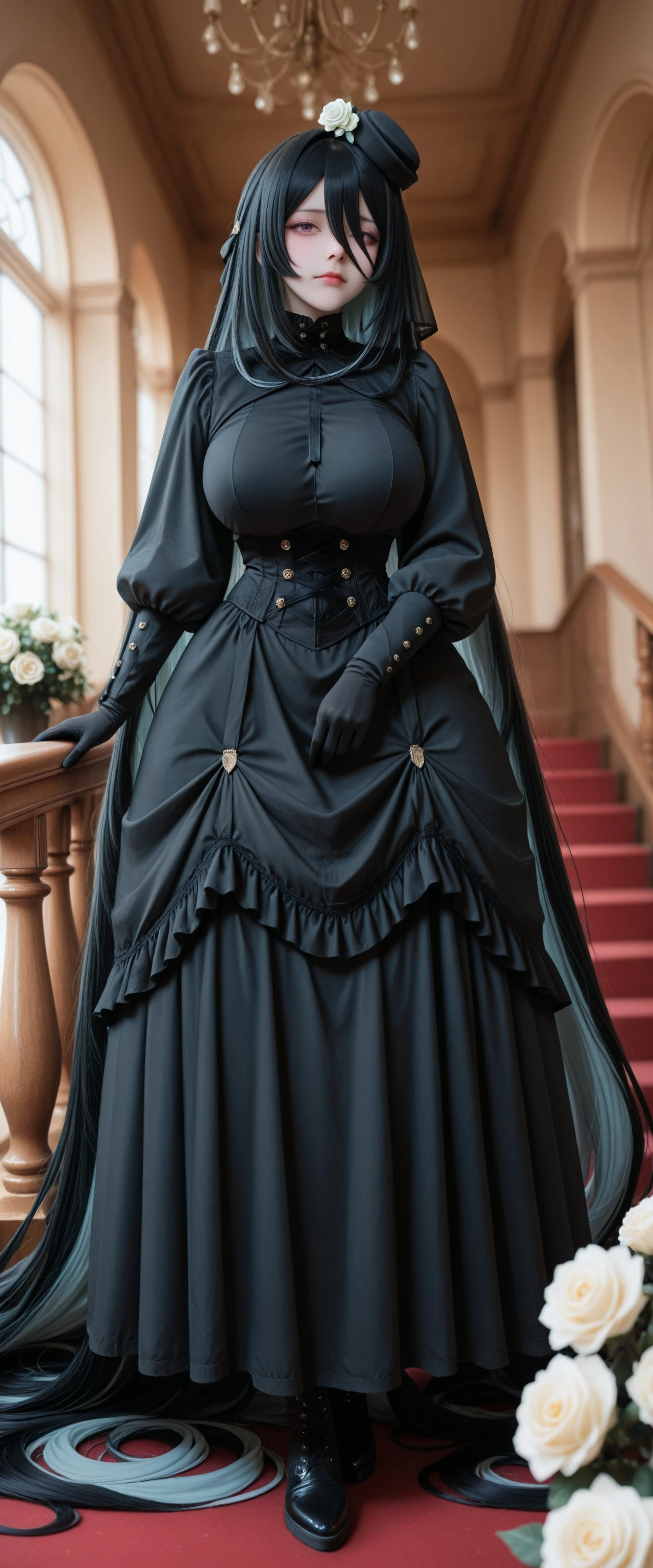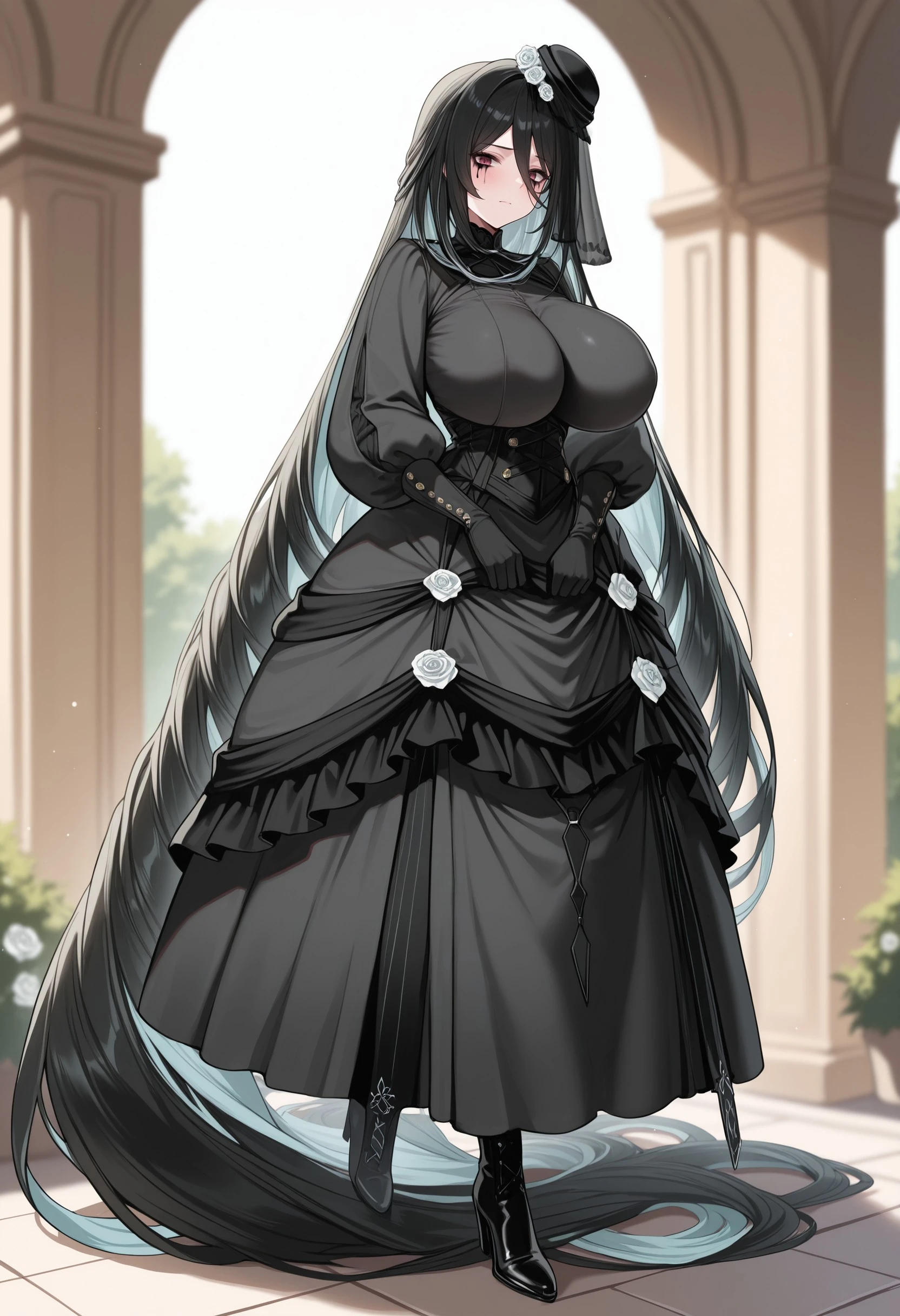 , runny_makeup, black veil, veil, long_hair, gloves, black_gloves, tachi-e, impossible_clothes, white_flower, long_dress, closed_mouth, black_corset, tilted_headwear, puffy_sleeves, corset, colored_inner_hair, breasts, boots, long_sleeves, hair_between_eyes, dress, white_rose, solo, hat, frilled_dress, layered_dress, full_body, black_headwear, multicolored_hair, looking_at_viewer, flower, black_hair, 1girl, black_dress, very_long_hair, frills, absurdly_long_hair, black_footwear, lemonade beta,