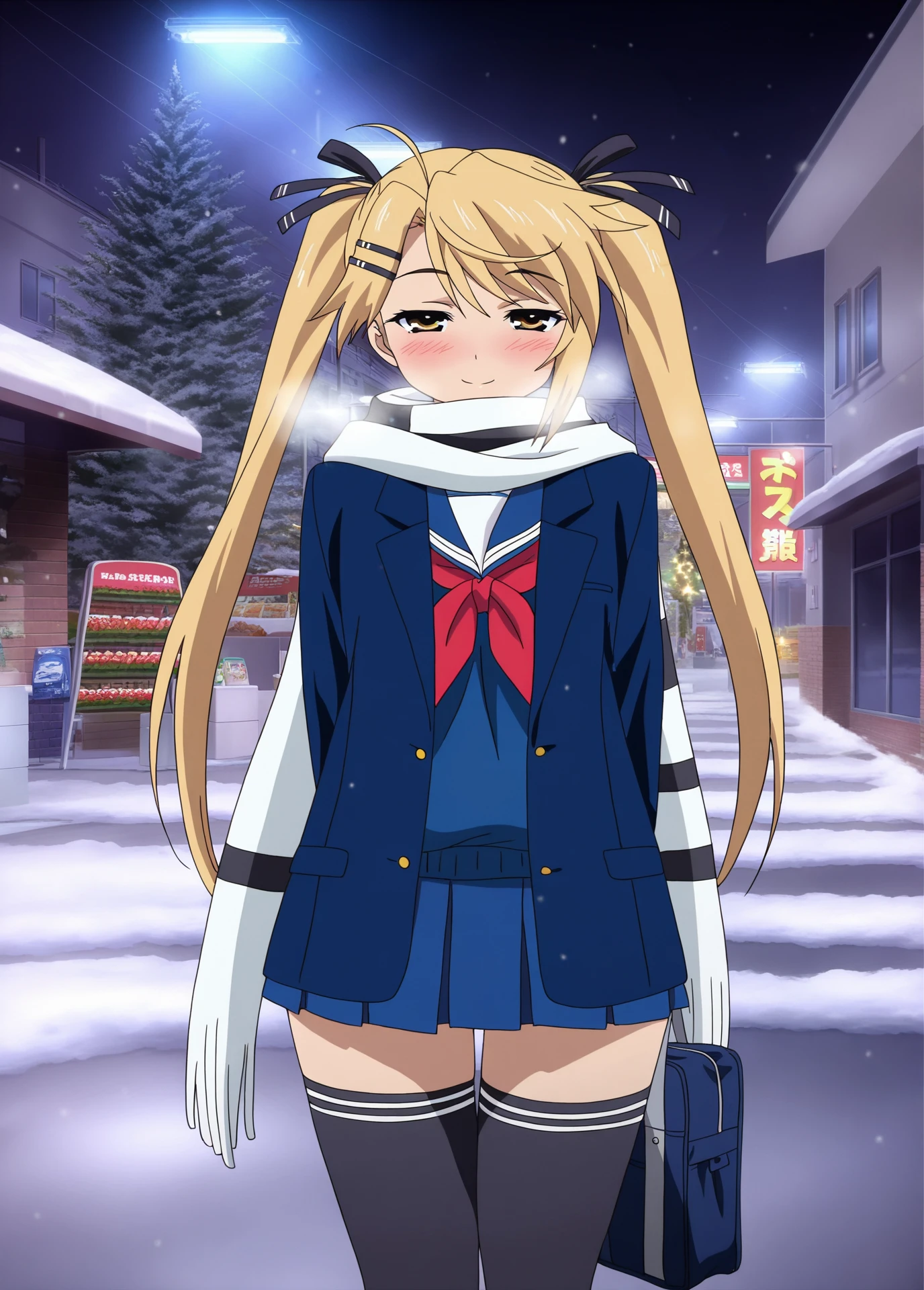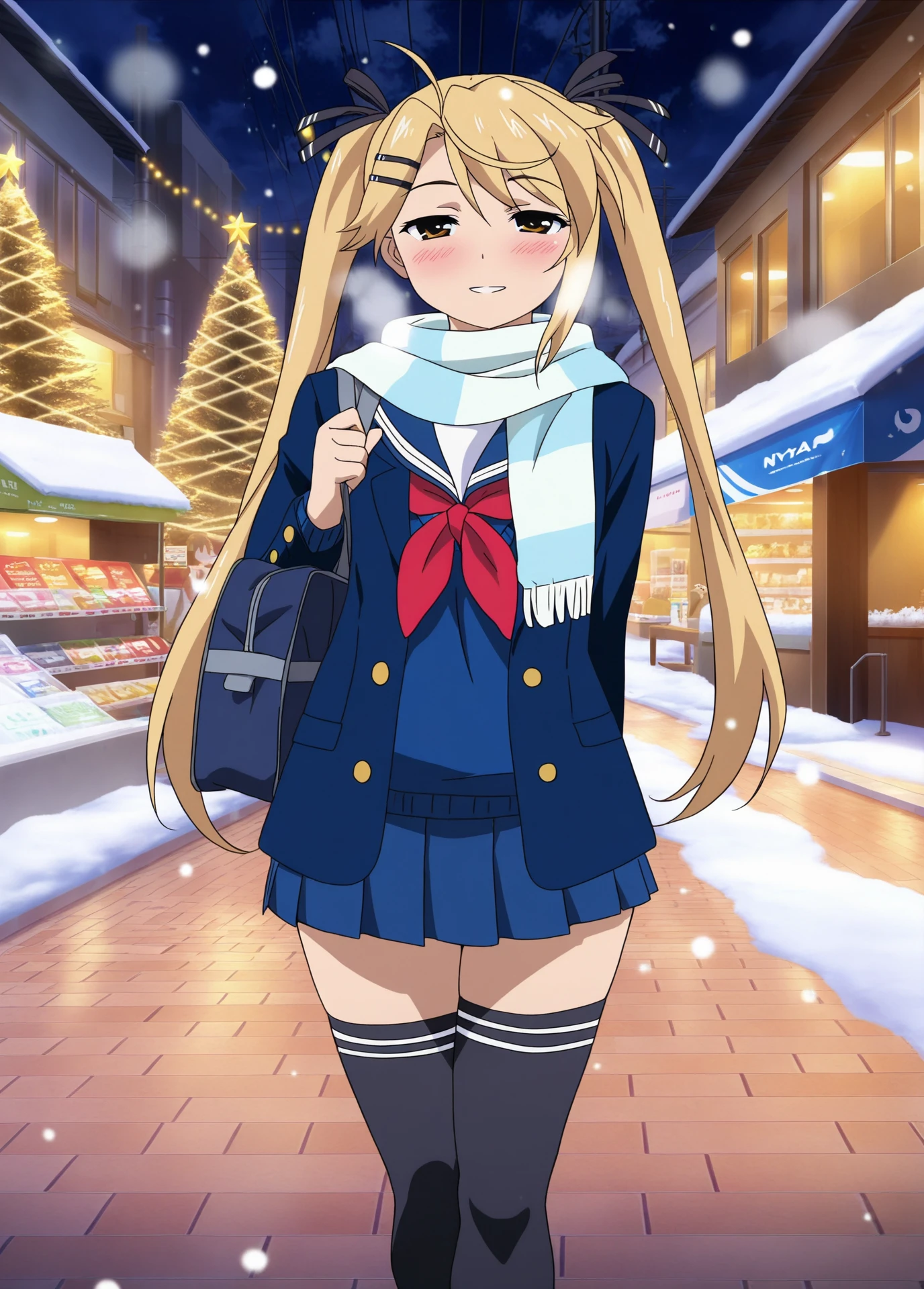 serafuku, miniskirt, zettai ryouiki, school uniform, black thighhighs, blue sweater, blue skirt, striped scarf, white black scarf, blue jacket, school bag,