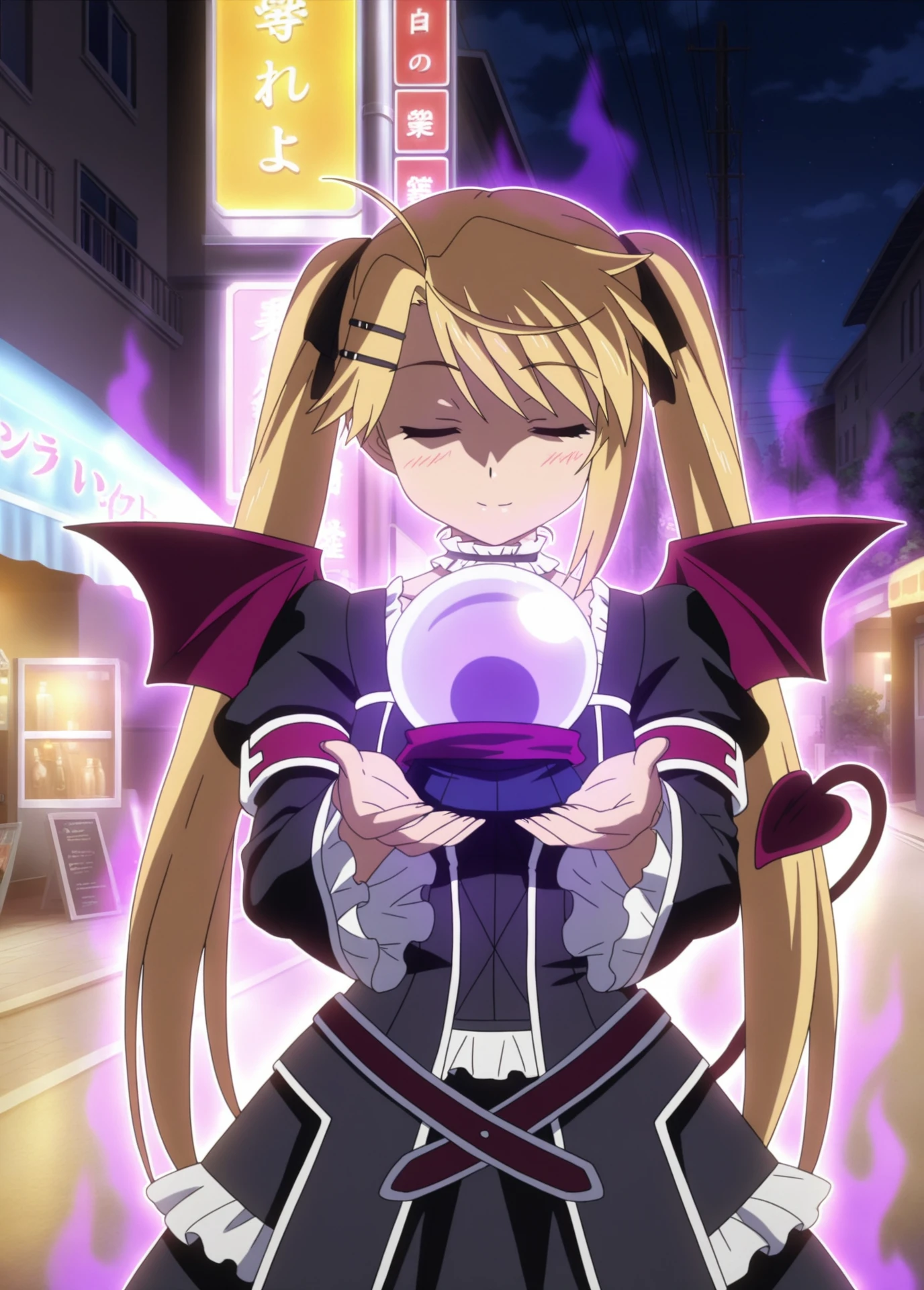 magical_girl_outfit, wings, bat wings, lolita fashion, gothic lolita, demon tail, black outfit, miniskirt, lolita fashion, gothic lolita, gothic, purple aura, orb, crystal ball, fortune teller,