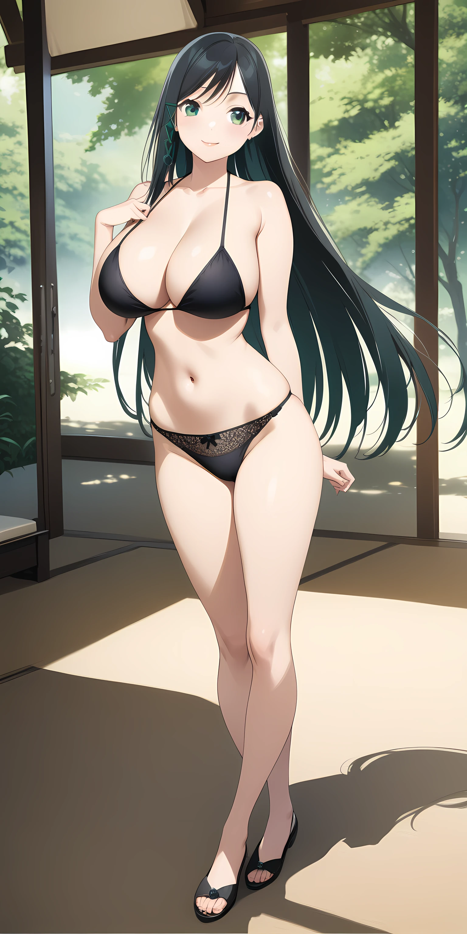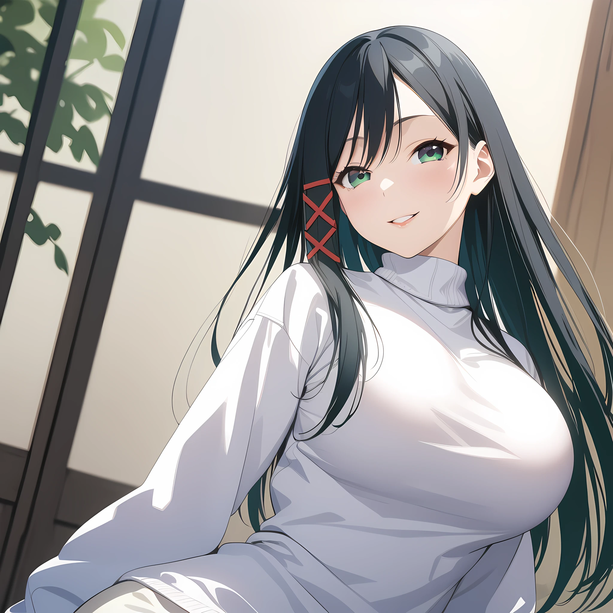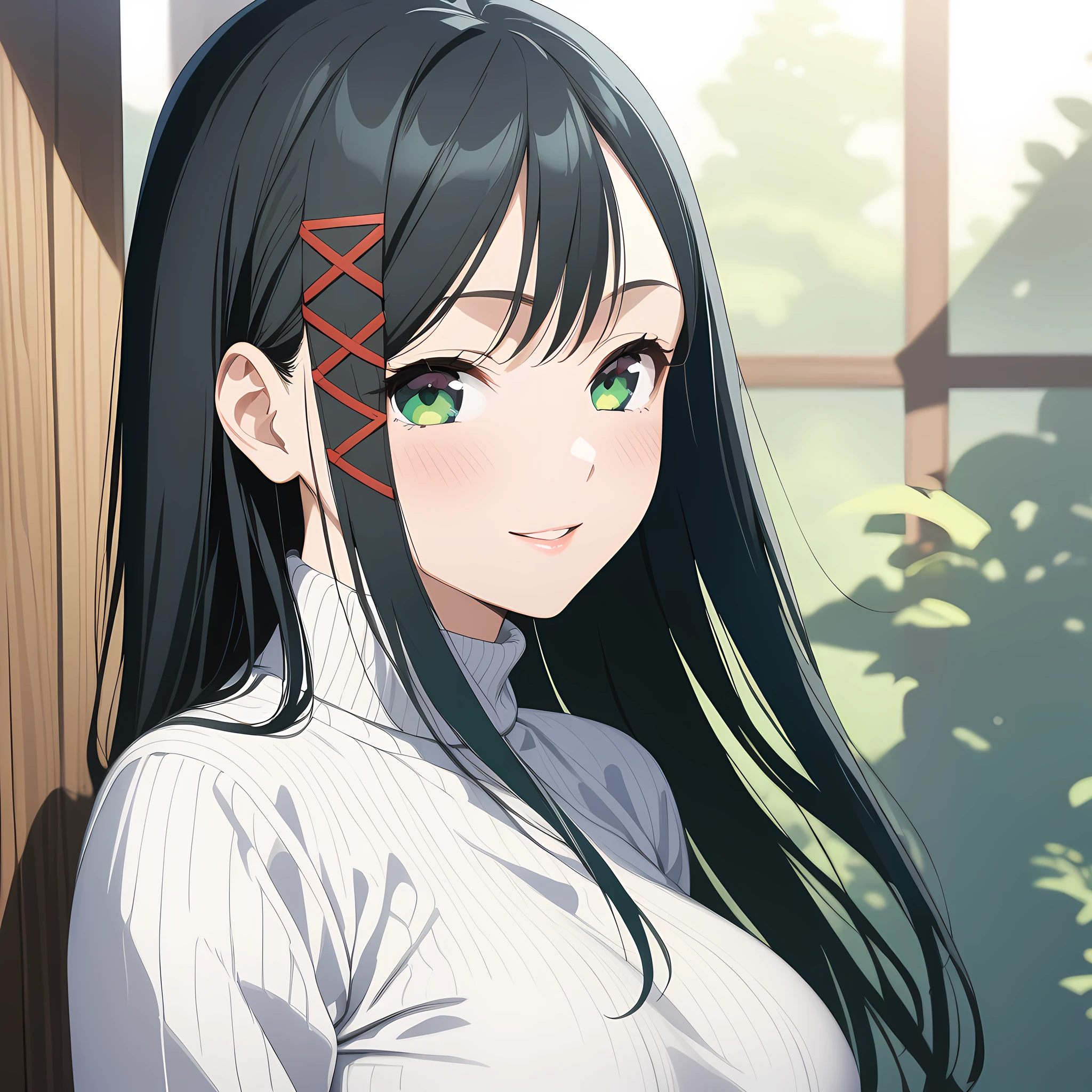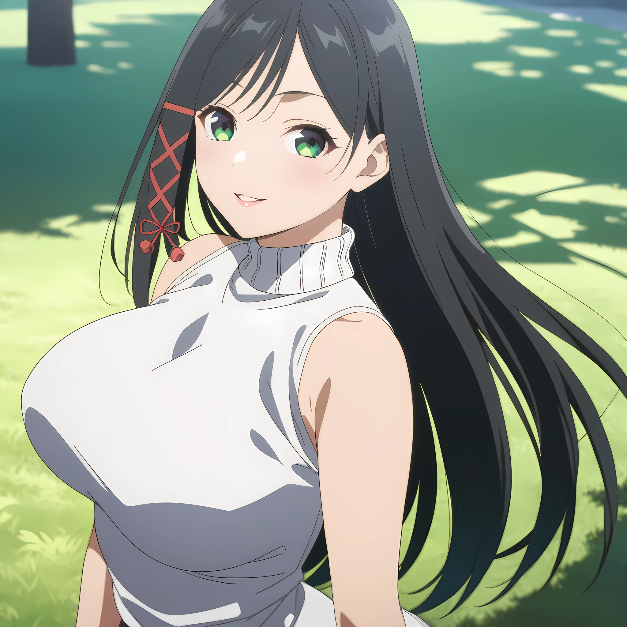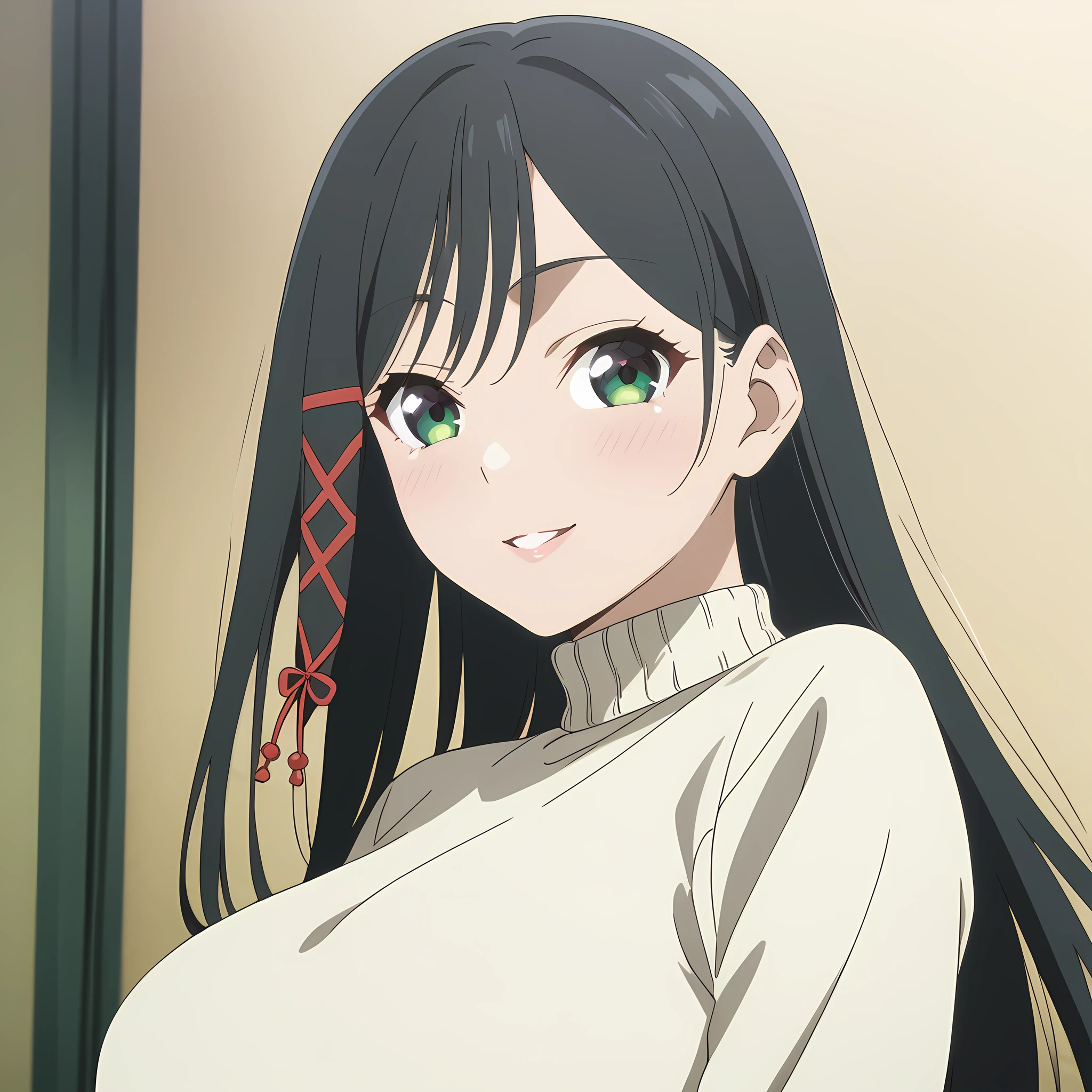 Activation tag is "amagami_yae, 1girl, green eyes, black hair, long hair, bangs, large breasts, red criss cross hair ornament,"