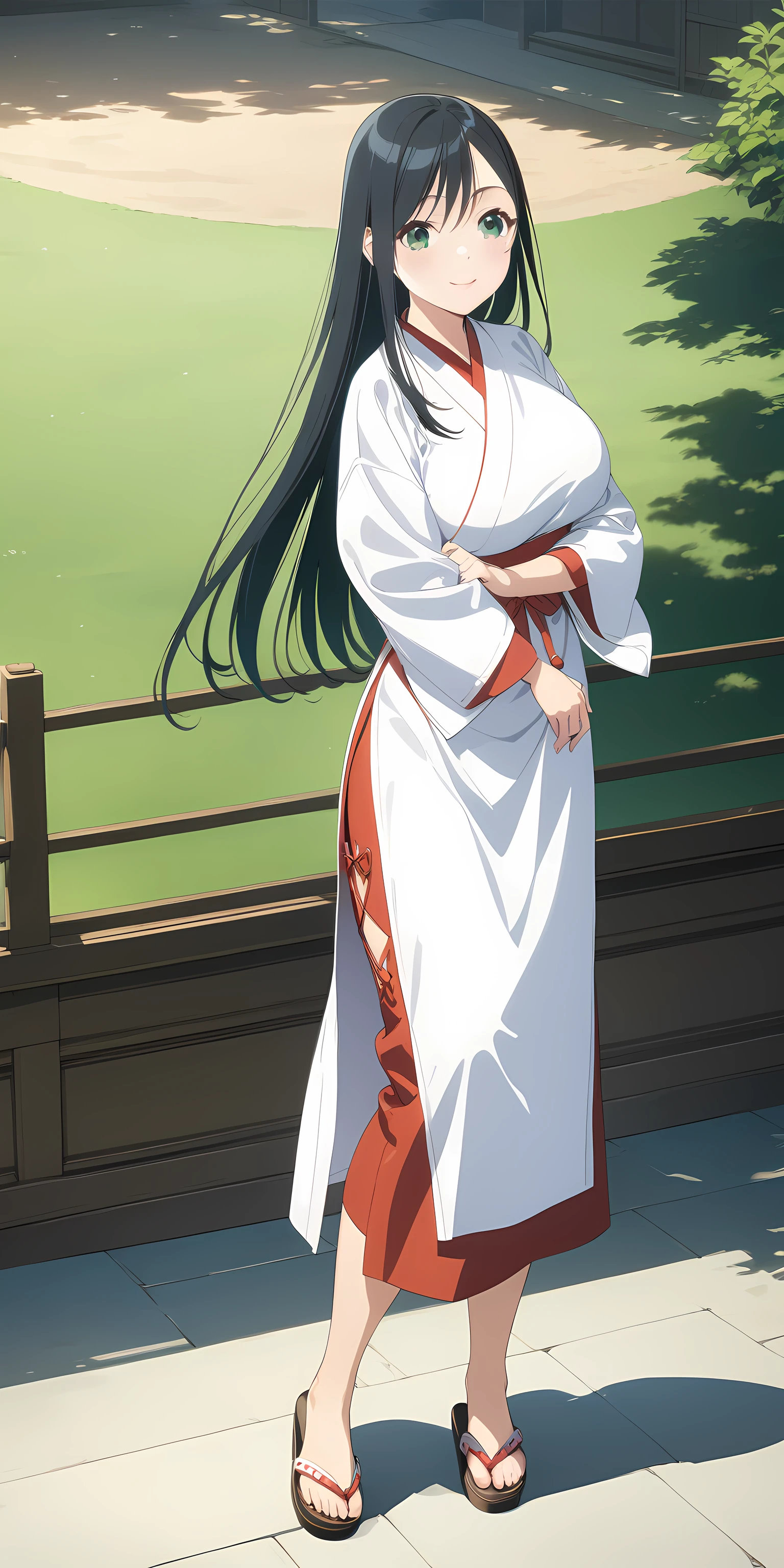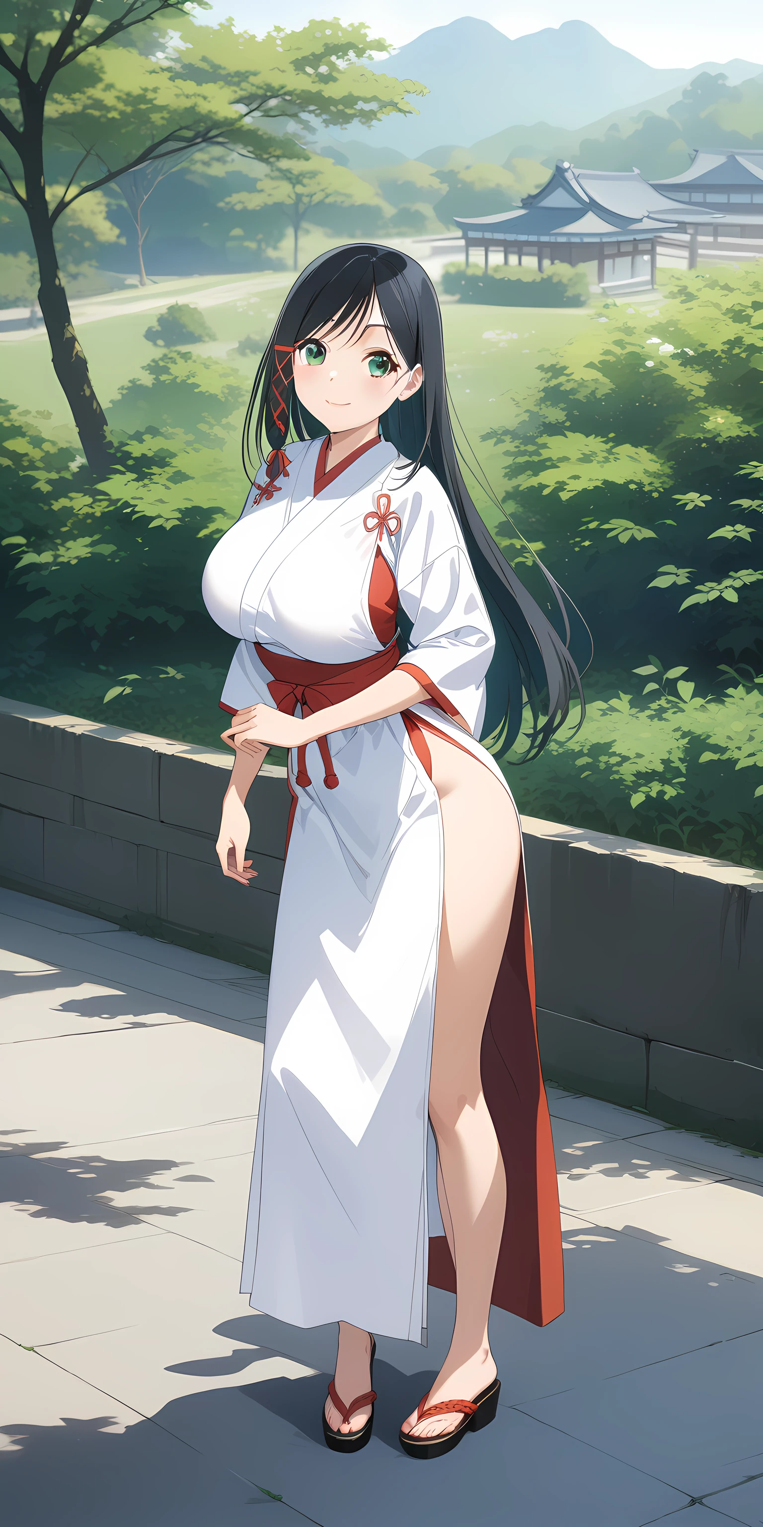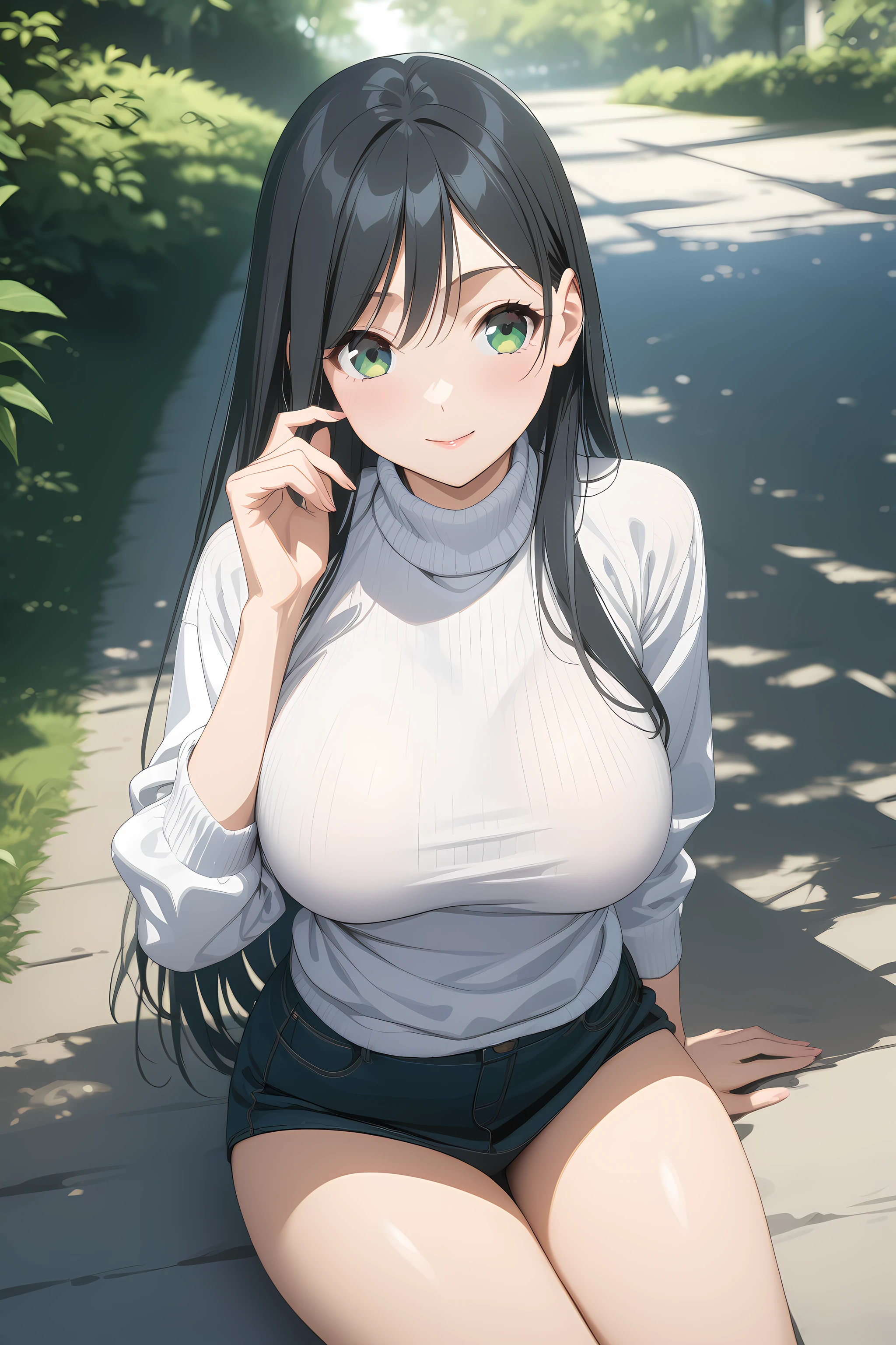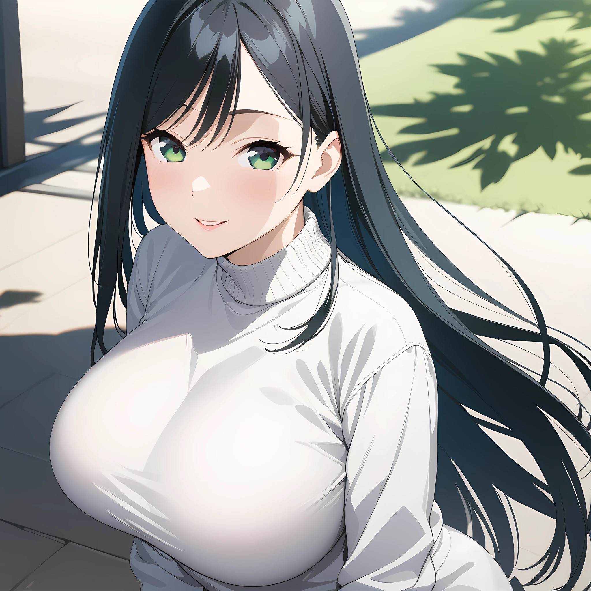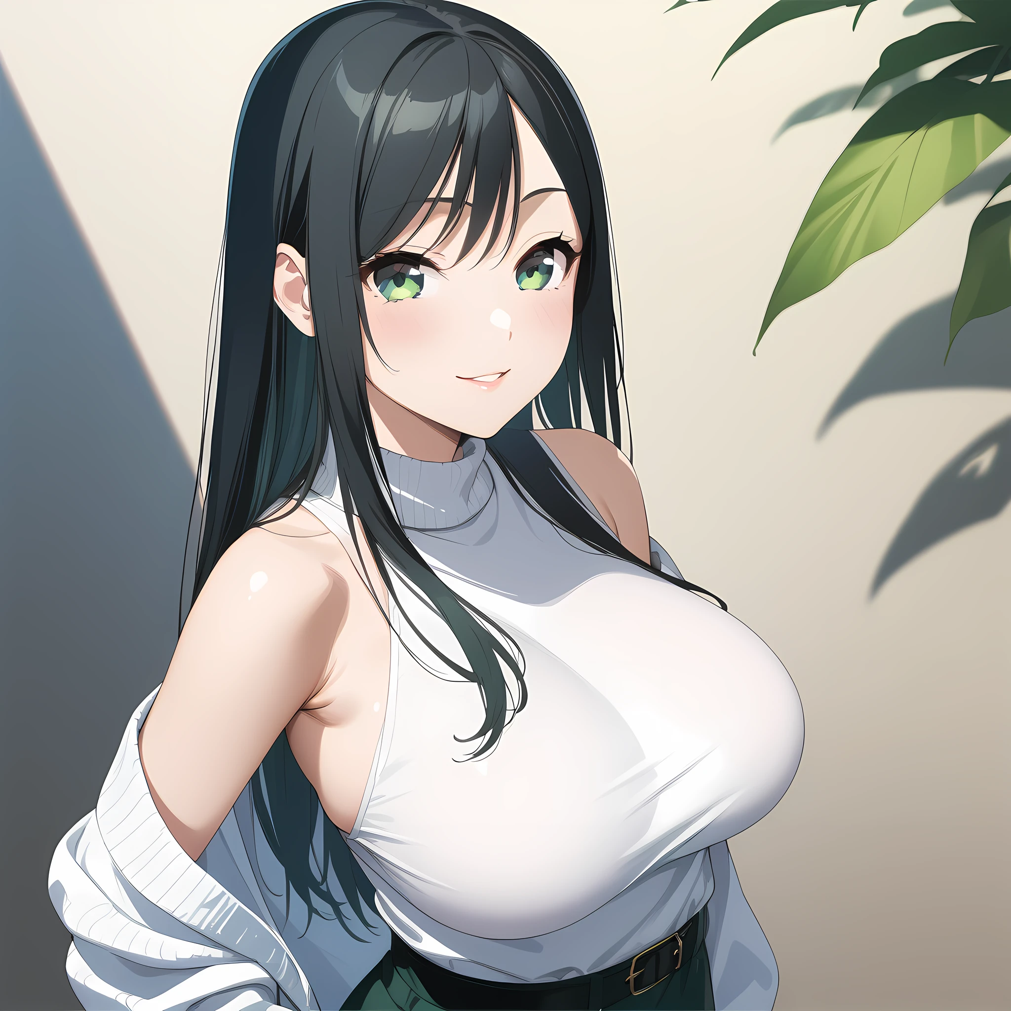 Activation tag is "amagami_yae, 1girl, green eyes, black hair, long hair, bangs, large breasts, red criss cross hair ornament,"