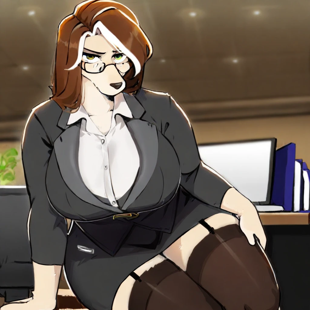 elysia ,elysa,furry,female dog,glasses,frown,curvy,large breasts,corkscrew tail,mature,white highlight,brown hair,yellow fur ,green eyes