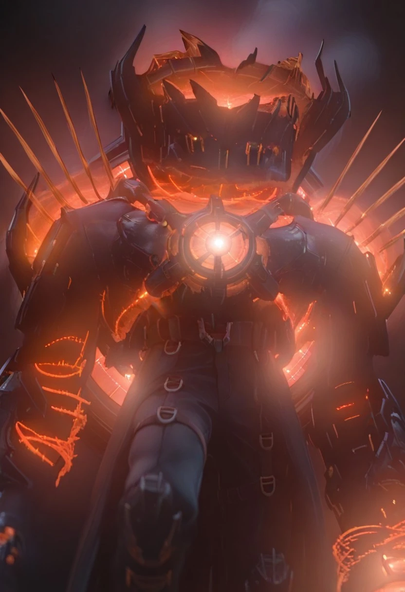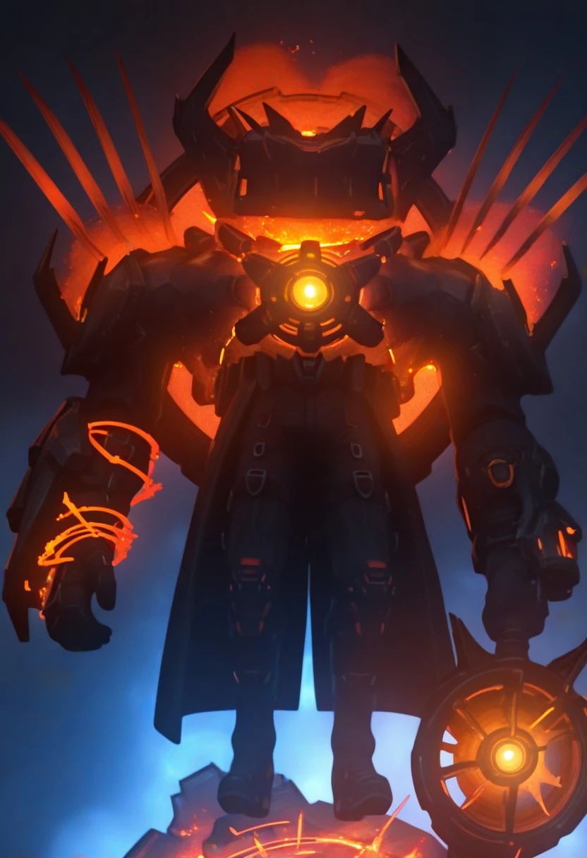 Watchman Of Doom, robot, black metal skin, rectangle head, no face, black horns, triple-bladed claws on shoulders, glowing orange core, giant orange propulsor on back, black trench coat, black pants, black boots, holding glowing orange sword, cannon attached to one arm